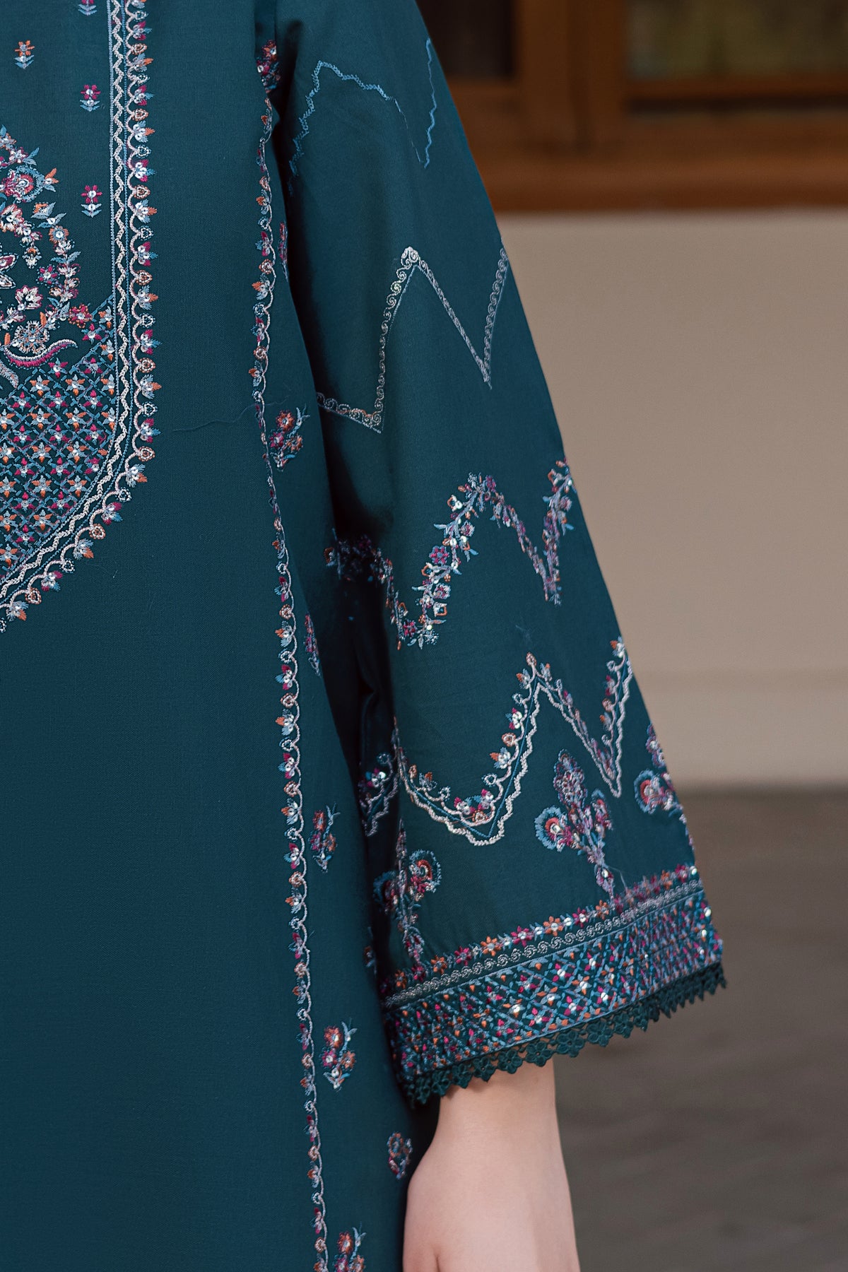 This teal colored fully embroidered khaddar shirt is designed with detailed craftsmanship, creating a refined yet easy to wear look. The embroidery adds texture while keeping the silhouette clean and balanced.