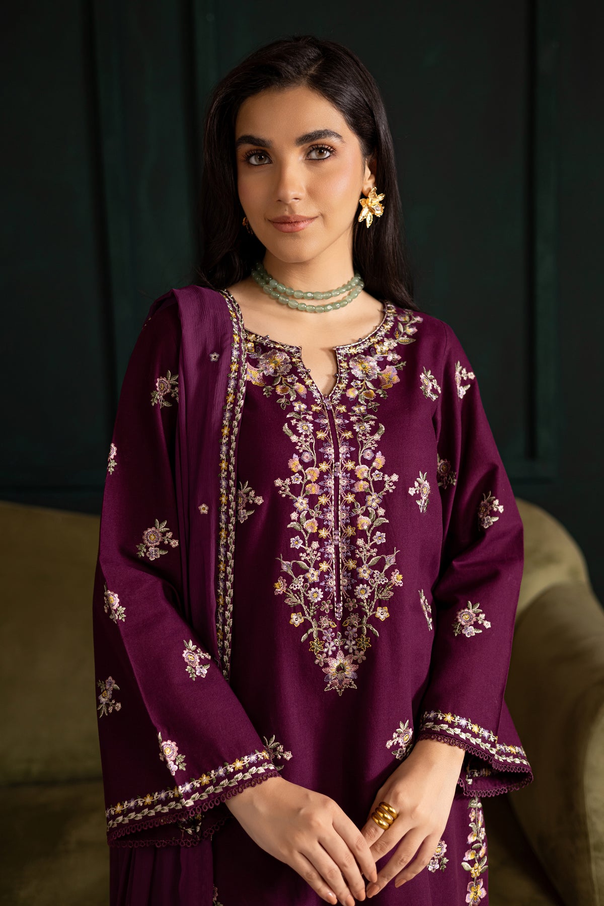 Experience classic charm with the Prune three-piece magenta khaddar set, featuring a shirt with a heavily embroidered neckline and composed hem detailed with side chalks and an elegant embroidery spread. The sleeves are beautifully embroidered with matching borders, adding a graceful touch.