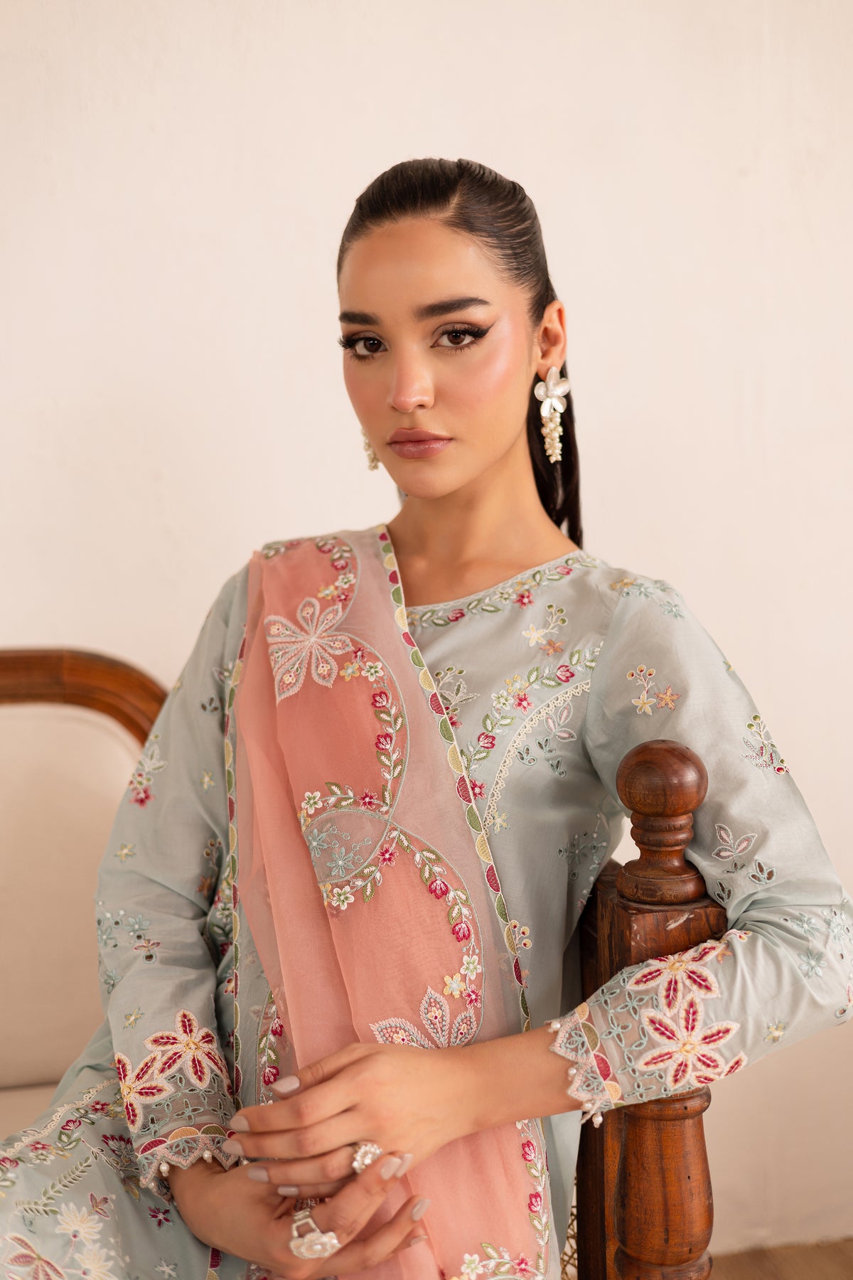 The look is completed with a beautifully embroidered organza dupatta, adding an ethereal and refined finish to the outfit.