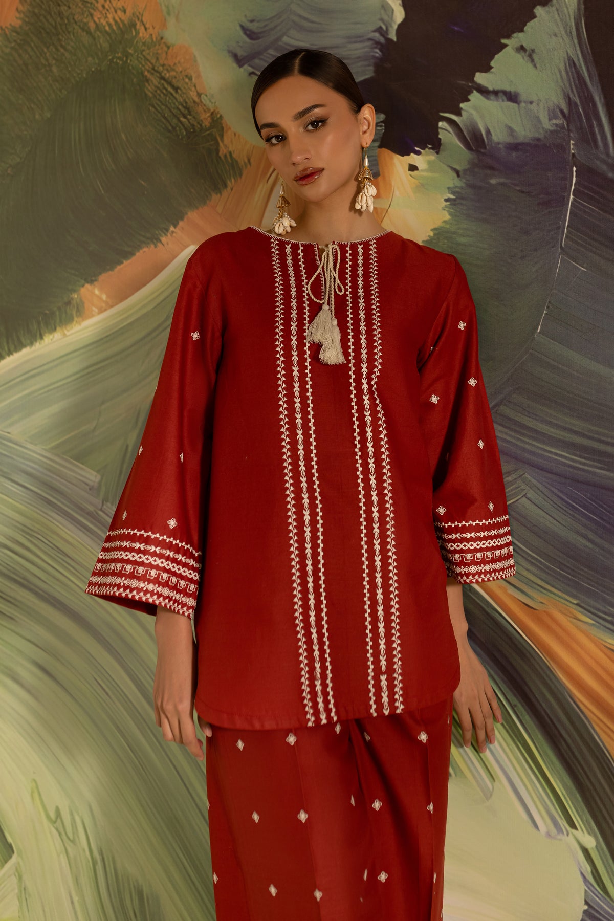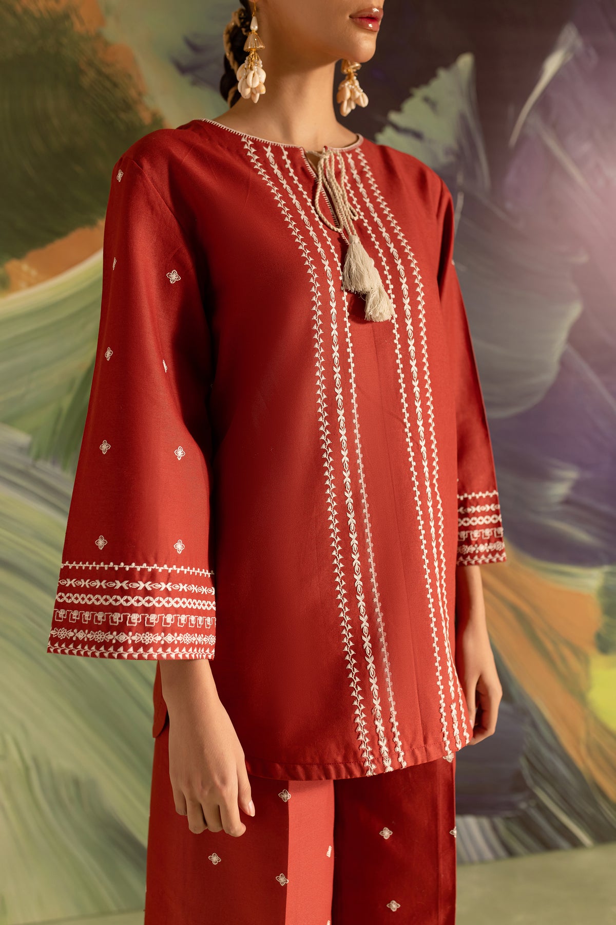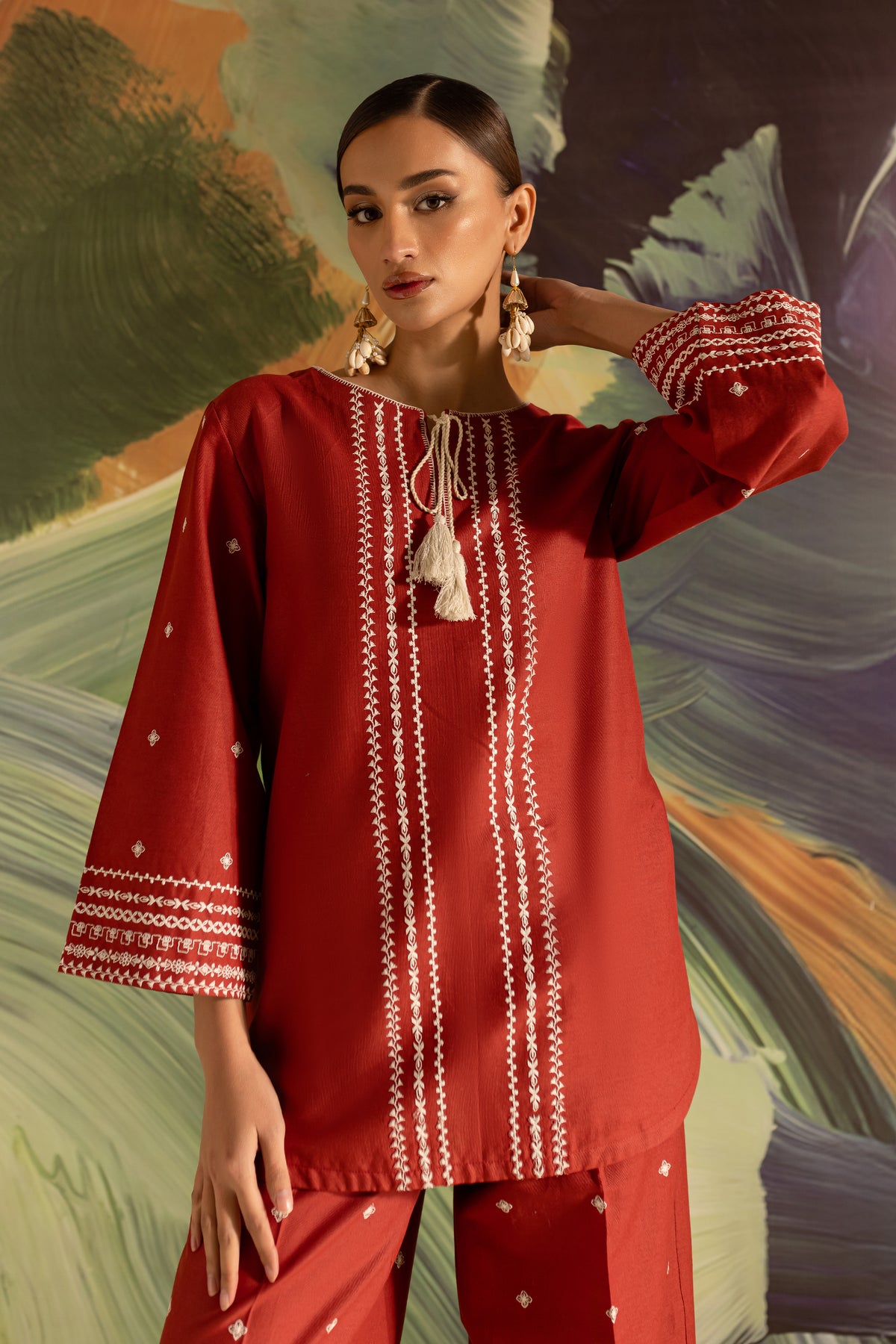 This two-piece rust khaddar set offers a stylish, contemporary look with a touch of intricate detailing. The short shirt is designed with embroidered accents along the midsection and features a classic crew neckline. The neckline is finished with delicate tassels, adding a playful element to the design.