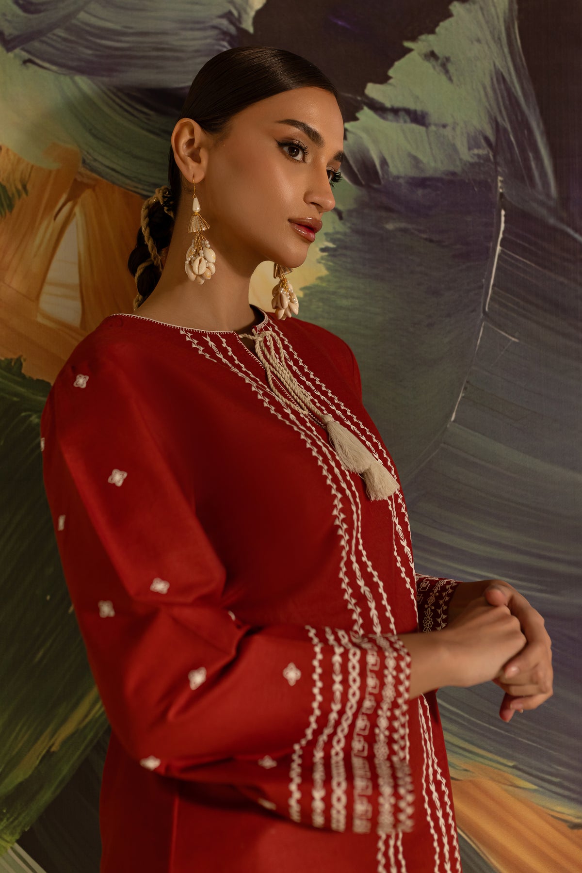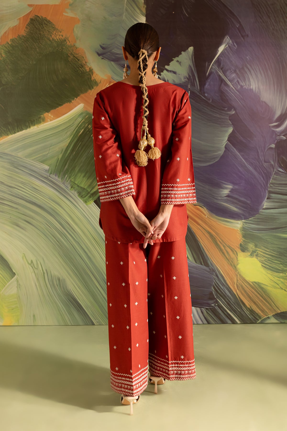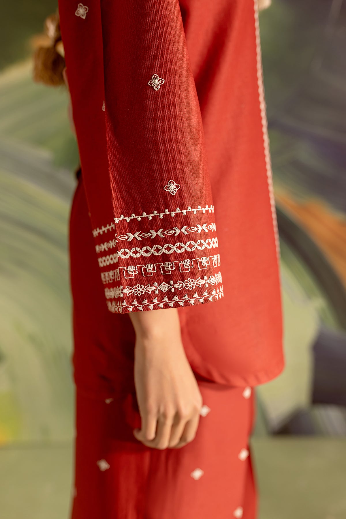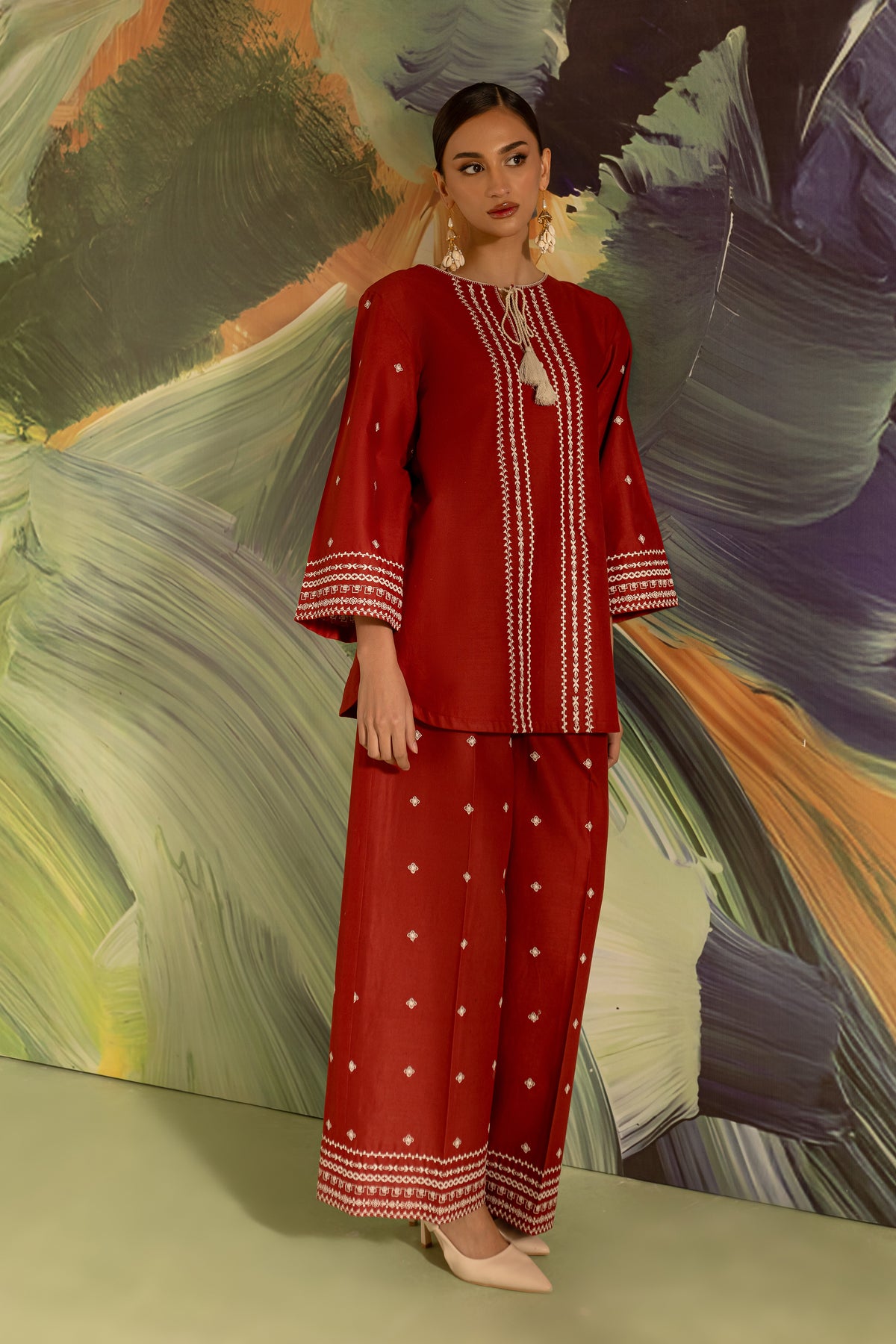 This two-piece rust khaddar set offers a stylish, contemporary look with a touch of intricate detailing. The short shirt is designed with embroidered accents along the midsection and features a classic crew neckline. The neckline is finished with delicate tassels, adding a playful element to the design.