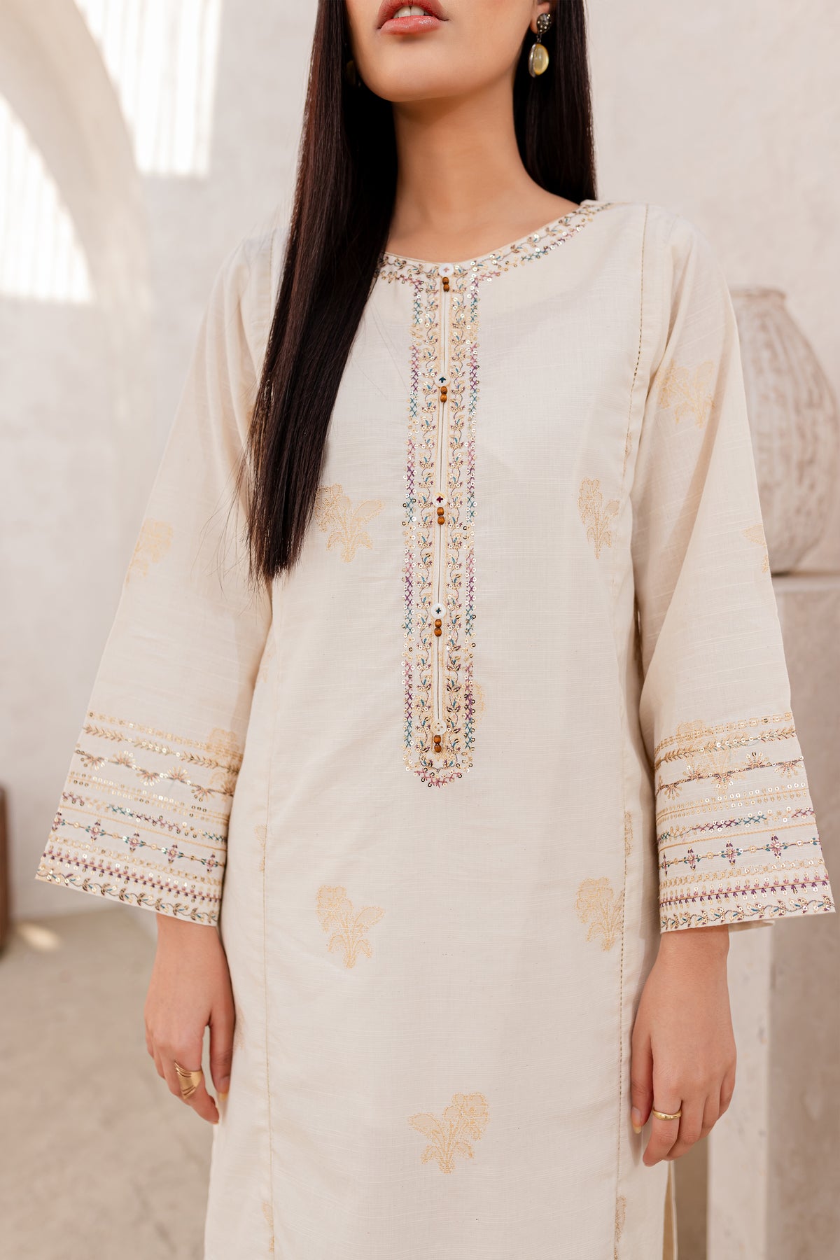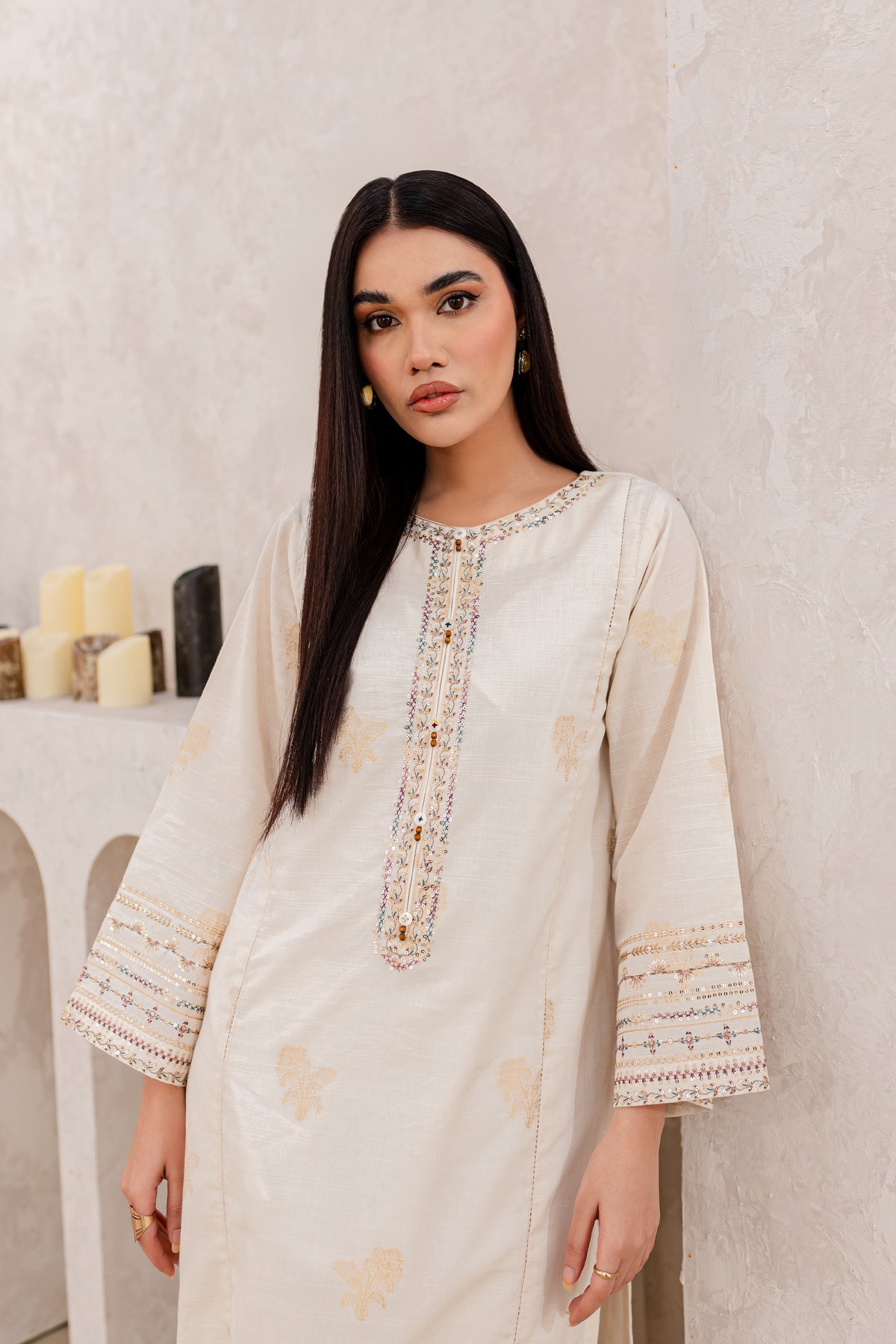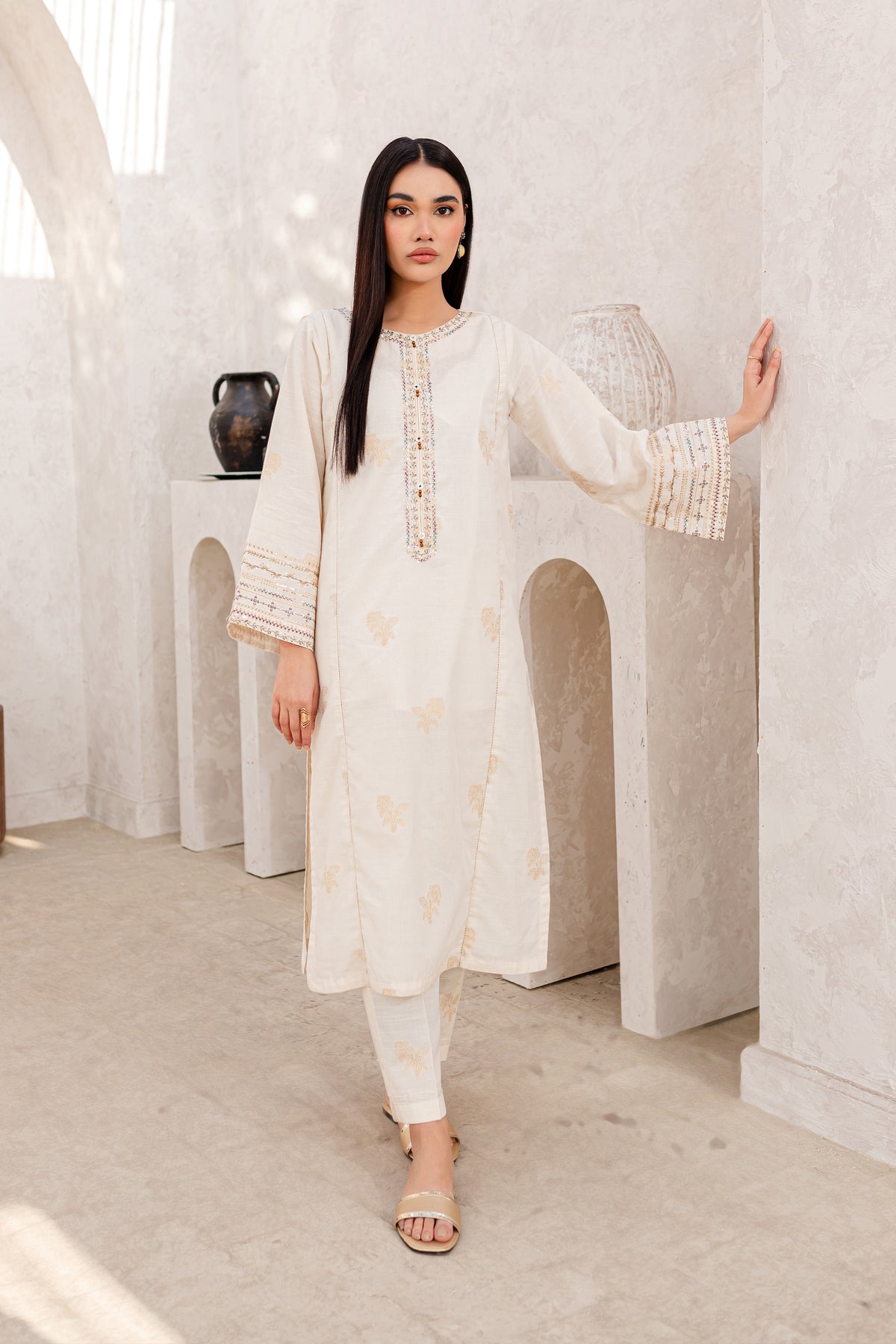 Experience an unparalleled comfort with finely woven yarn-dyed jacquard in the shades of off-white. Beautifully designed paneled shirt features an embroidered neckline with button embellishments. Loose fit sleeves are adorned with intricately embroidered borders.