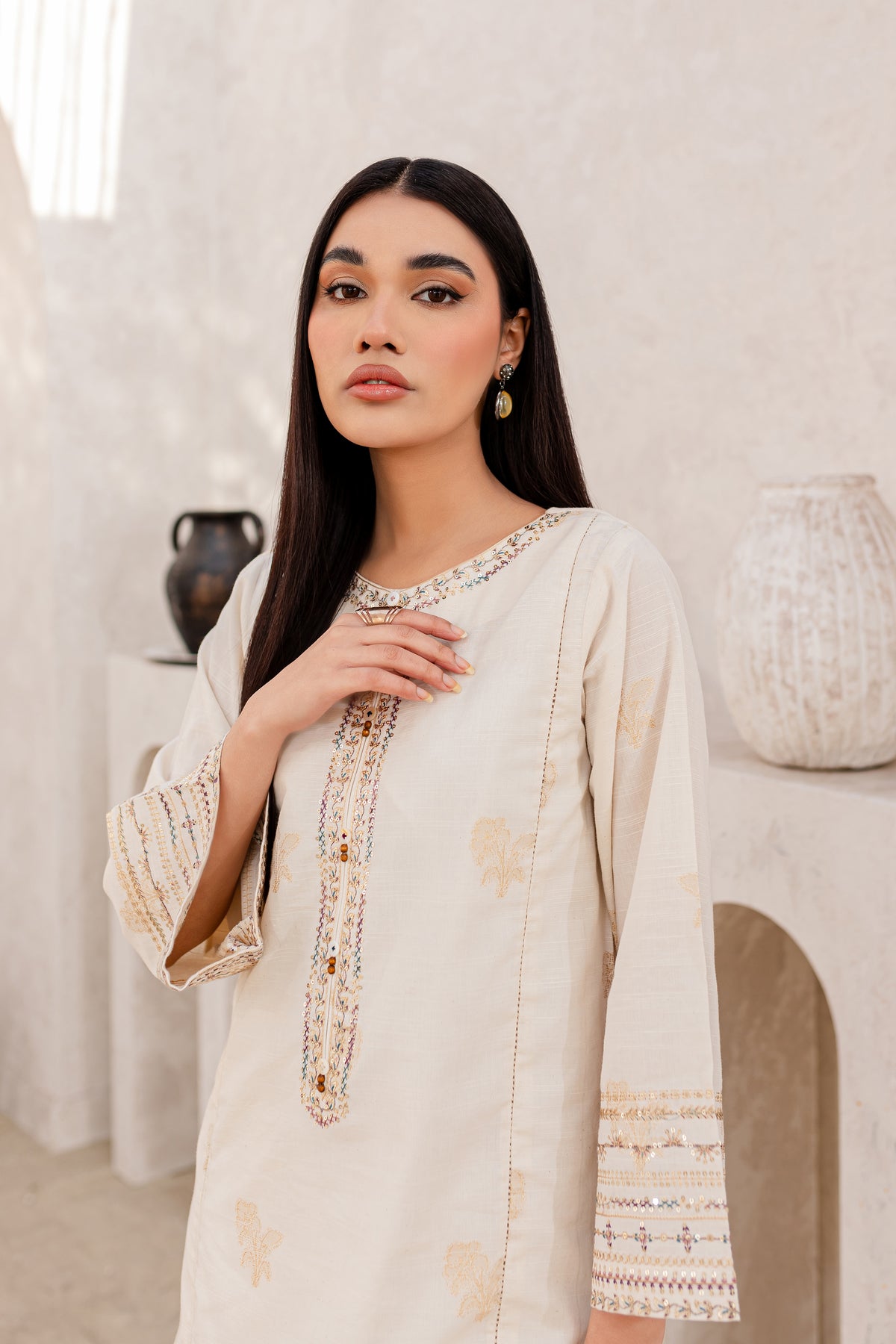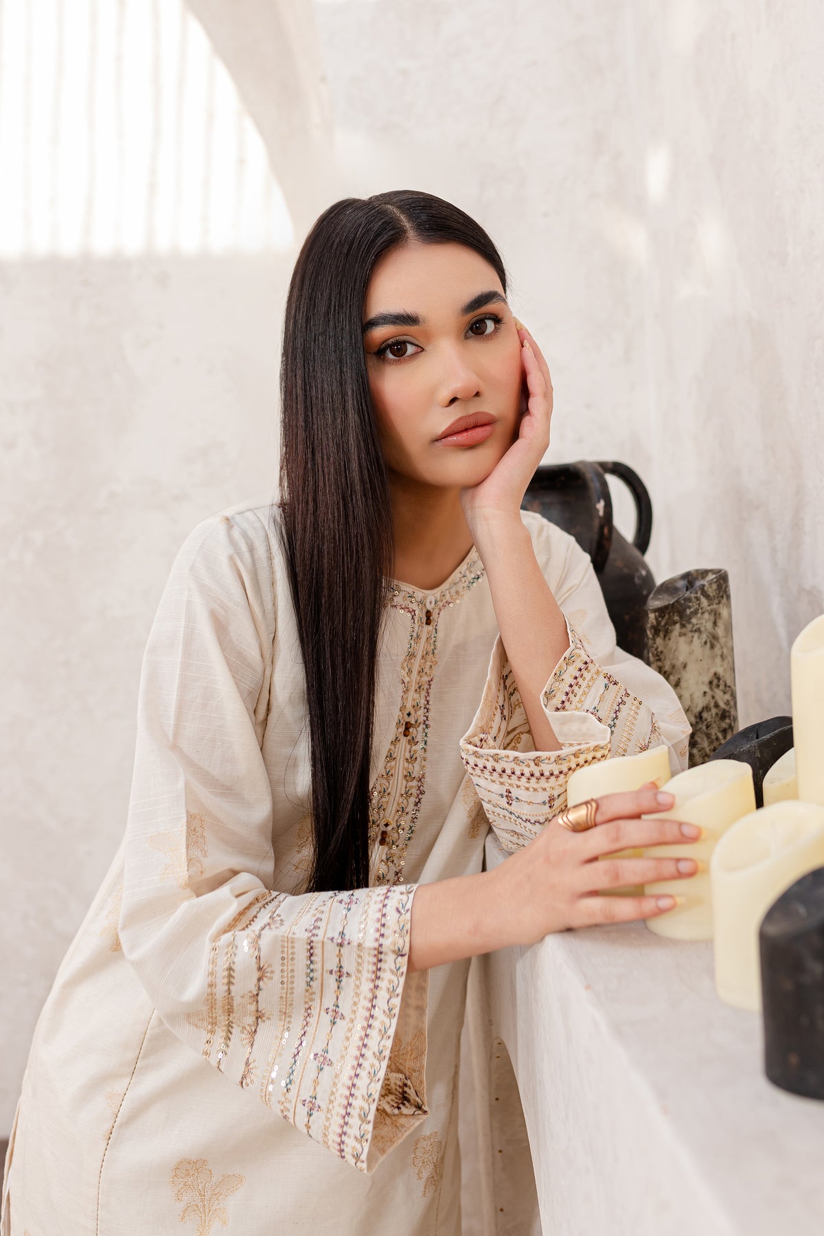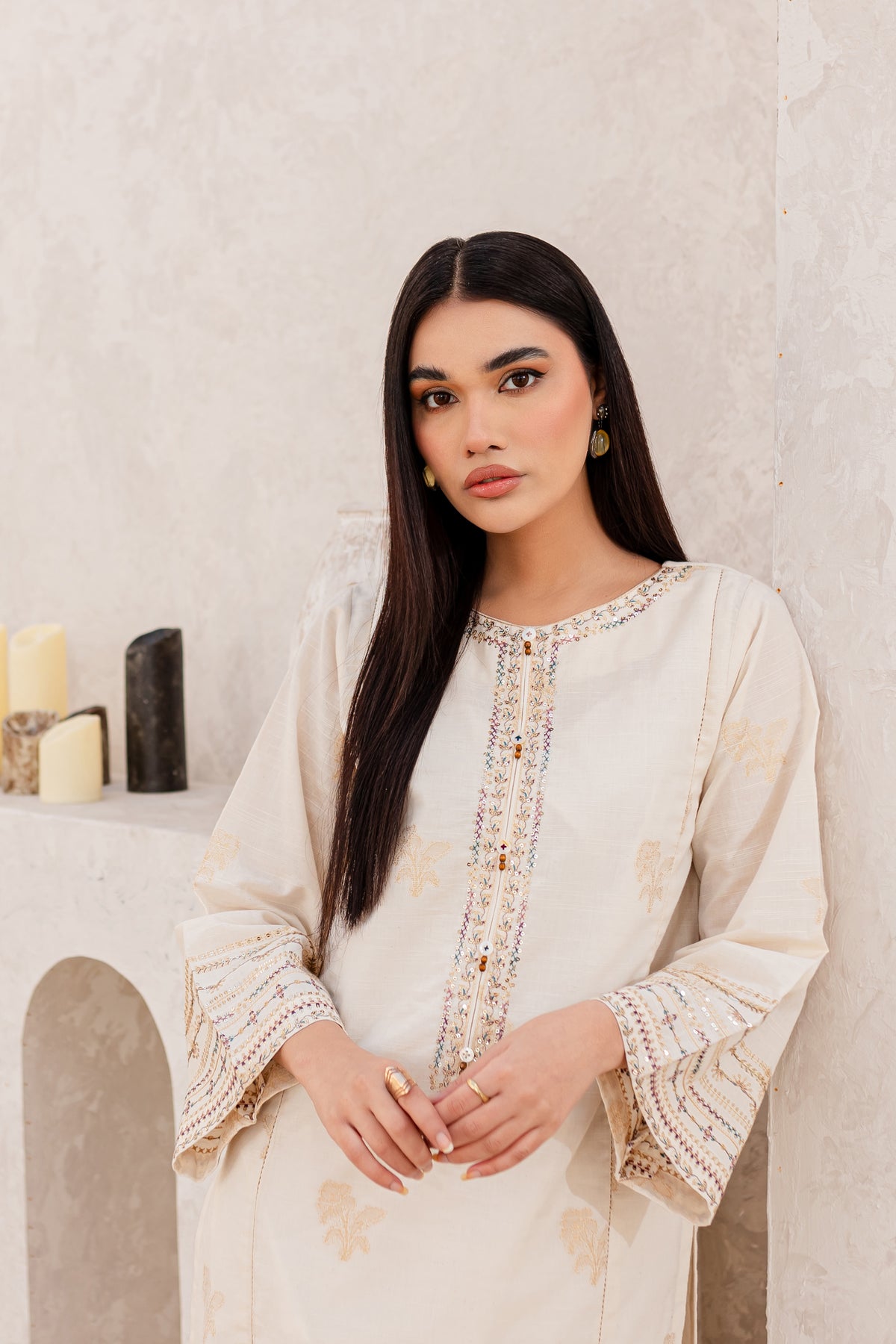 Experience an unparalleled comfort with finely woven yarn-dyed jacquard in the shades of off-white. Beautifully designed paneled shirt features an embroidered neckline with button embellishments. Loose fit sleeves are adorned with intricately embroidered borders.