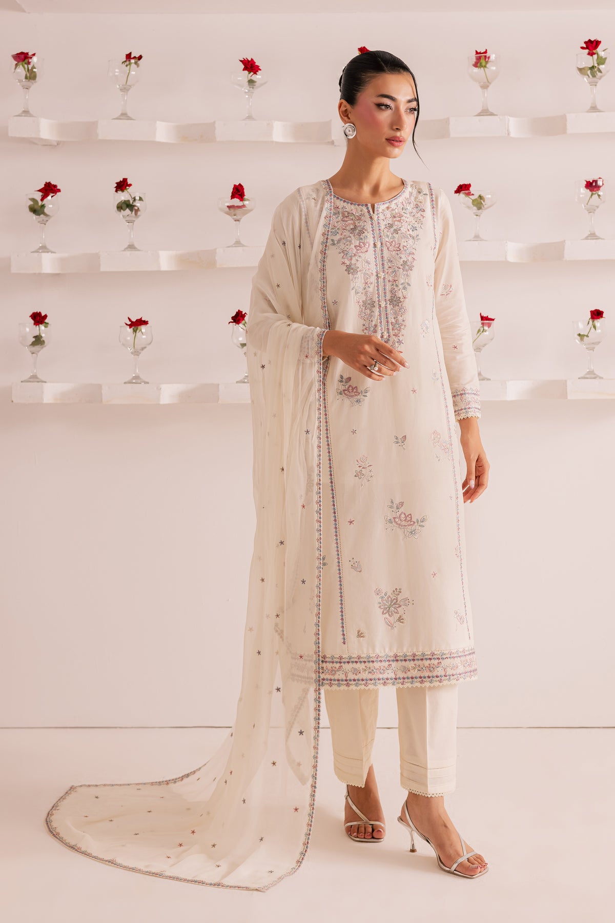 An elegant off-white 3-piece pima lawn ensemble featuring a beautifully panelled shirt adorned with intricate embroidery, highlighted by a heavily embroidered neckline. The shirt hem is accentuated with embroidered organza, delicately connected with serhi lace, while both the shirt and sleeve hems are finished with subtle lace detailing for a refined touch.