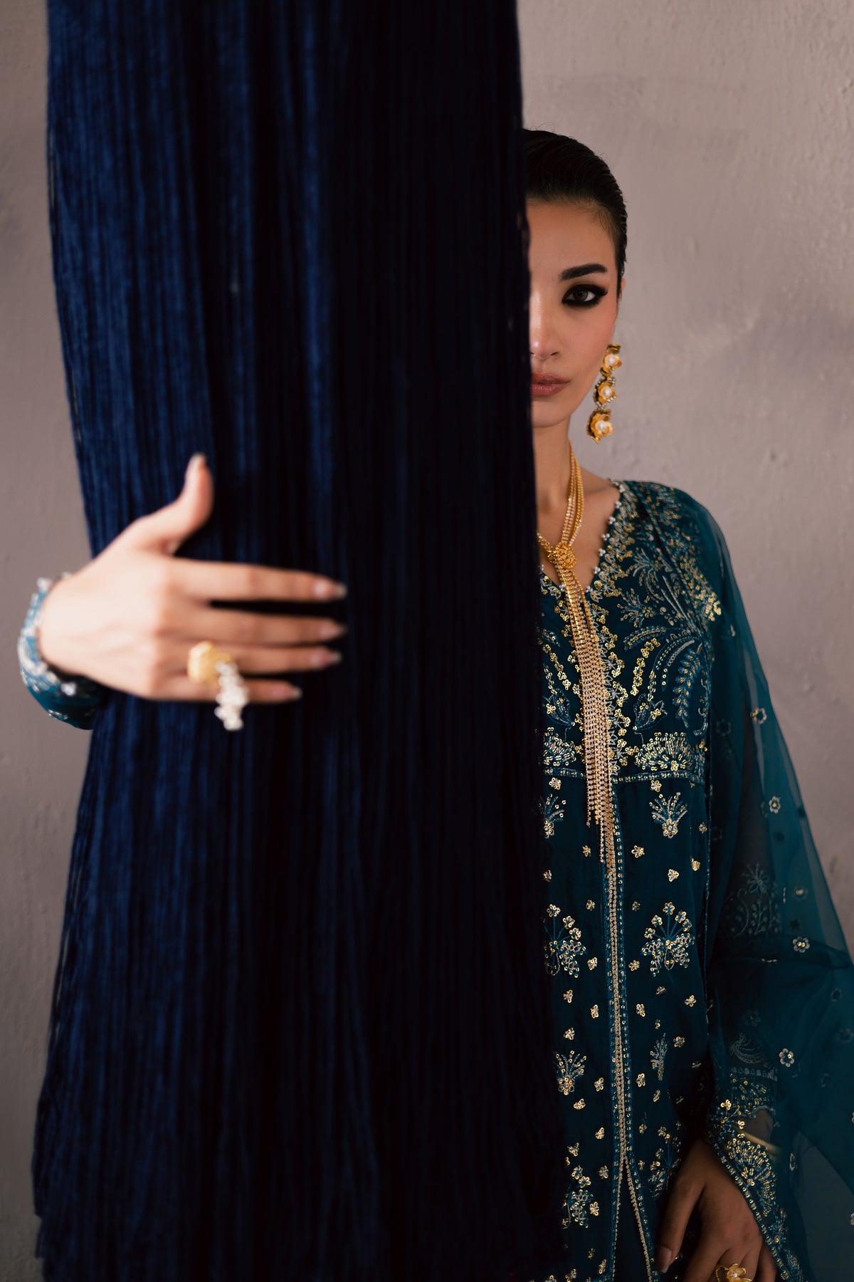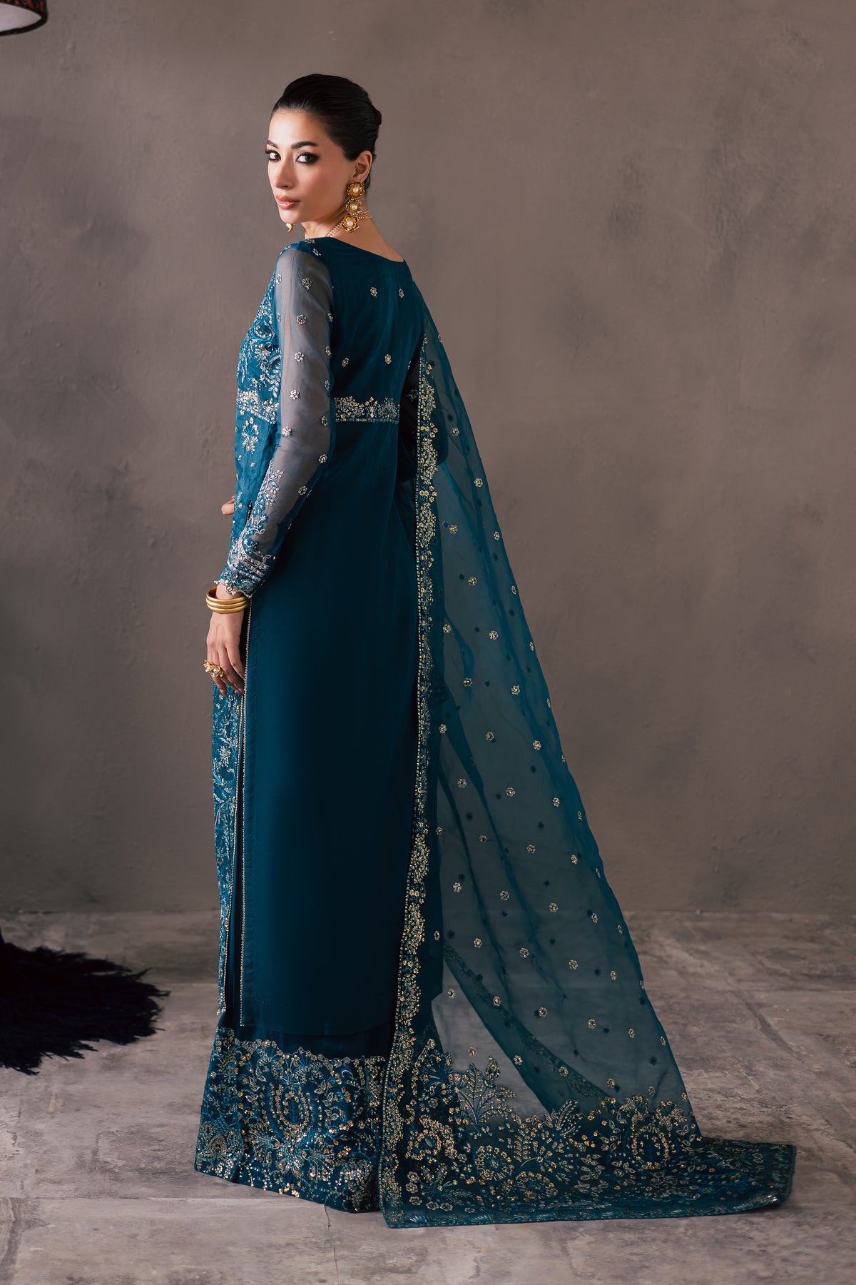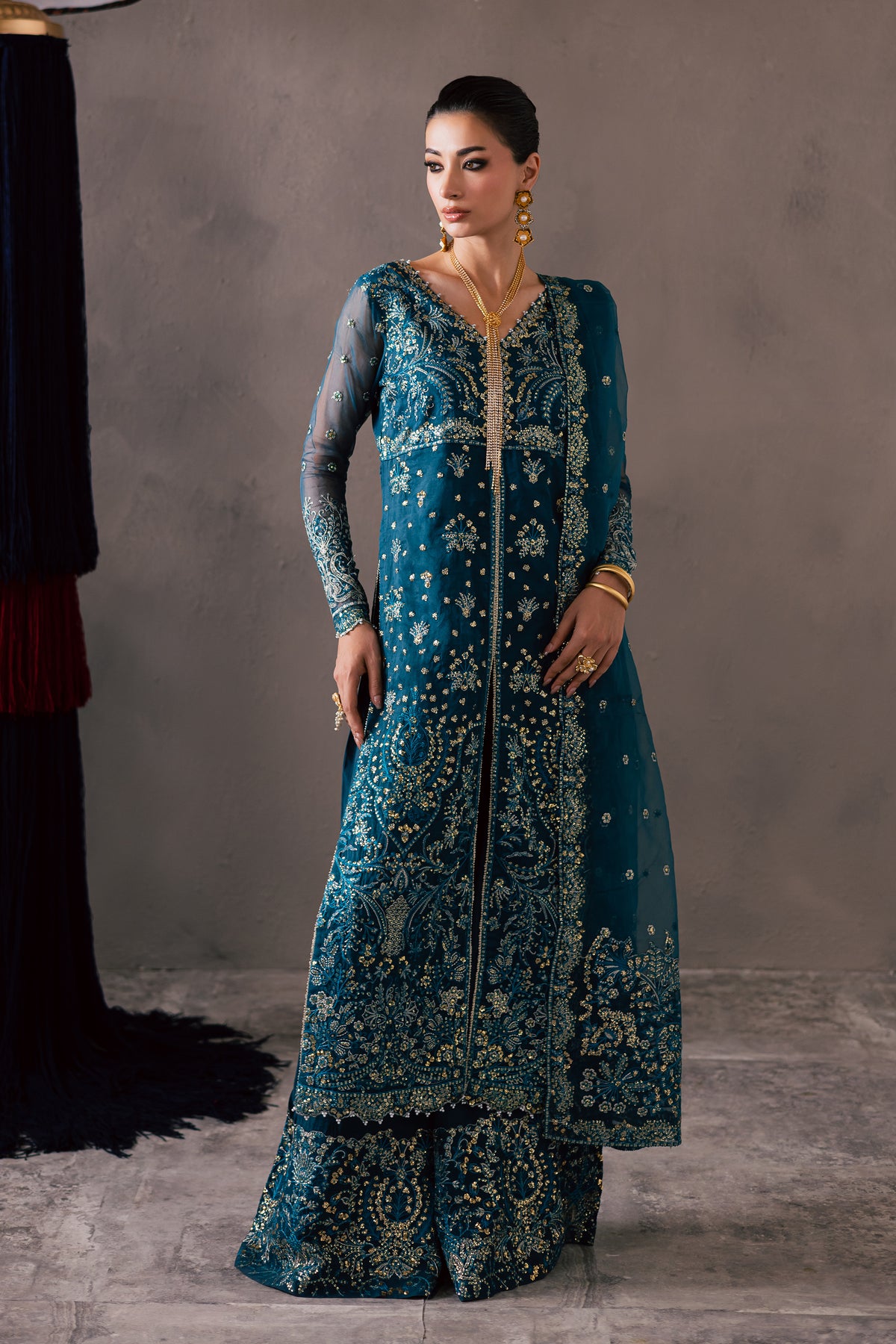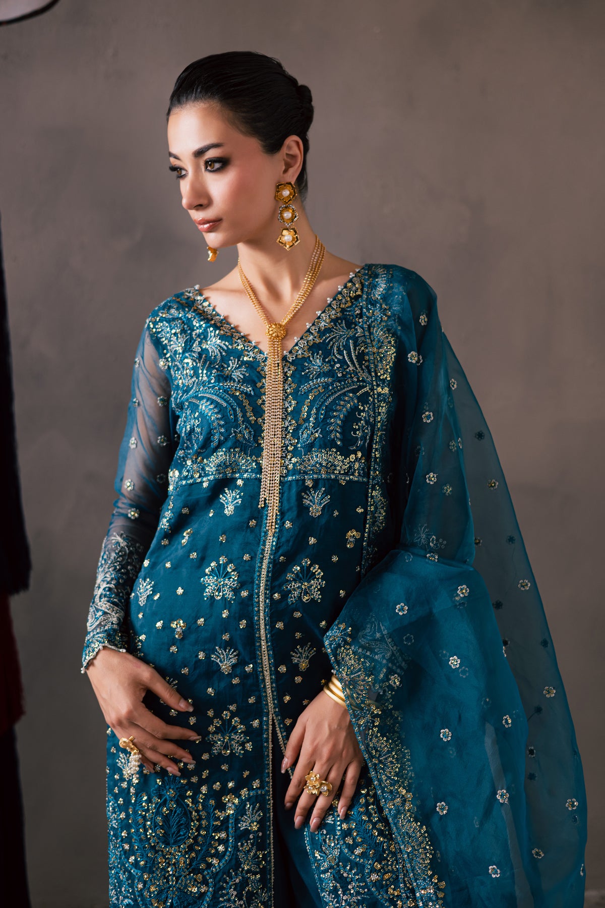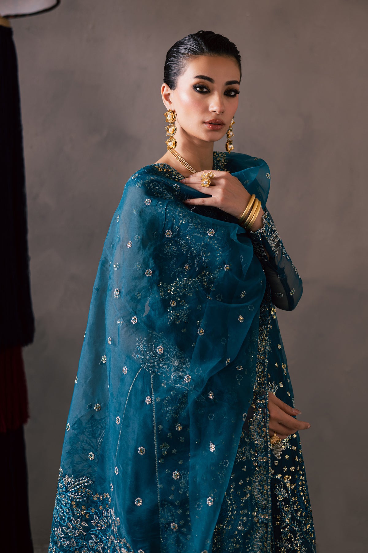 An intricately embroidered organza dupatta completes the look, enhancing its elegance with delicate craftsmanship and graceful drape.