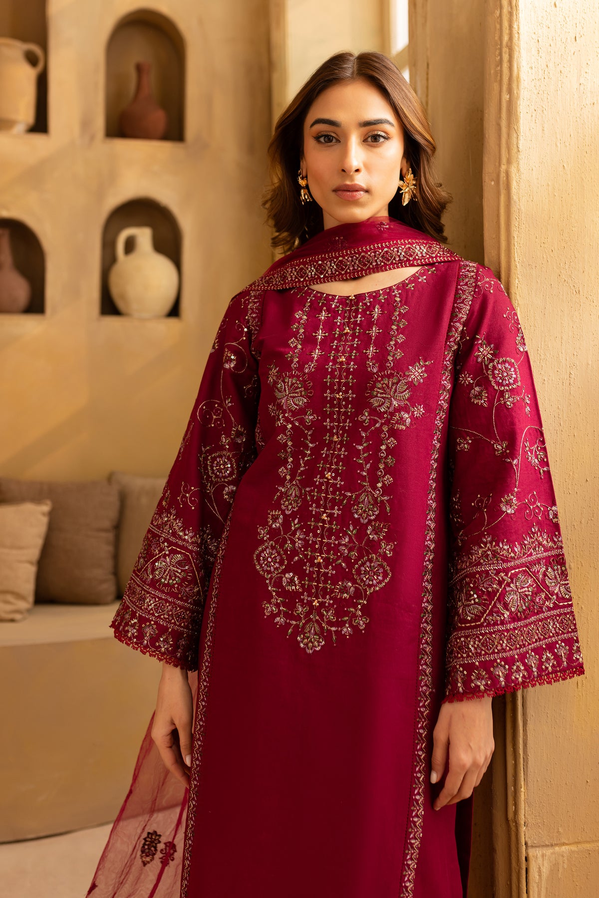 This stunning burgundy khaddar long-paneled shirt features a beautifully embroidered neckline on the front, creating a focal point of intricate craftsmanship. The shirt is further adorned with an embroidered border along the hem, adding a touch of refinement. Embroidered spreads on the side panels enhance the design with subtle elegance, while the flared sleeves, embellished with embroidered spreads and borders, add a graceful finish.