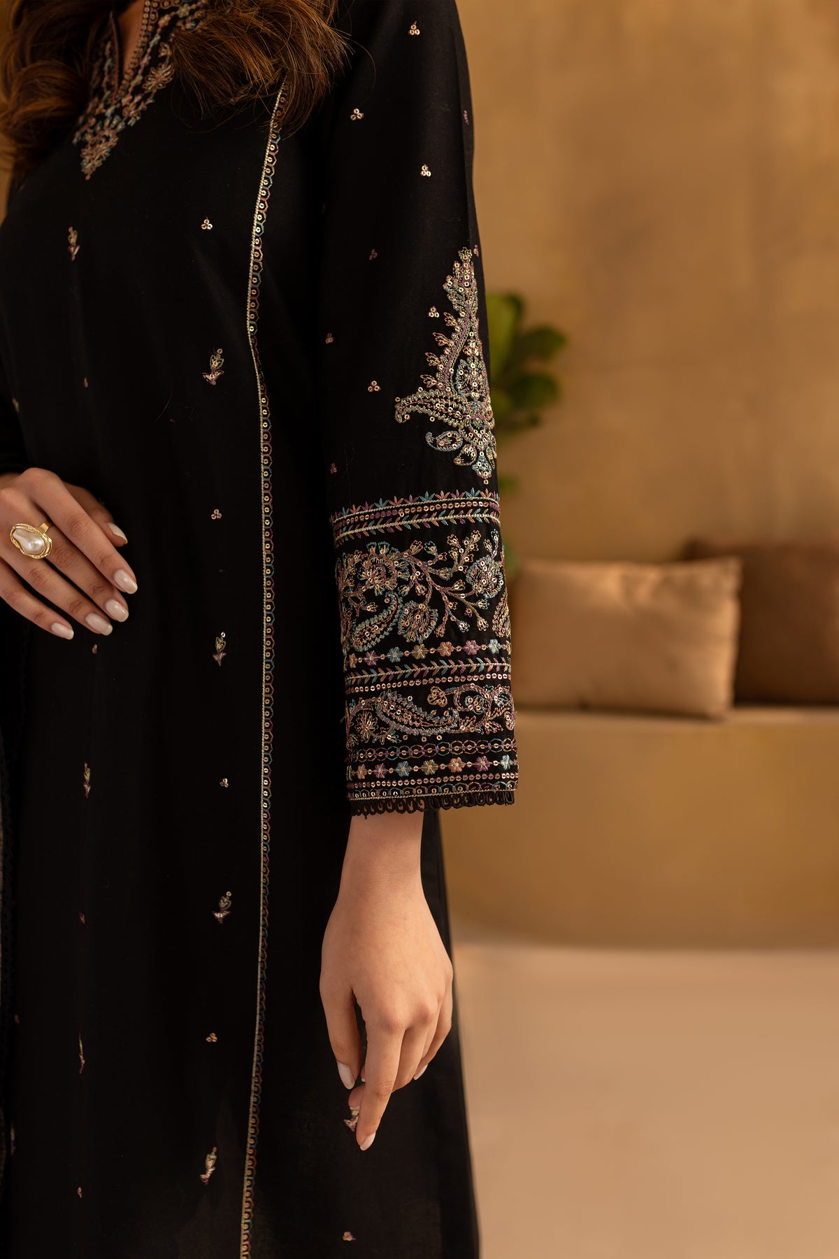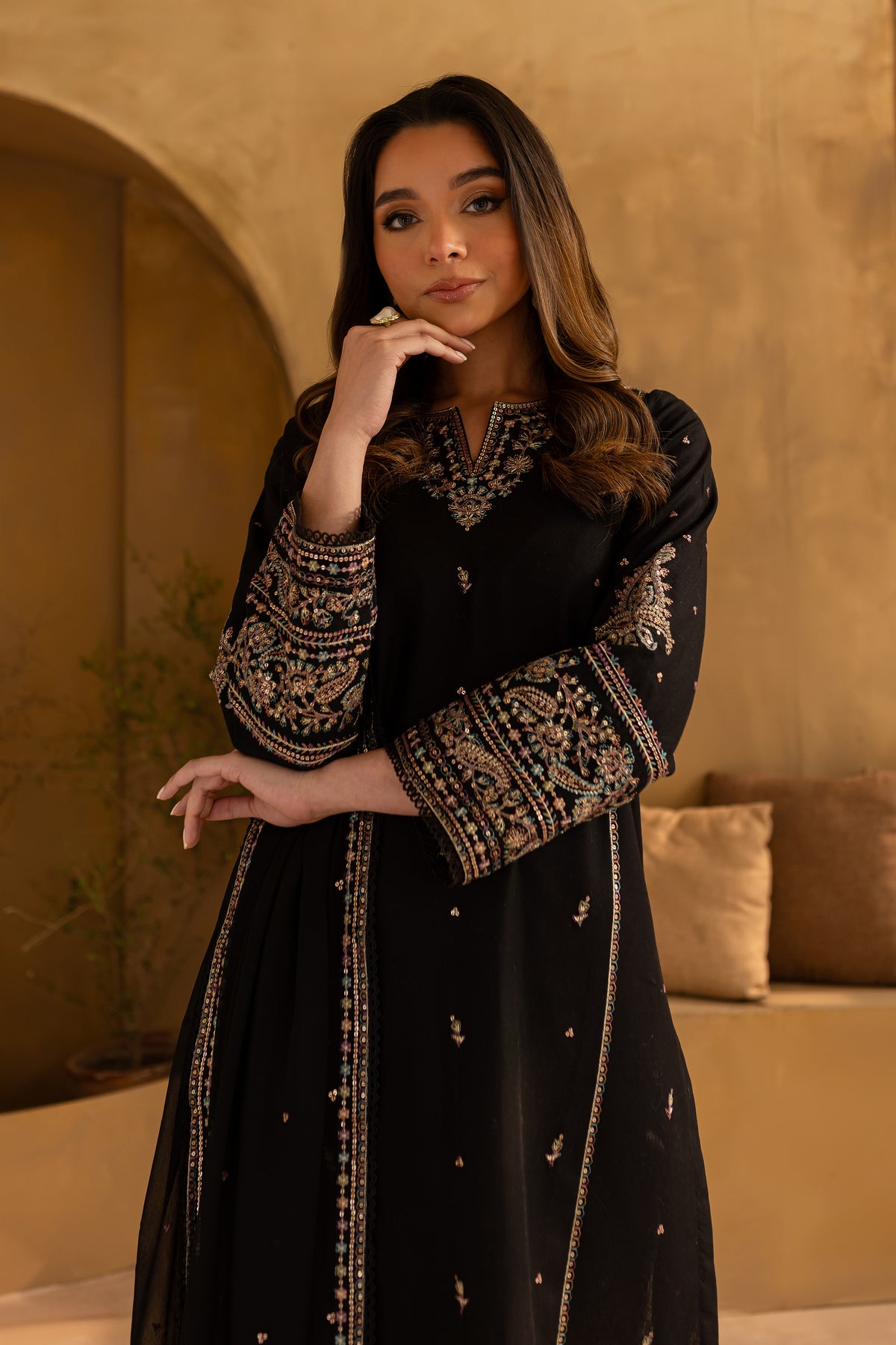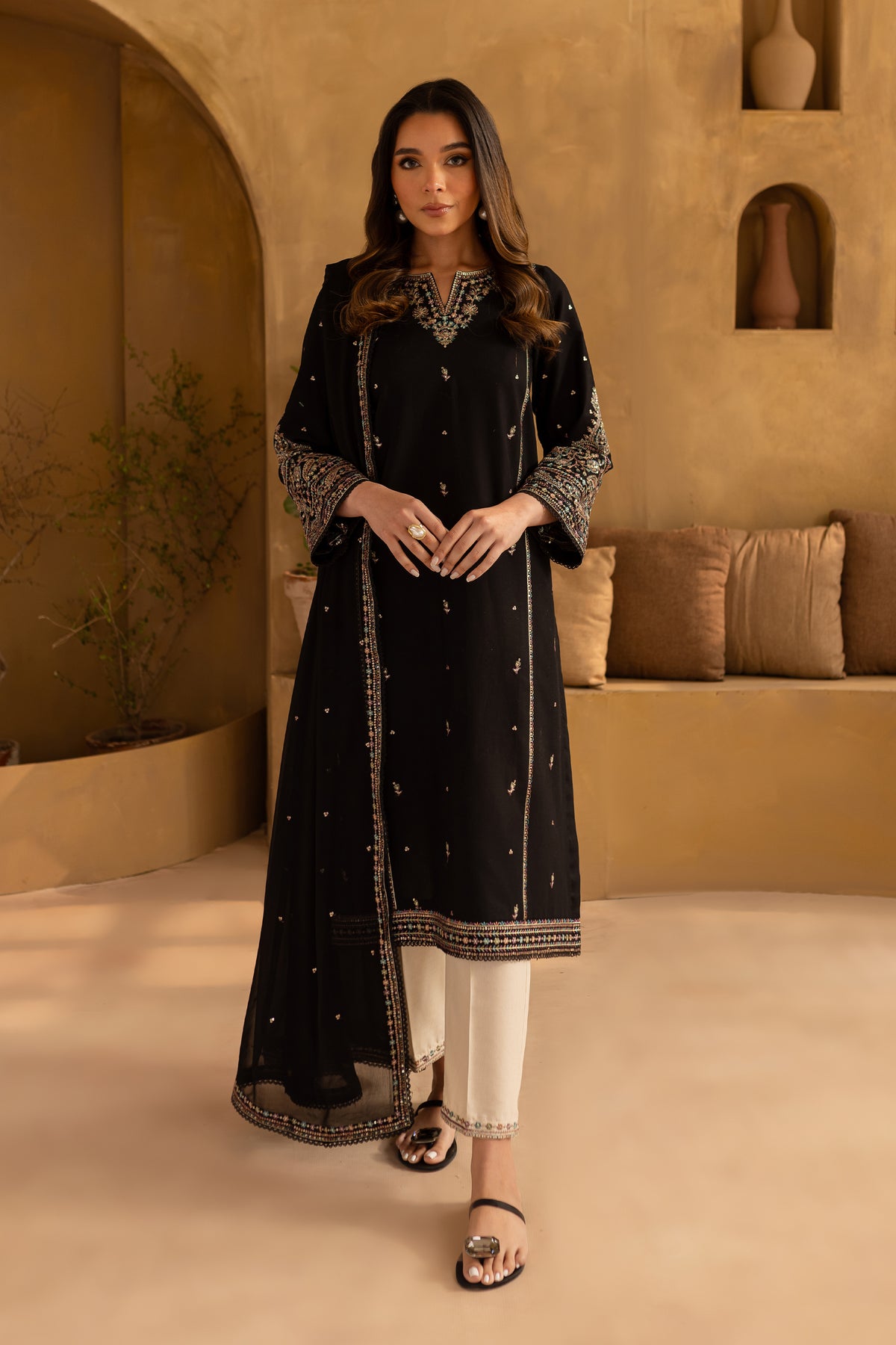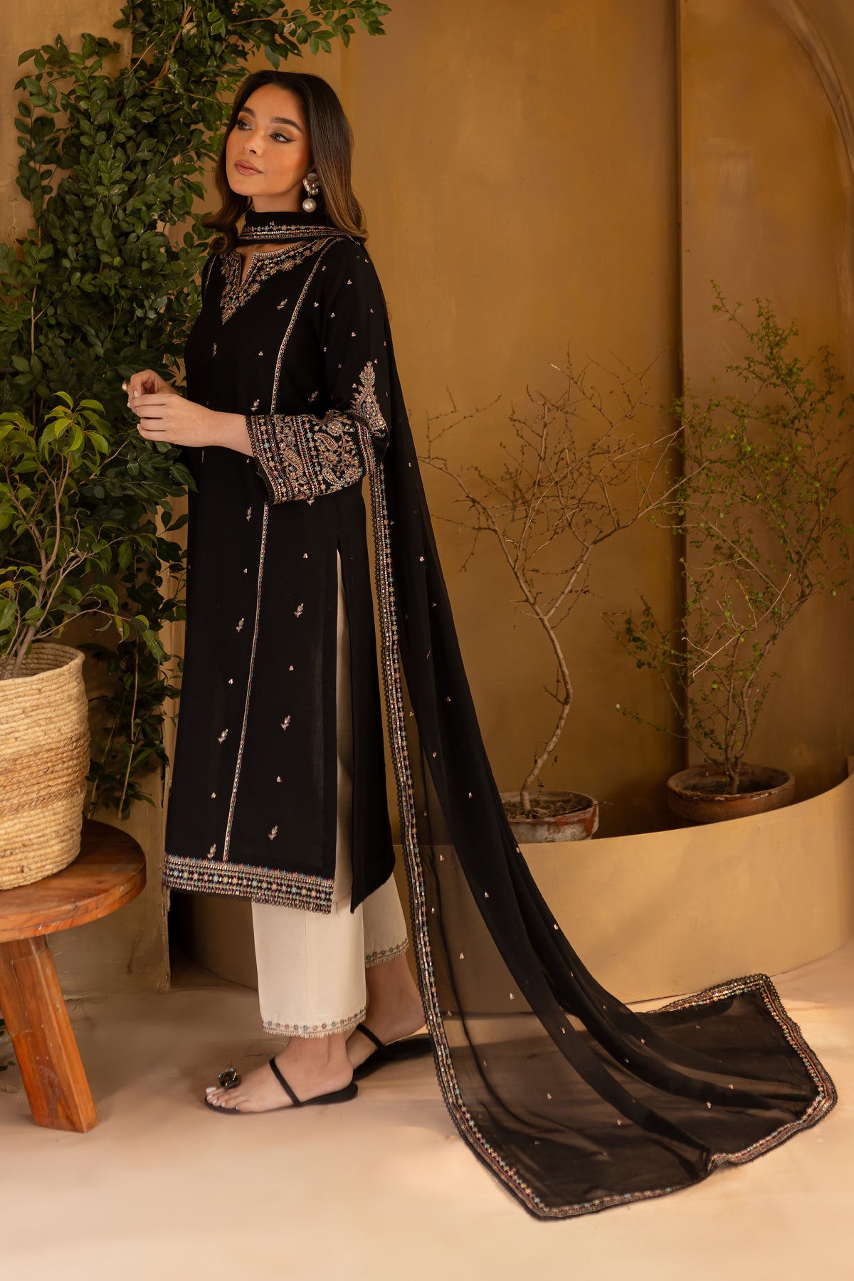 This stylish mid-length black khaddar straight paneled shirt features a beautifully embroidered boat neckline with a V-shaped detail, adding a modern touch to the design. Intricate spread embroidery adorns the front and side panels, enhancing the shirt's sophisticated appeal. The embroidered sleeves further elevate the look with delicate detailing.