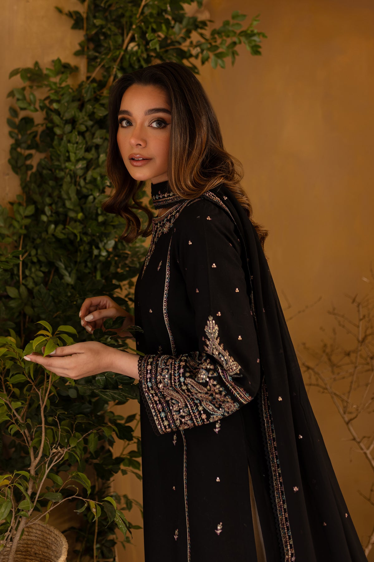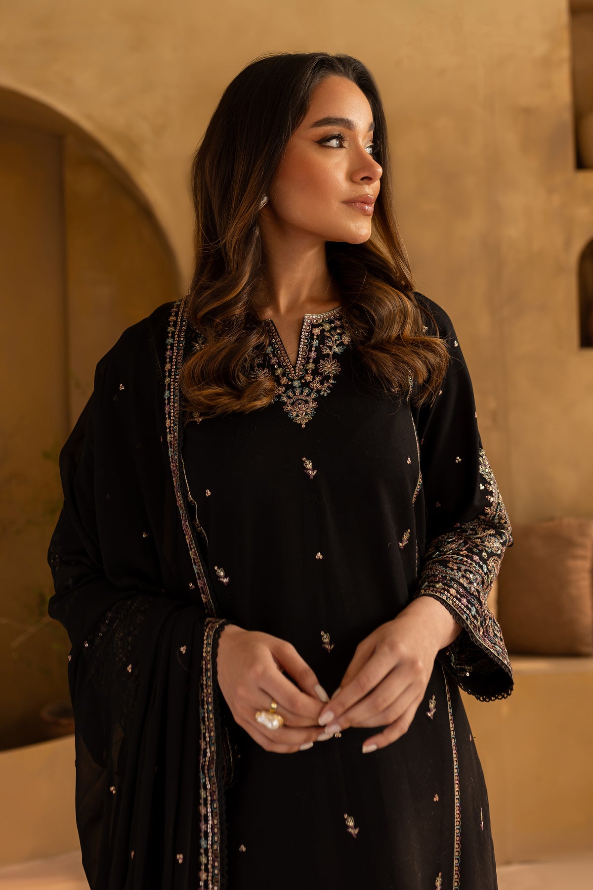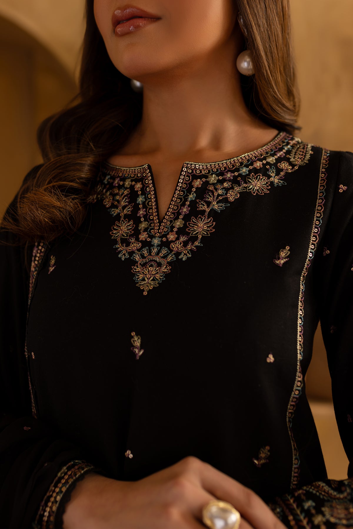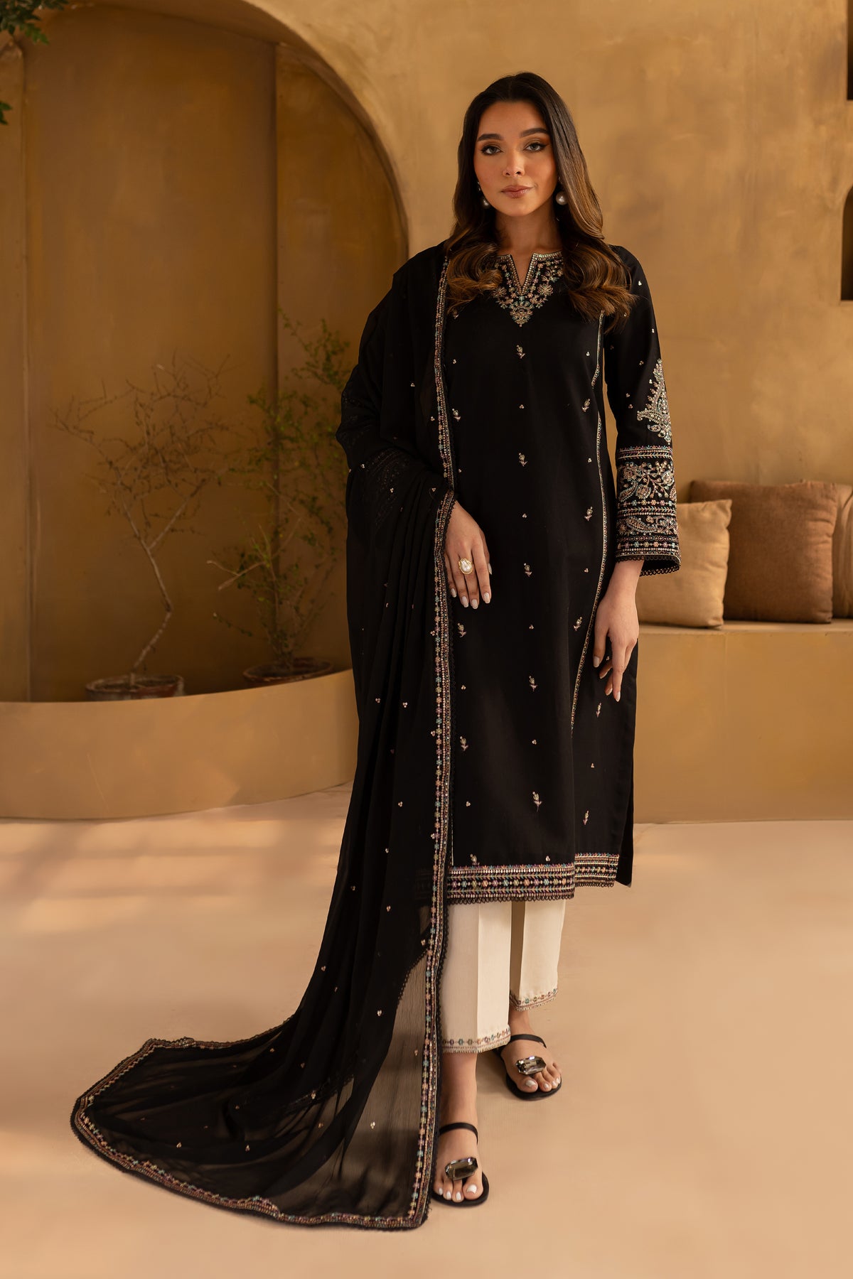 This stylish mid-length black khaddar straight paneled shirt features a beautifully embroidered boat neckline with a V-shaped detail, adding a modern touch to the design. Intricate spread embroidery adorns the front and side panels, enhancing the shirt's sophisticated appeal. The embroidered sleeves further elevate the look with delicate detailing.