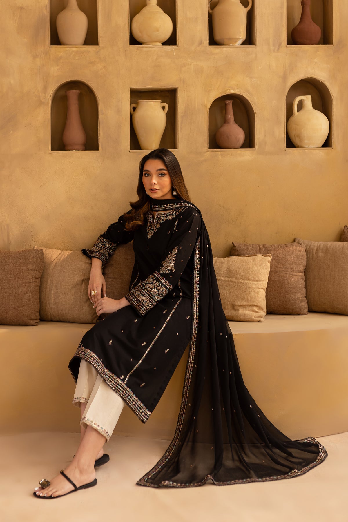 Paired with contrasting straight khaddar trousers, the ensemble creates a sleek, flattering silhouette.