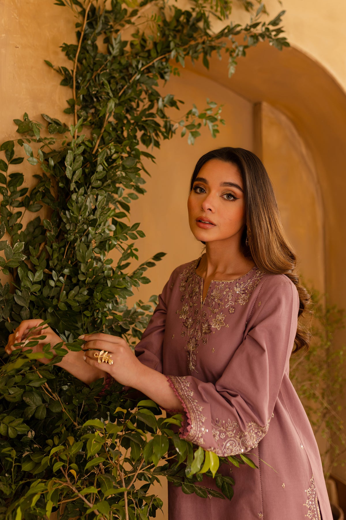 This refined 2-piece onion khaddar shirt features a short paneled shirt with a heavy embroidered neckline, creating a striking focal point. The shirt is beautifully detailed with minimal spread embroidery along the chaaks and side corners, adding subtle elegance. The embroidered sleeves complement the design, bringing balance and sophistication.