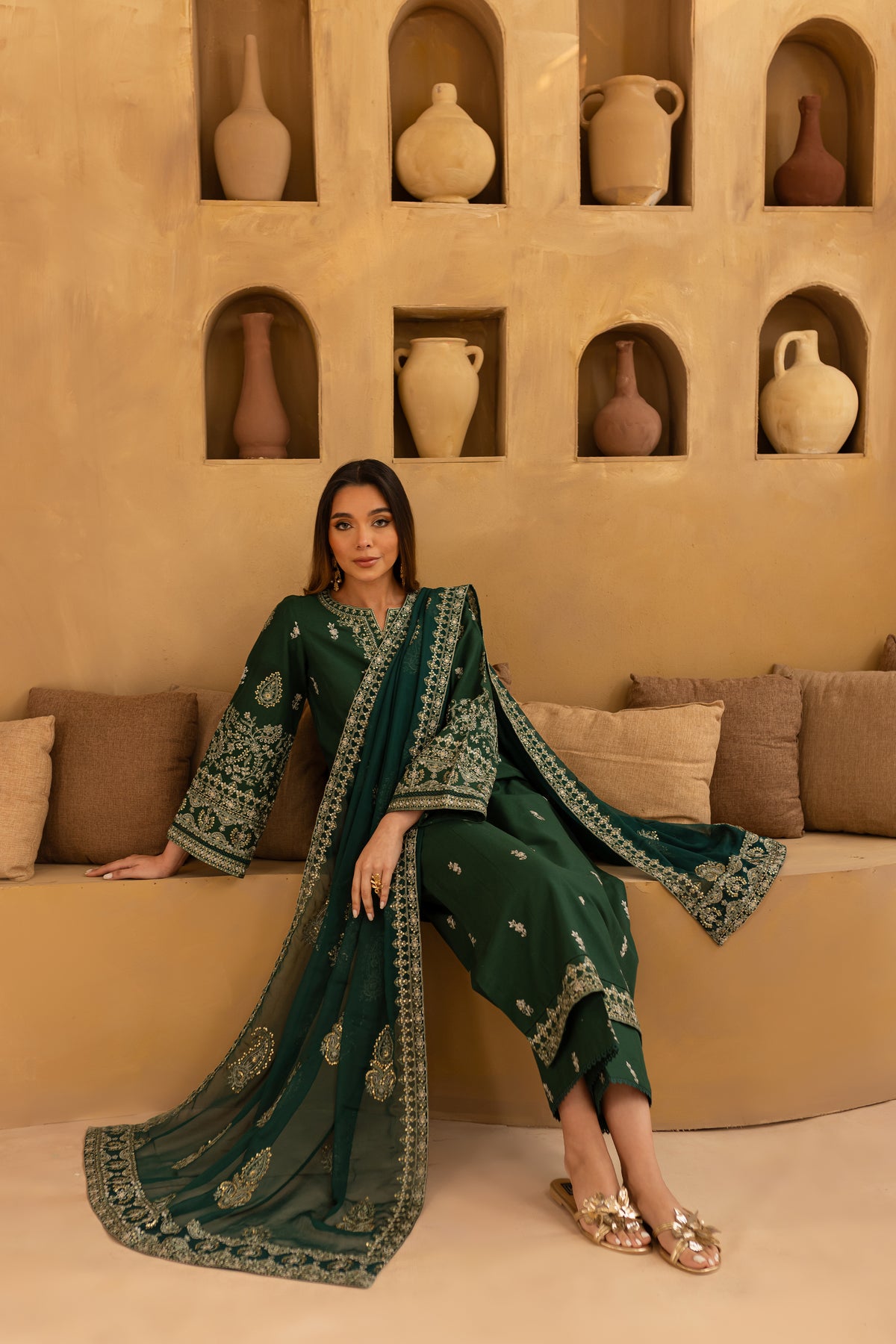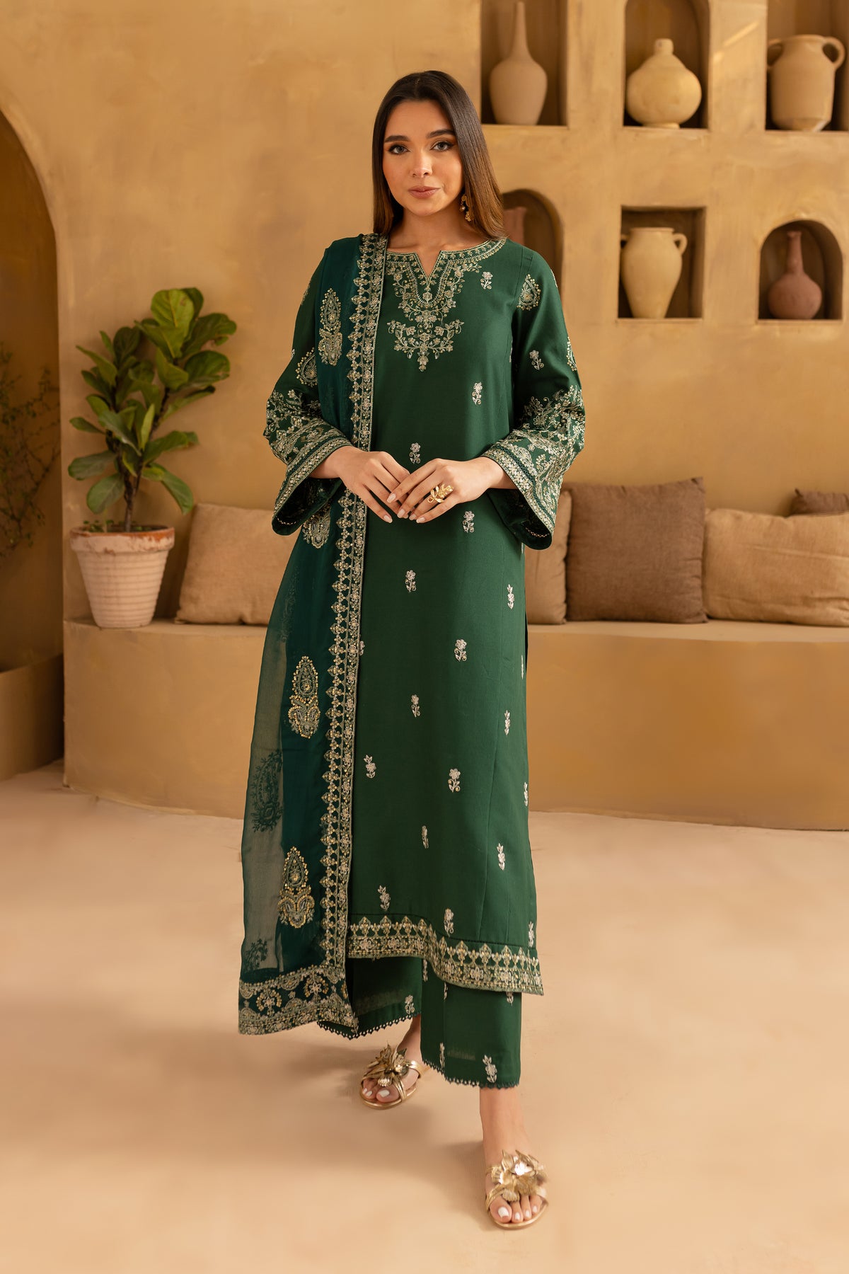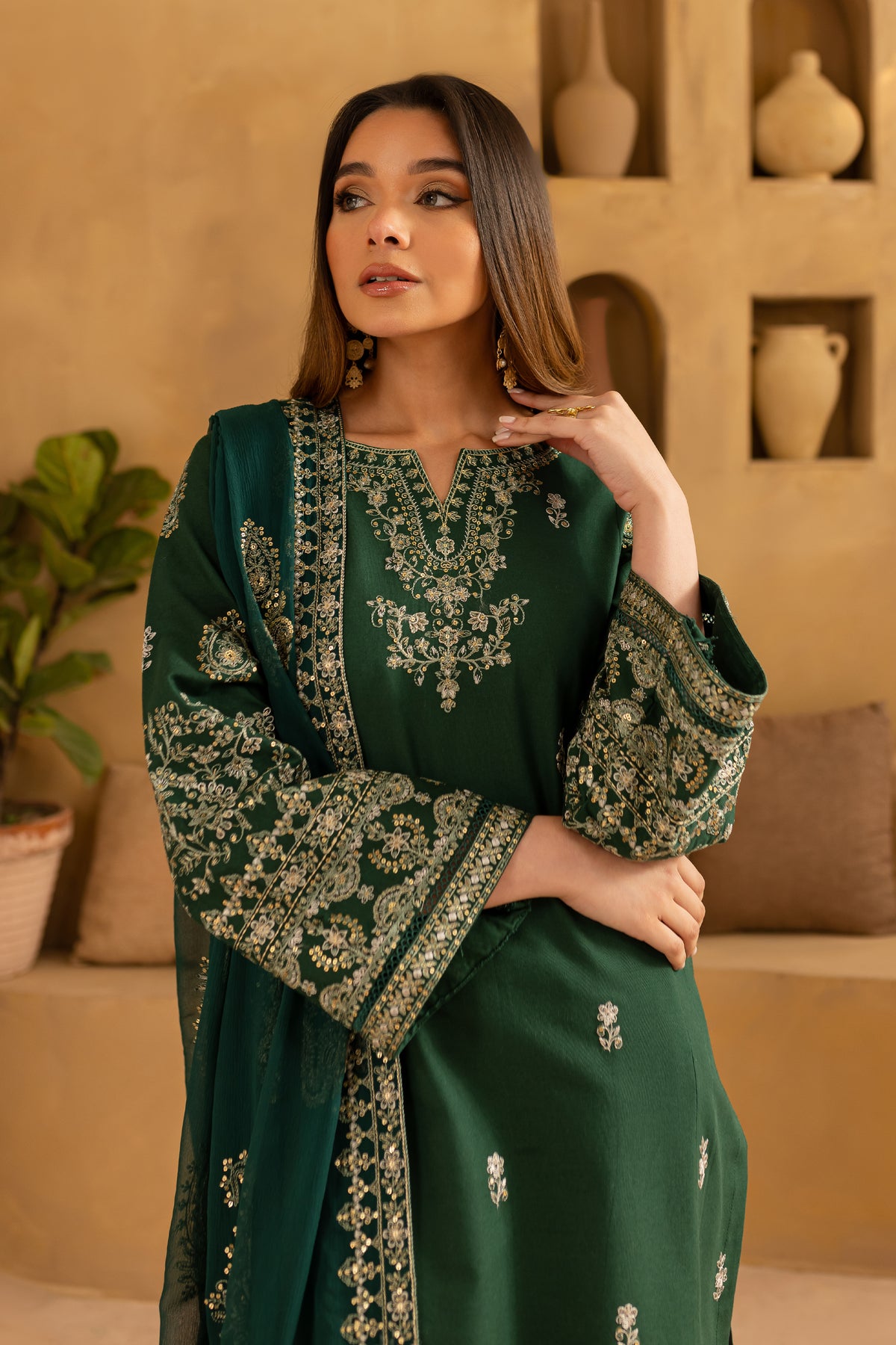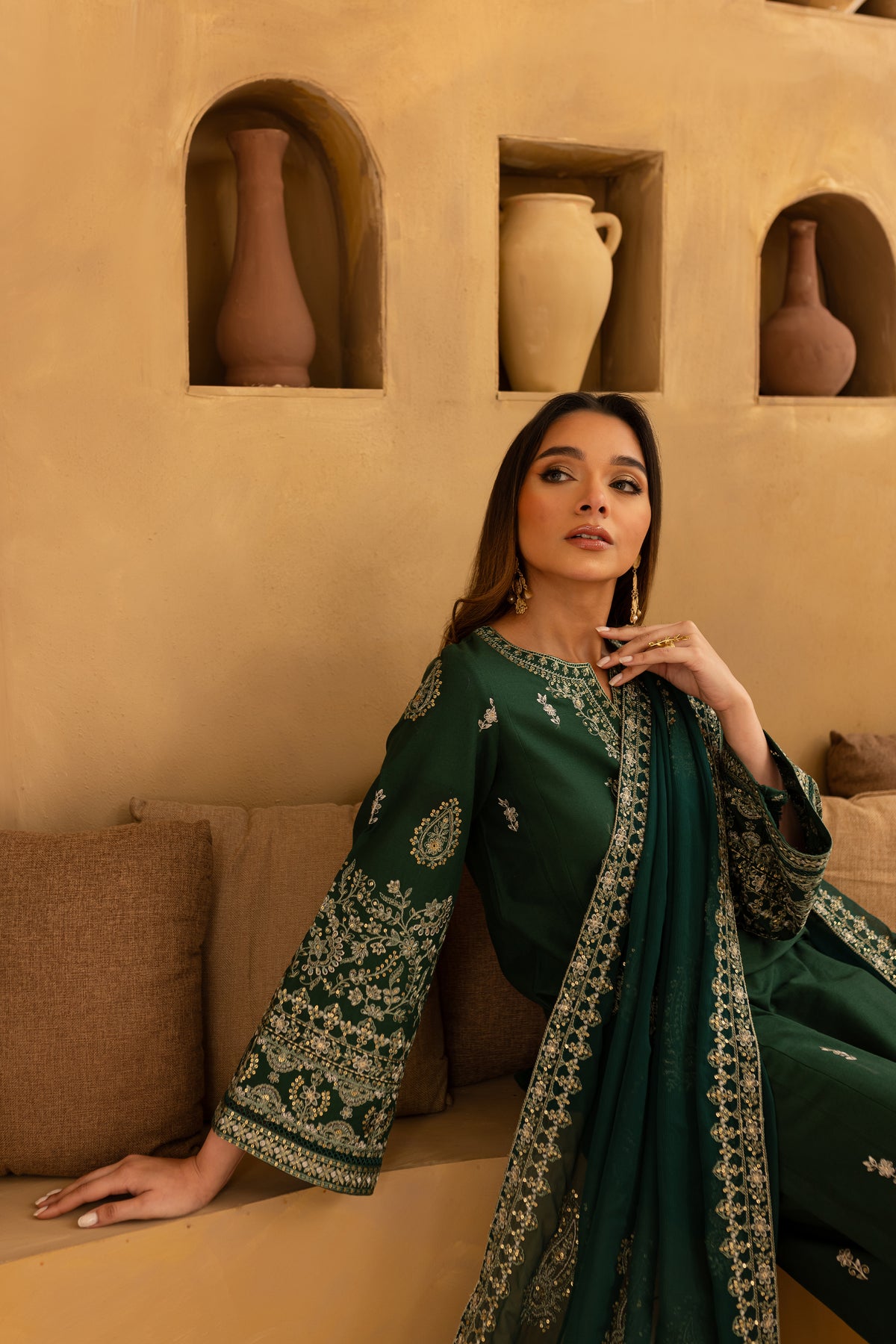 This green khaddar shirt combines bold embroidery with delicate embellishments made from premium khaddar in sea green color, designed to make a statement. The shirt is richly embroidered with intricate paneling and features heavily embroidered sleeves. The sleeves are further embellished with fringes and lace detailing offering a textured and opulent finish.