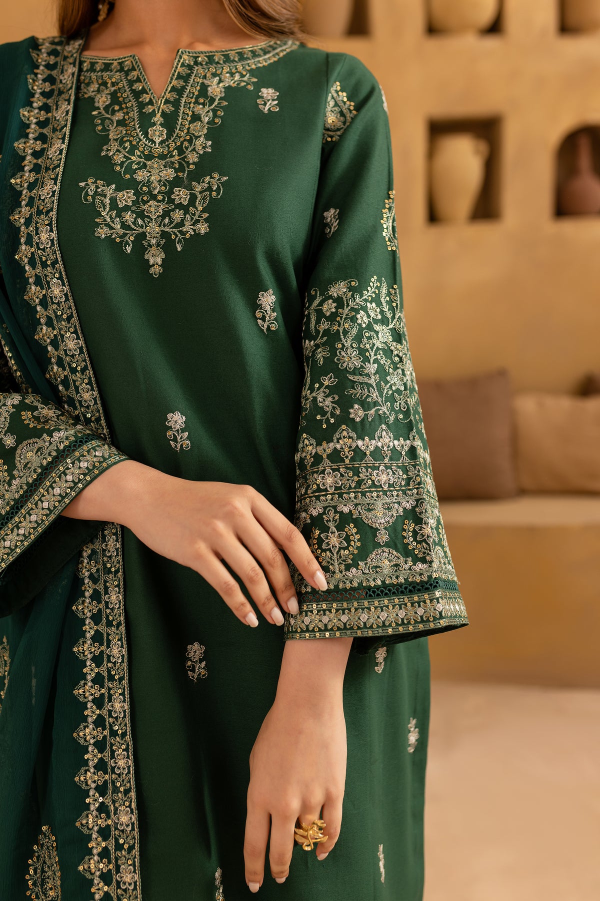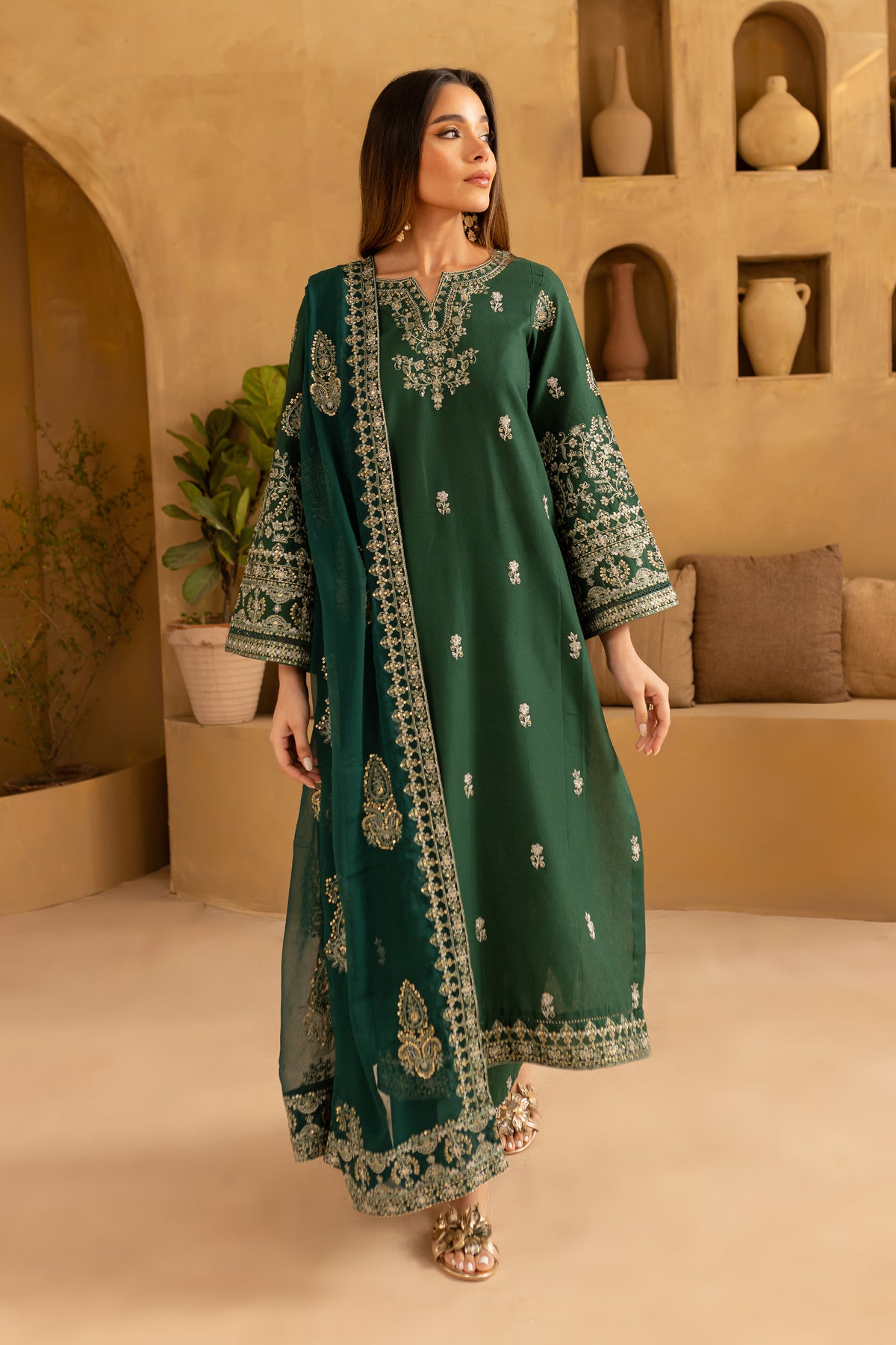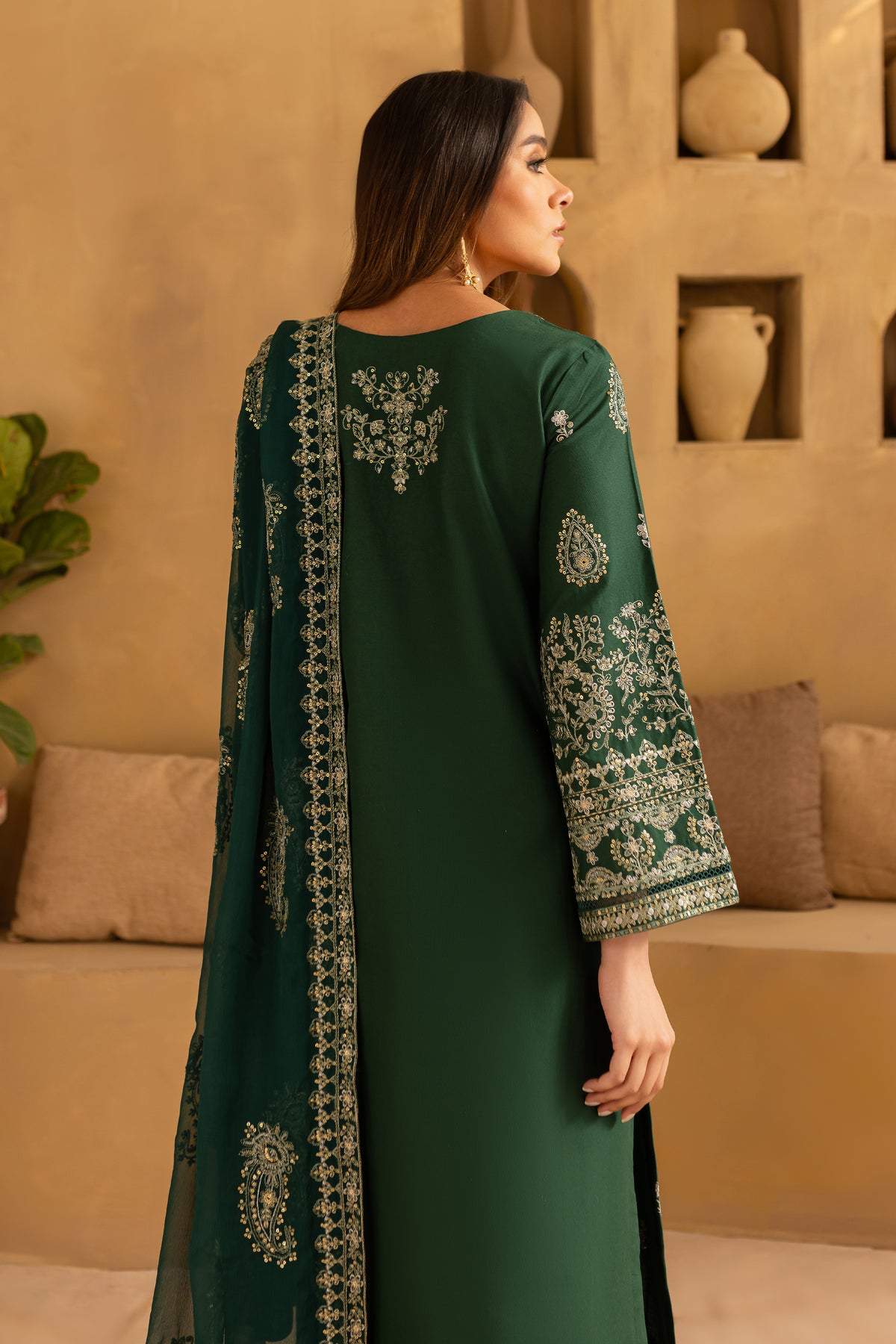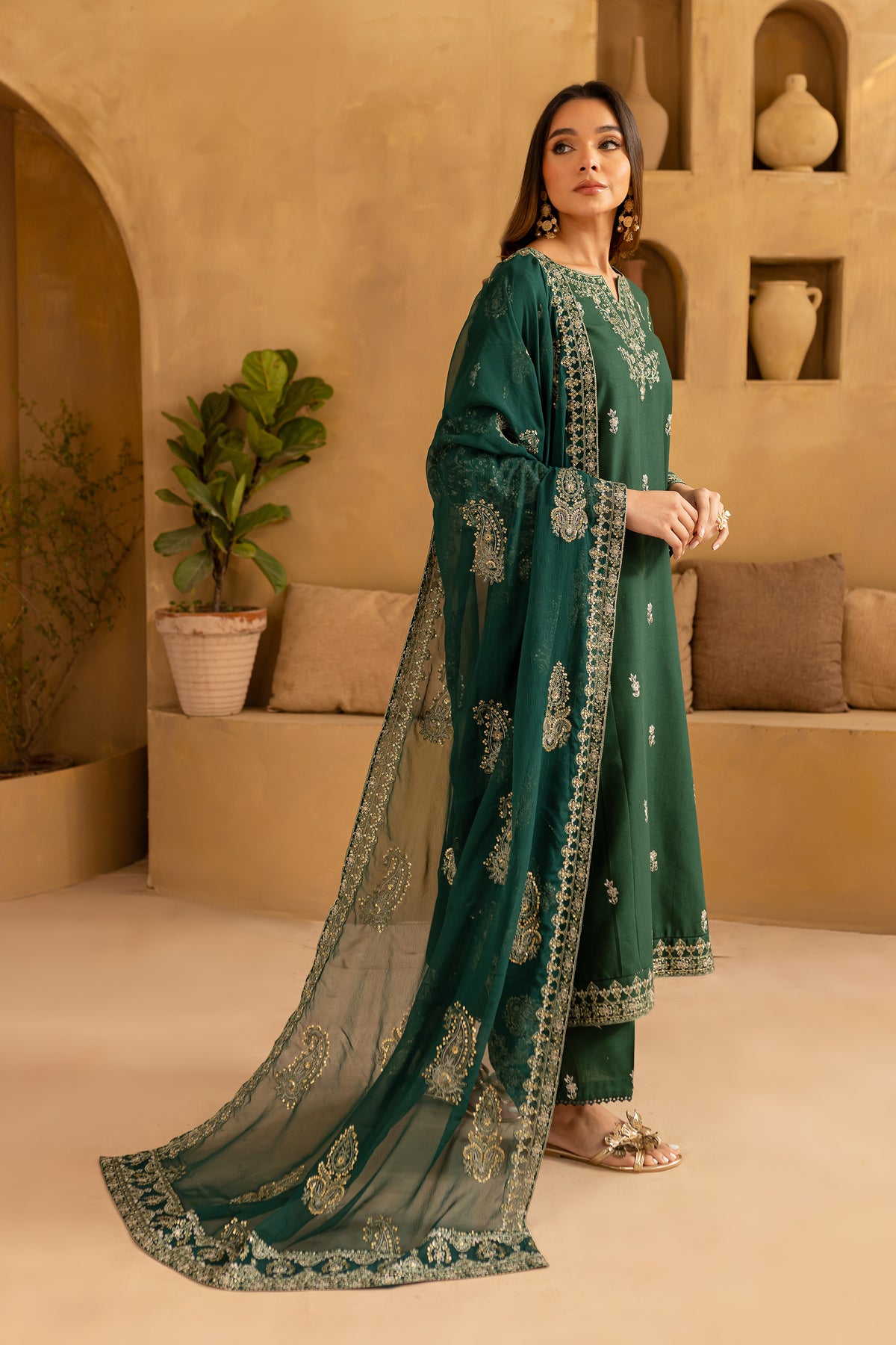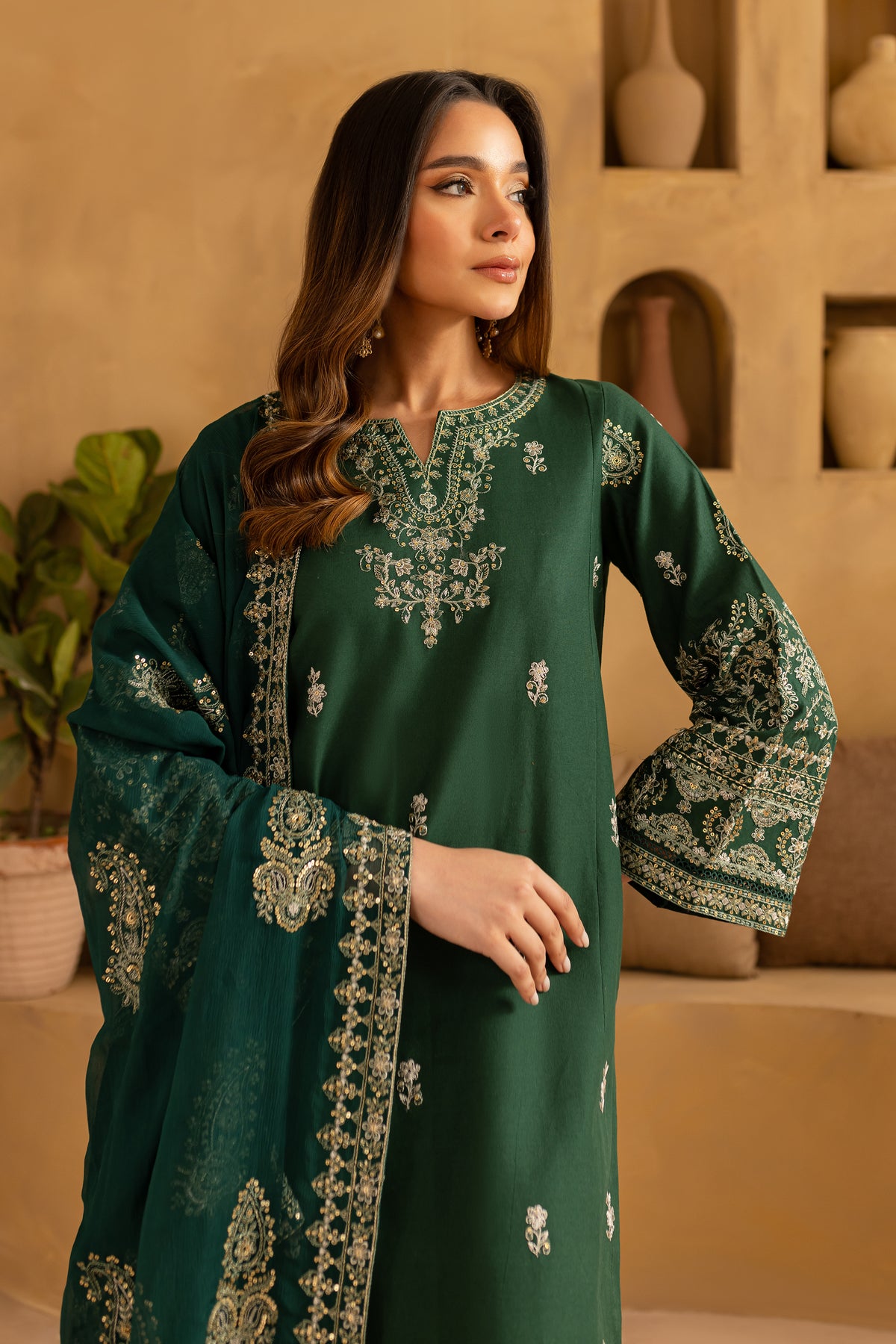 This green khaddar shirt combines bold embroidery with delicate embellishments made from premium khaddar in sea green color, designed to make a statement. The shirt is richly embroidered with intricate paneling and features heavily embroidered sleeves. The sleeves are further embellished with fringes and lace detailing offering a textured and opulent finish.