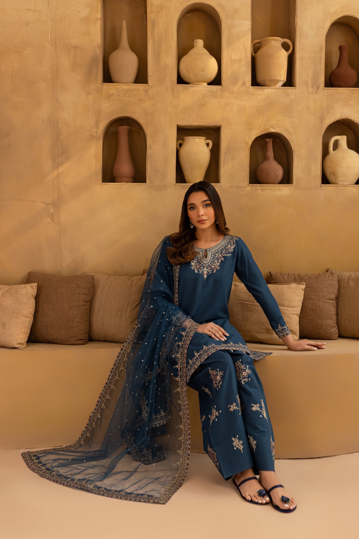 Paired with a fully embroidered khaddar shalwar, with its loose hem and intricate stitching details, complements the shirt's design while providing a comfortable yet stylish fit.