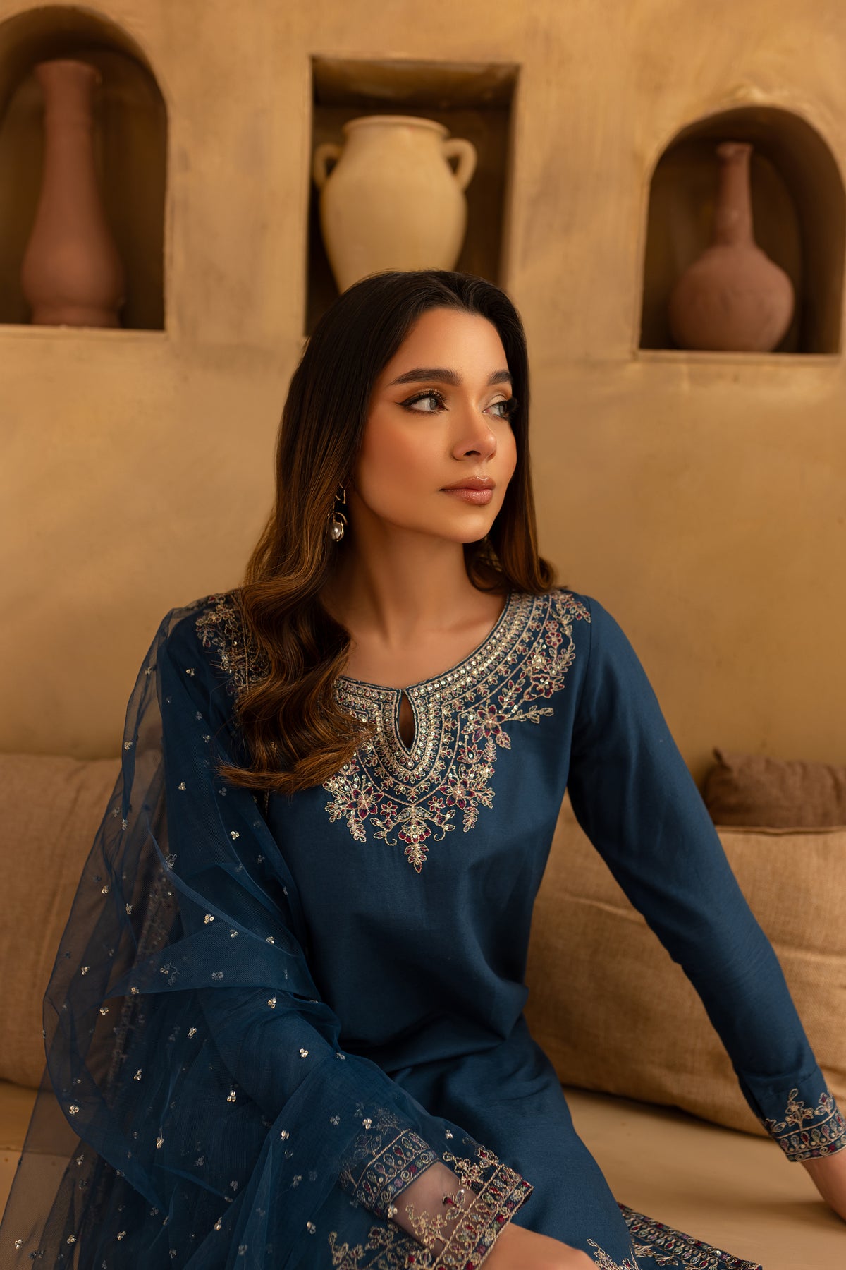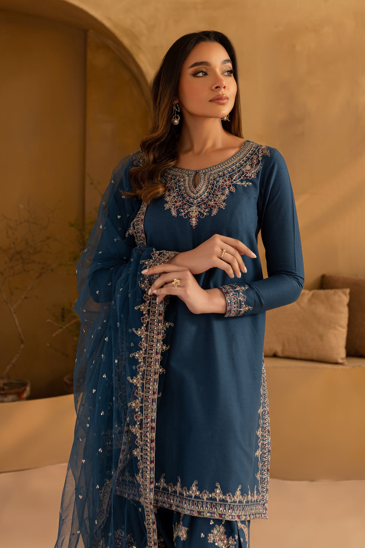 This exquisite ocean blue 3-piece khaddar set features a straight, short shirt with a beautifully embroidered neckline and a delicate keyhole detail, adding a touch of elegance. The shirt is further enhanced with embroidered borders along the hem and sides, offering a refined and graceful look.