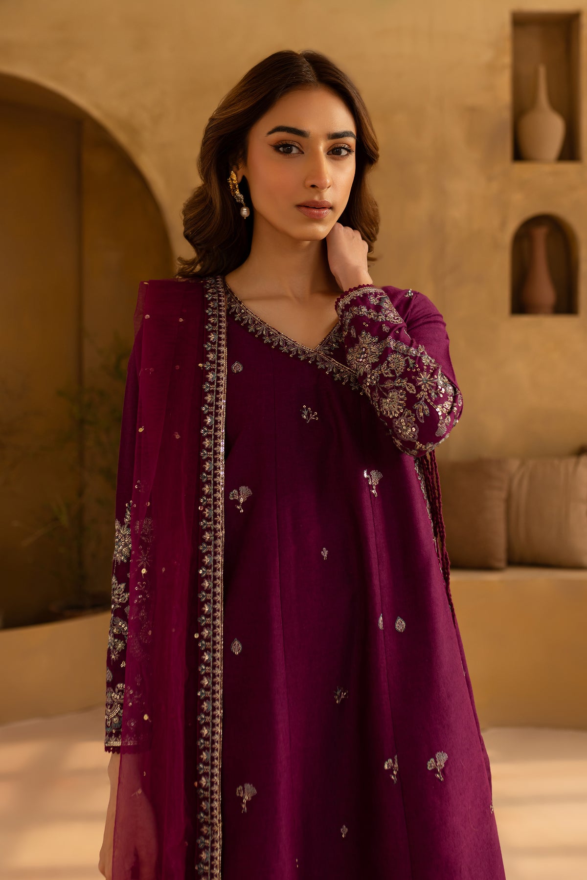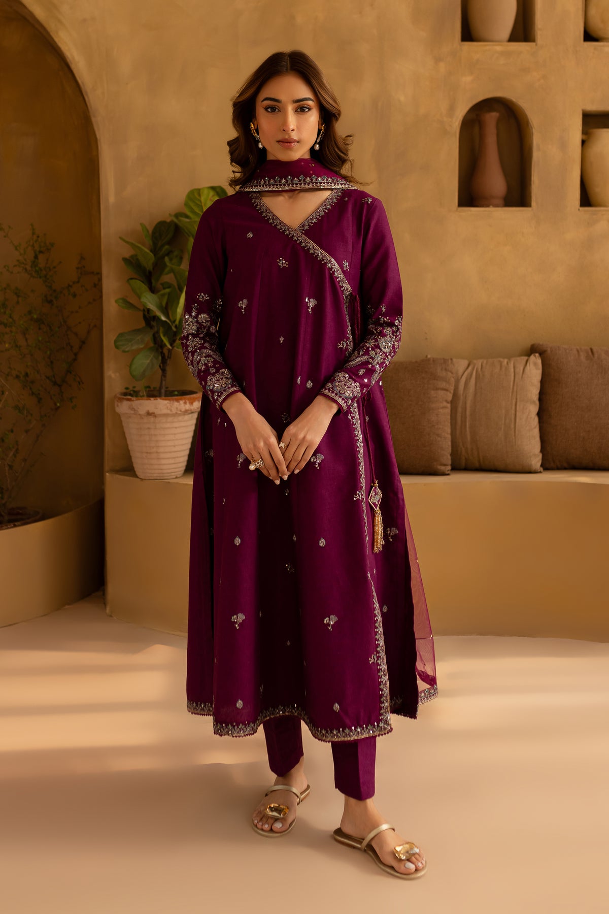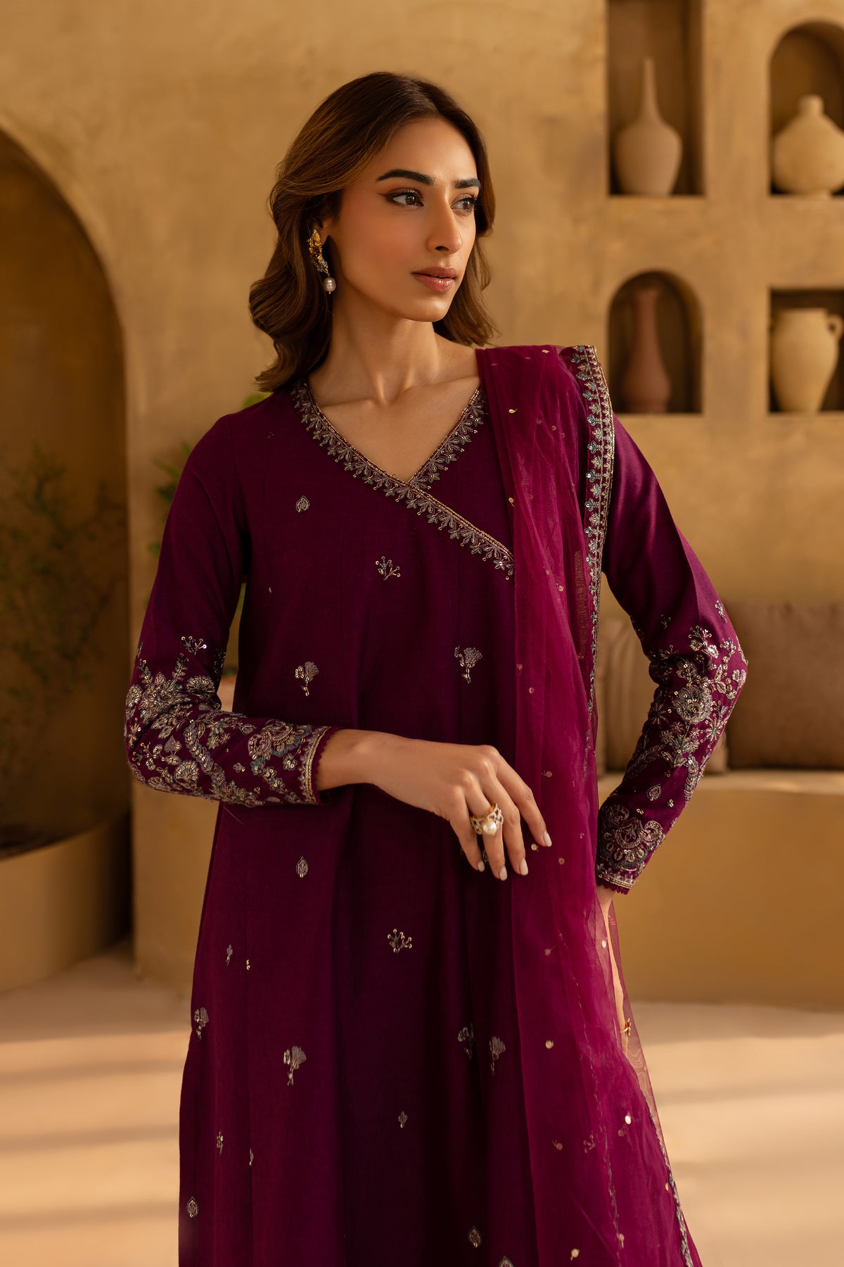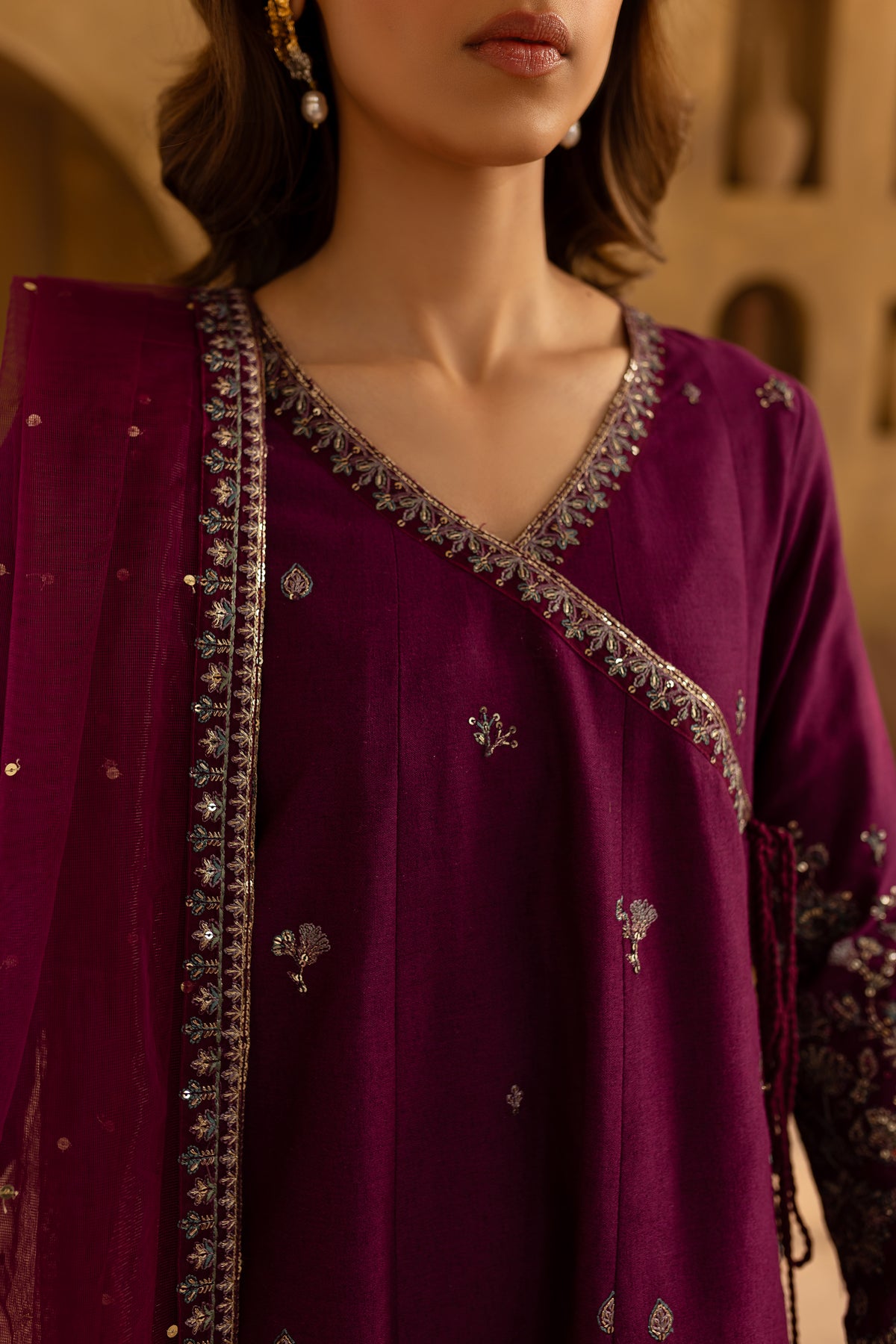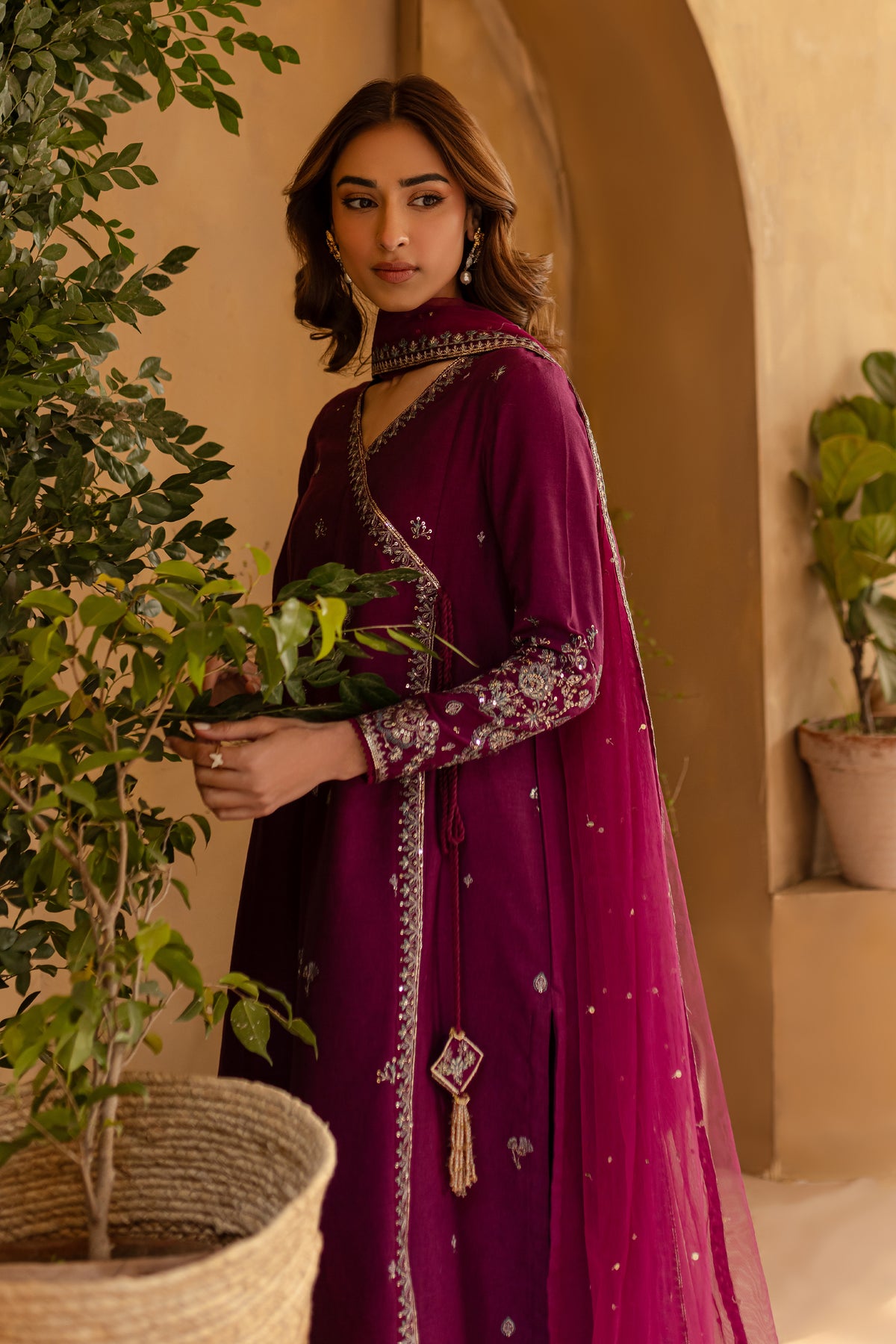 This stunning 3-piece karrandi ensemble in purple features a long angrakha frock with a minimal spread design and a side slit opening, beautifully accented with embroidered tassels and a dori for a touch of traditional charm. The frock's heavy embroidered, composed sleeves, complete with snap buttons, elevate the look with a perfect blend of elegance and modernity.