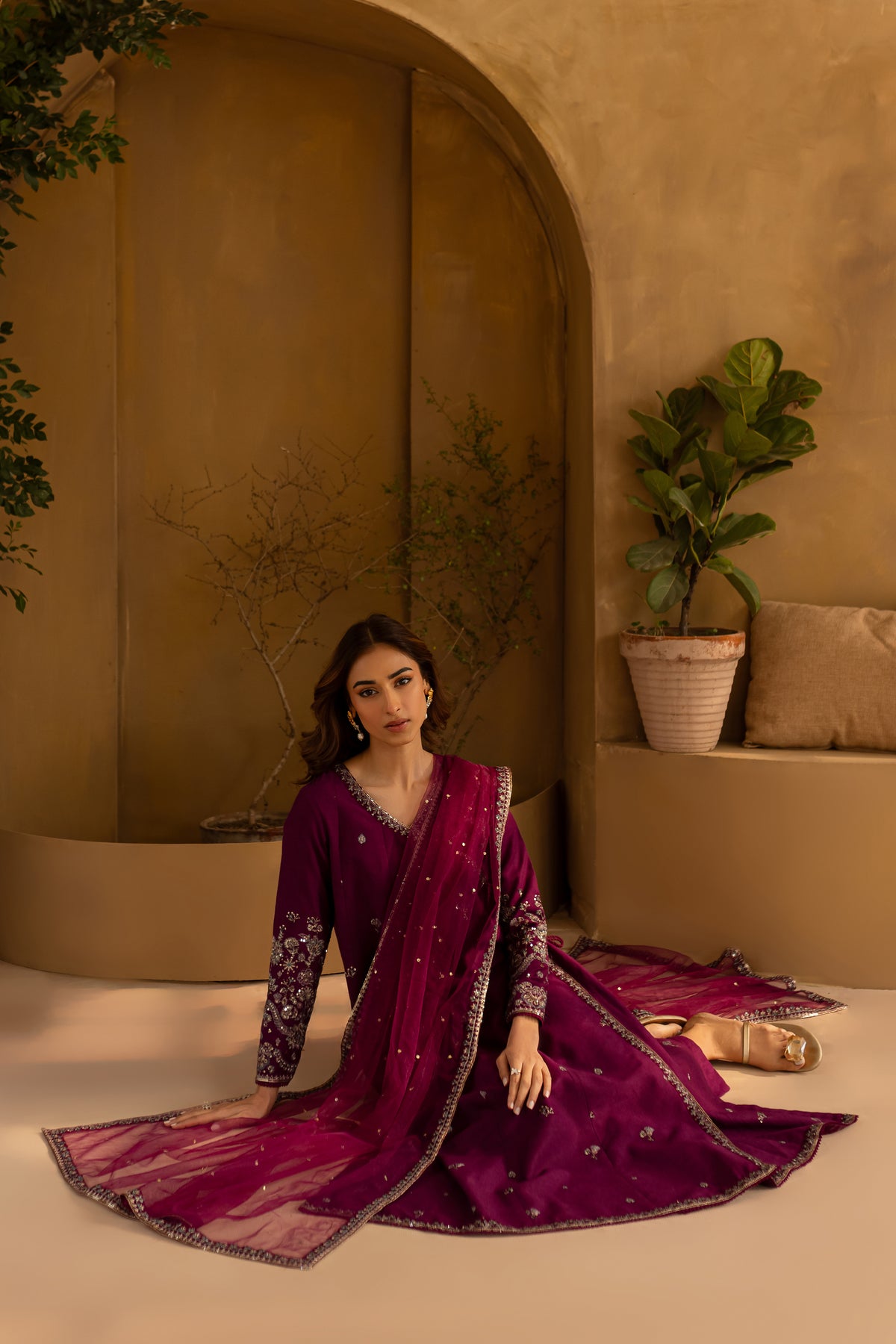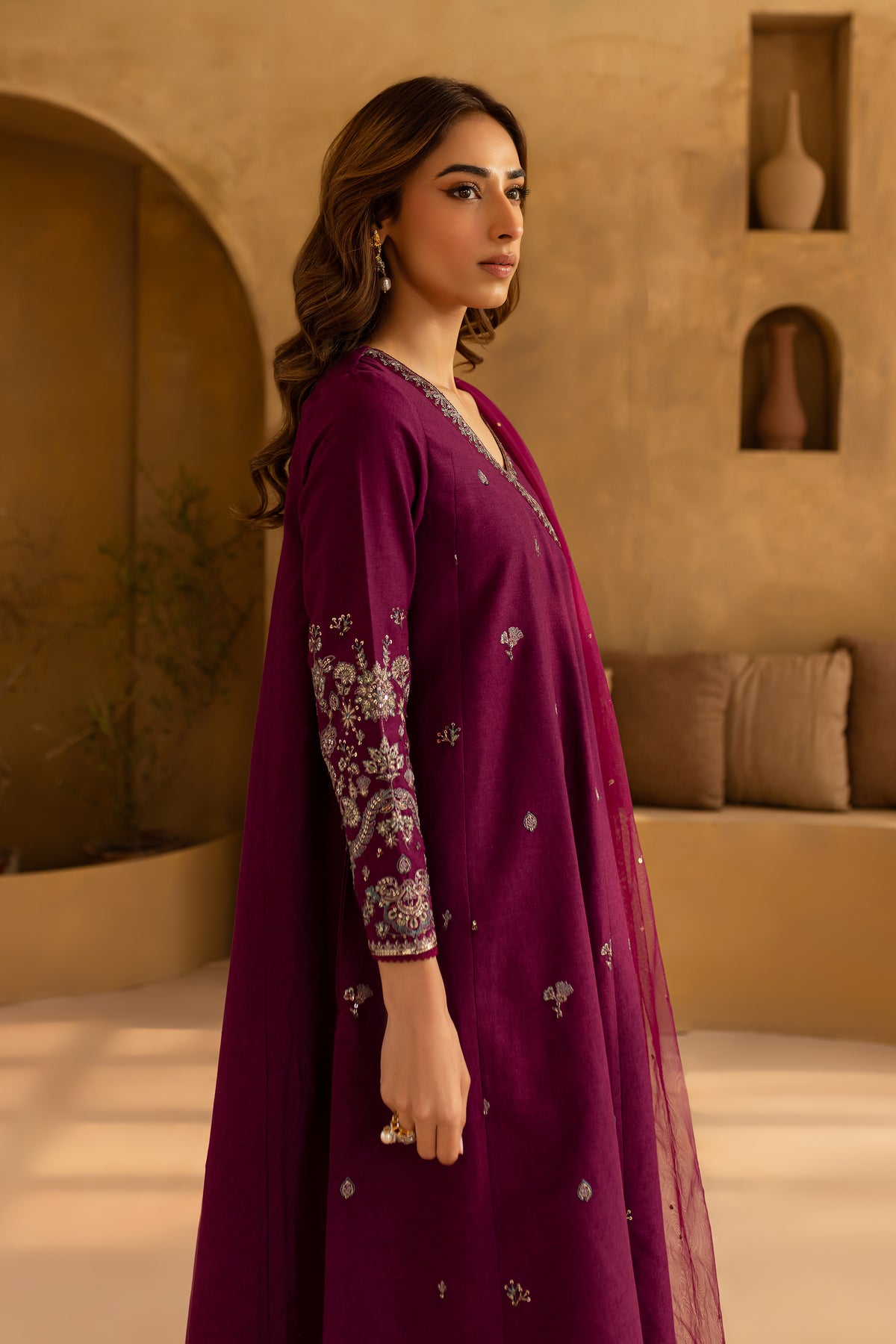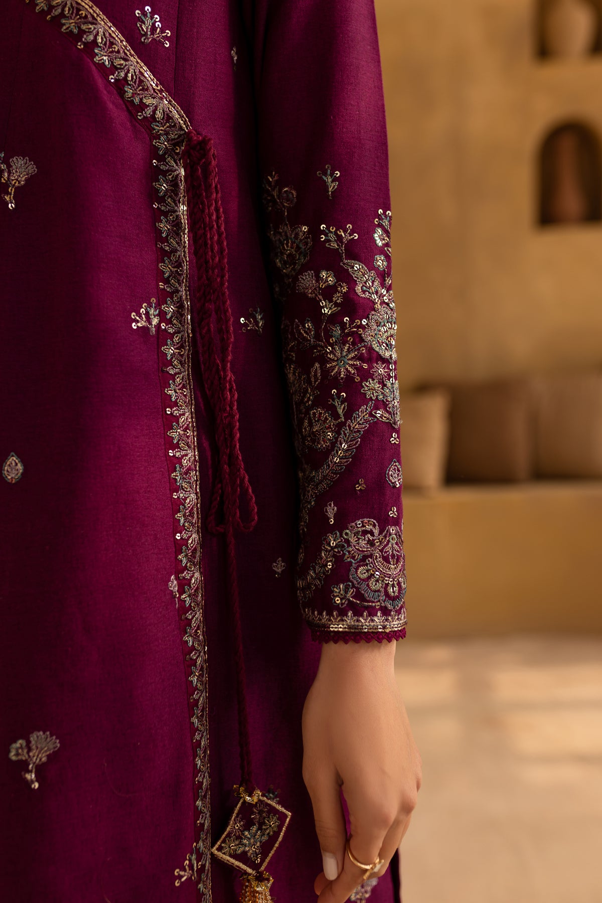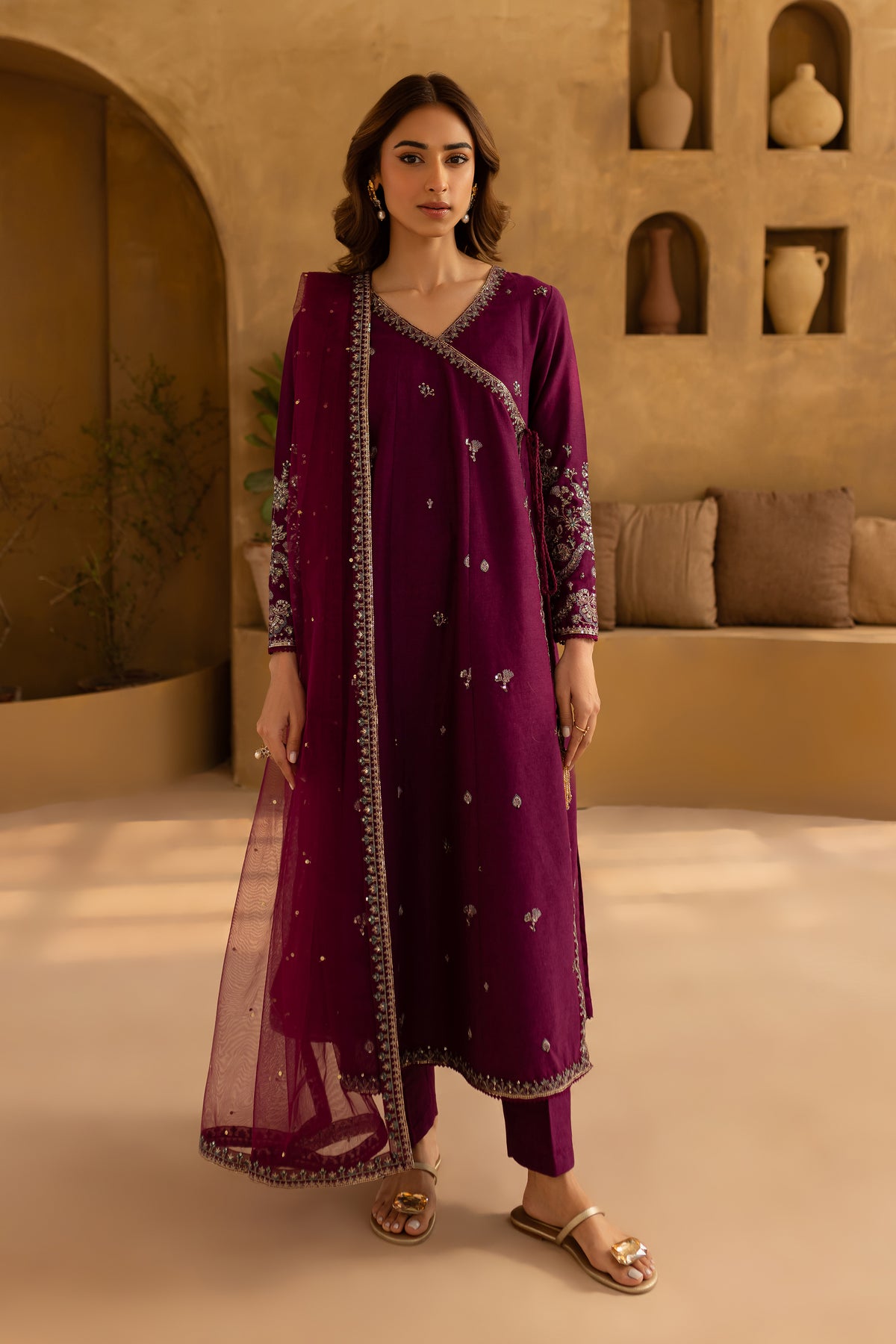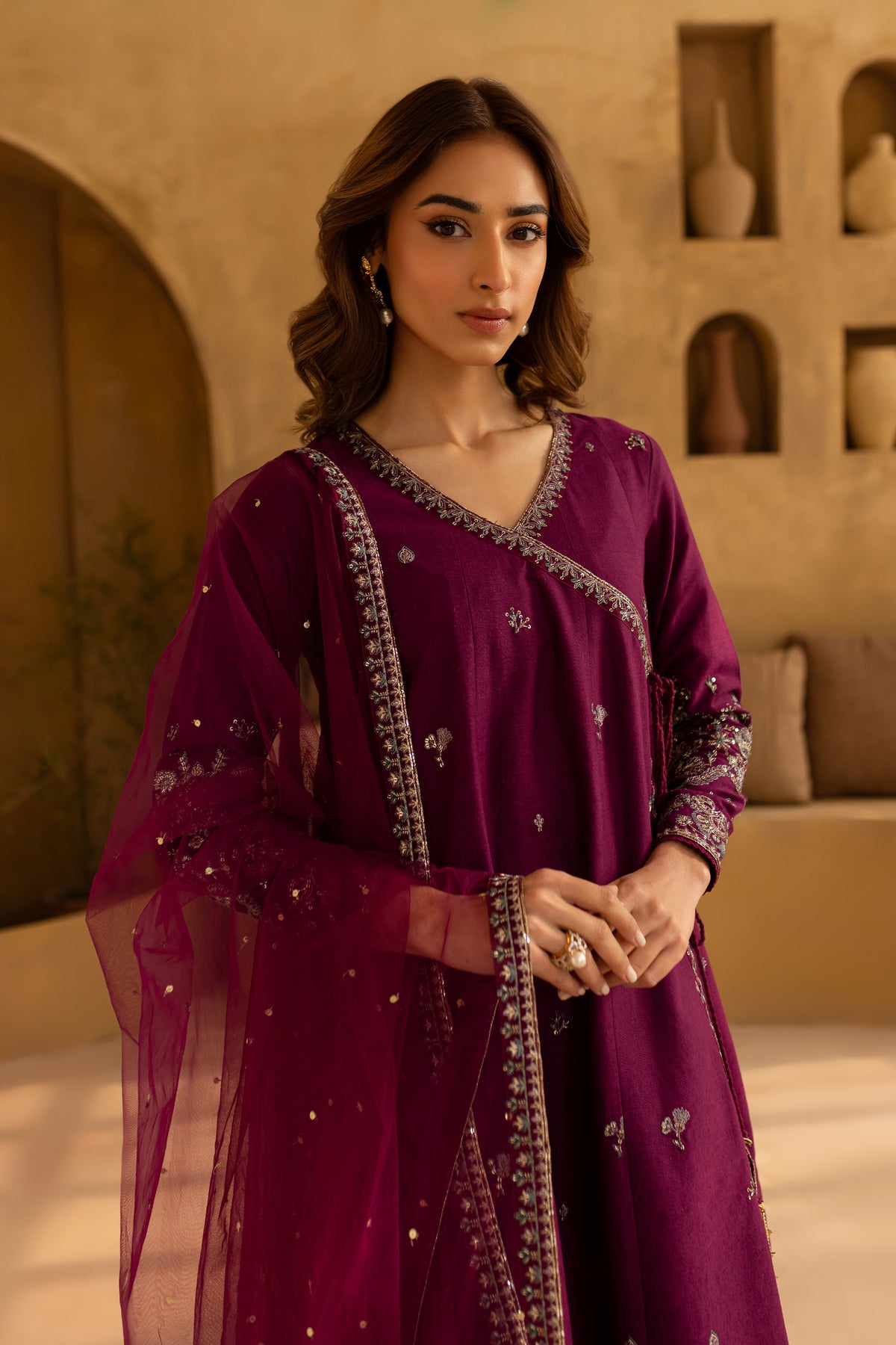 This stunning 3-piece karrandi ensemble in purple features a long angrakha frock with a minimal spread design and a side slit opening, beautifully accented with embroidered tassels and a dori for a touch of traditional charm. The frock's heavy embroidered, composed sleeves, complete with snap buttons, elevate the look with a perfect blend of elegance and modernity.