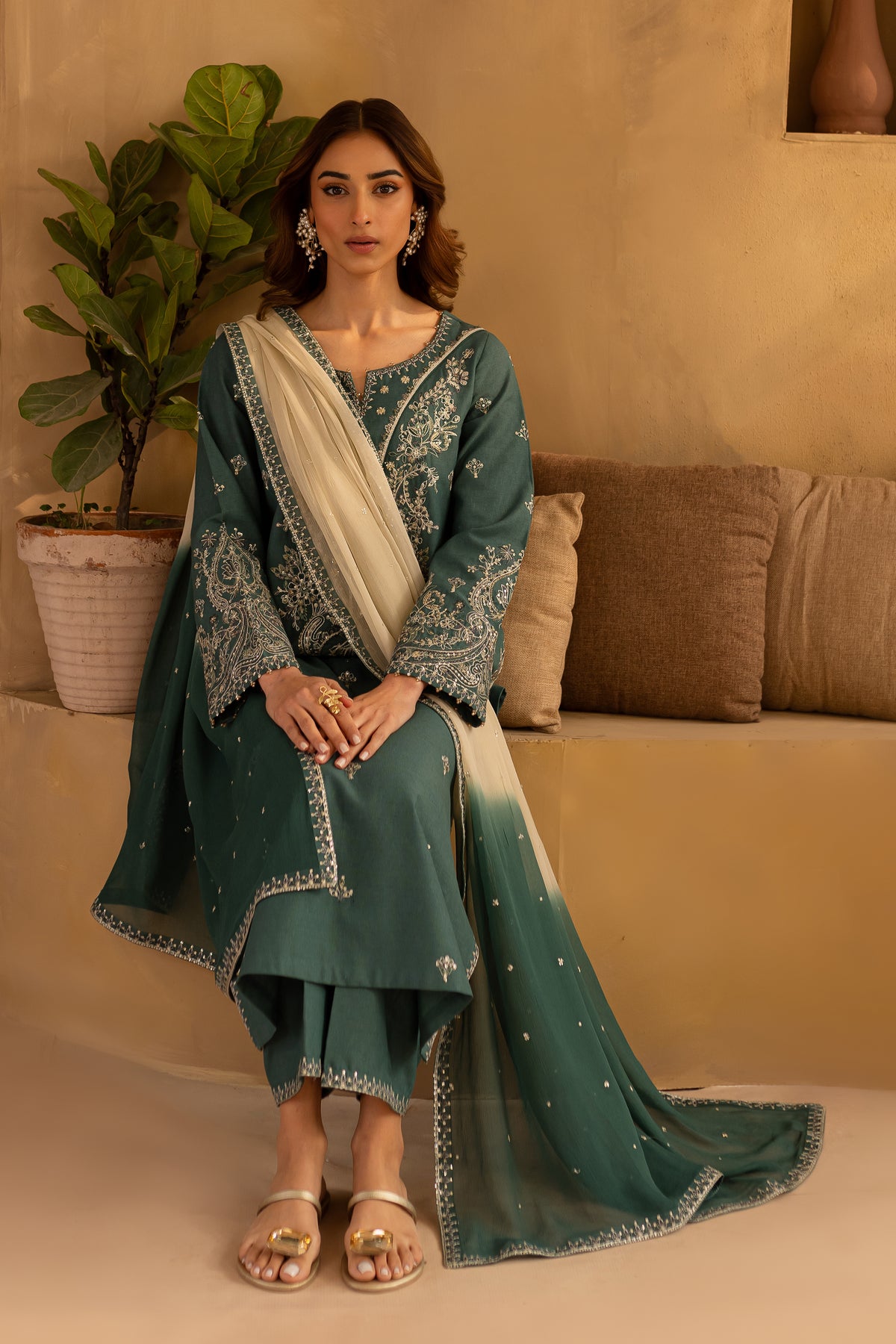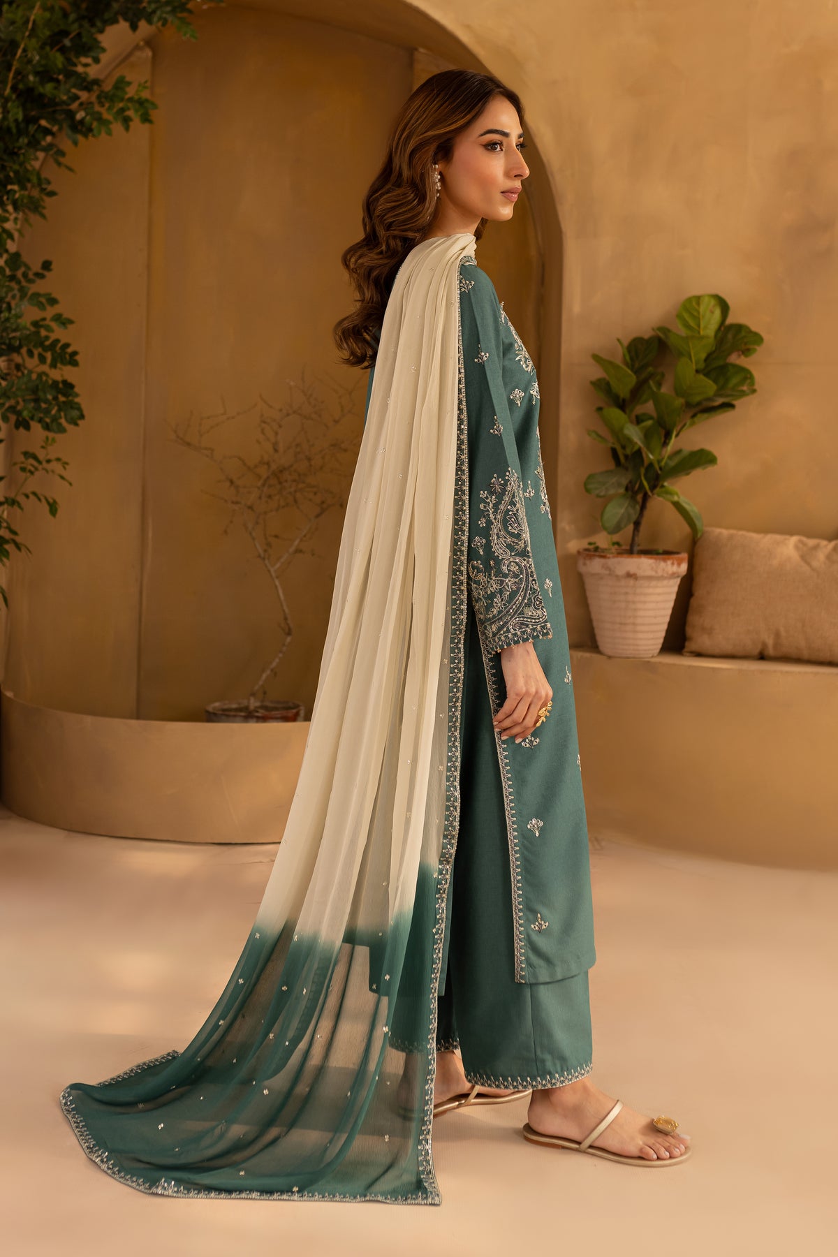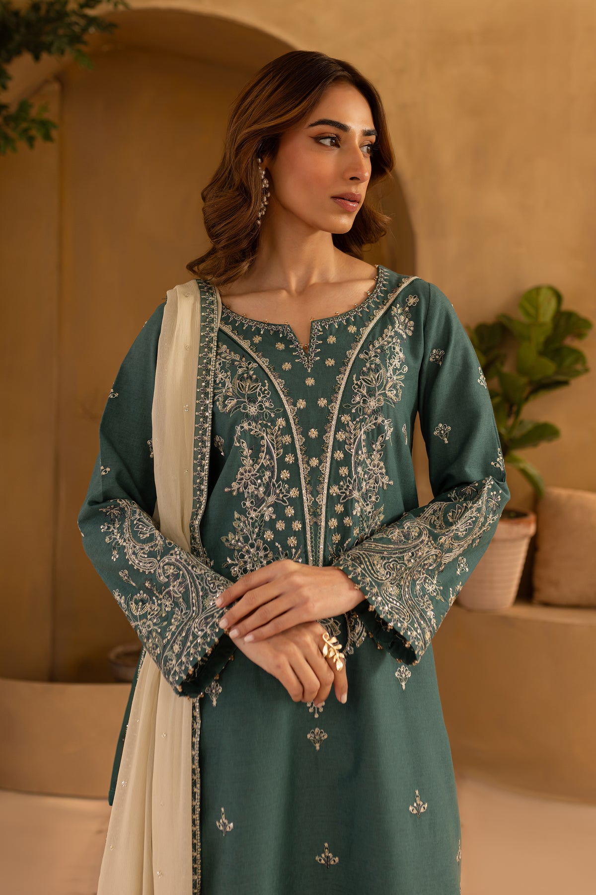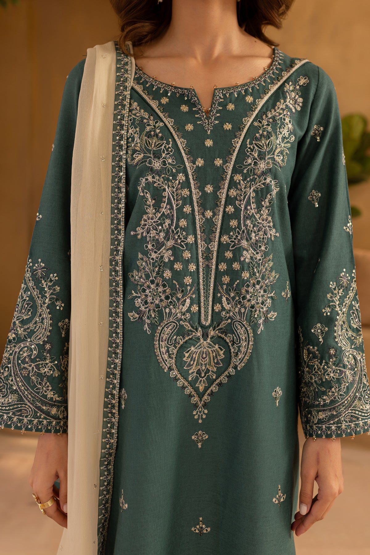 This exquisite deep ferozi 3-piece karrandi ensemble features a long, fully composed embroidered shirt with a meticulously crafted, embroidered neckline that adds a refined touch. The heavily embroidered sleeves enhance the shirt’s elegance, making a bold statement.