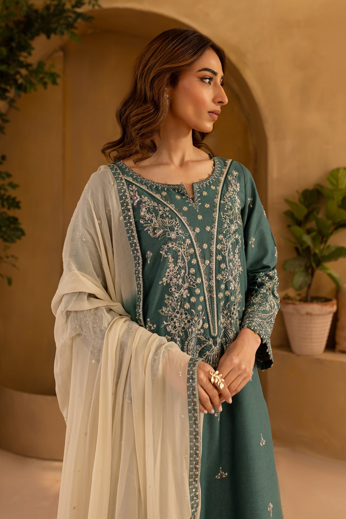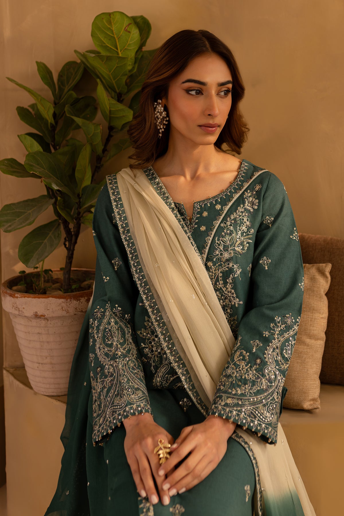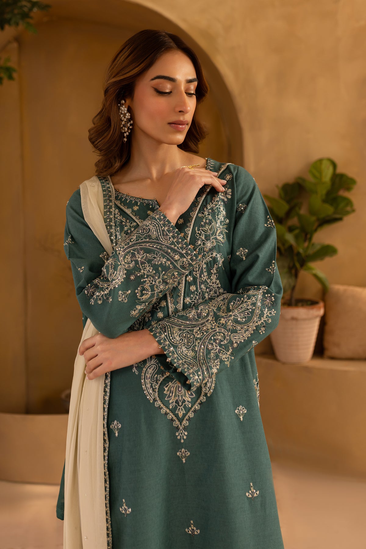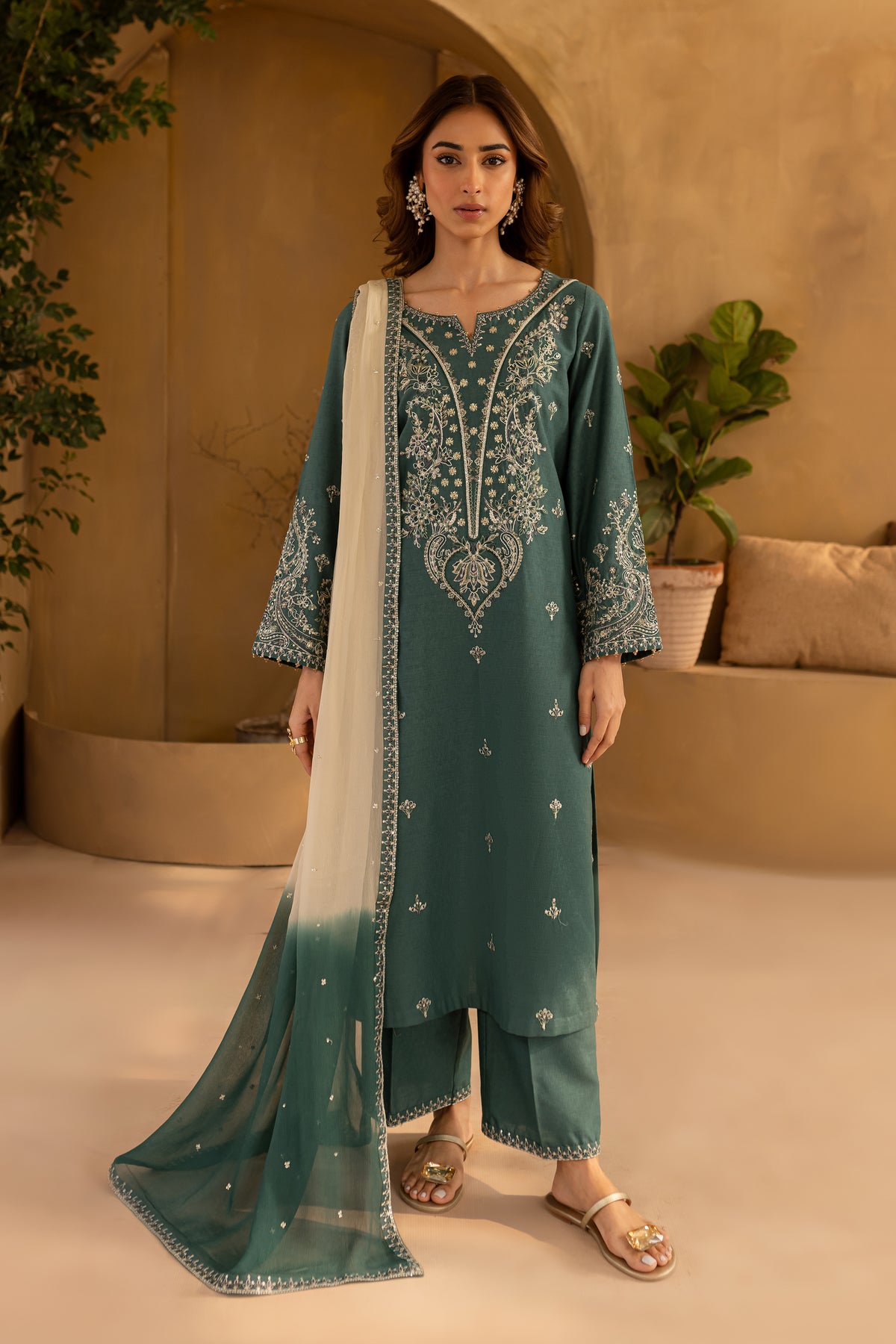 This exquisite deep ferozi 3-piece karrandi ensemble features a long, fully composed embroidered shirt with a meticulously crafted, embroidered neckline that adds a refined touch. The heavily embroidered sleeves enhance the shirt’s elegance, making a bold statement.