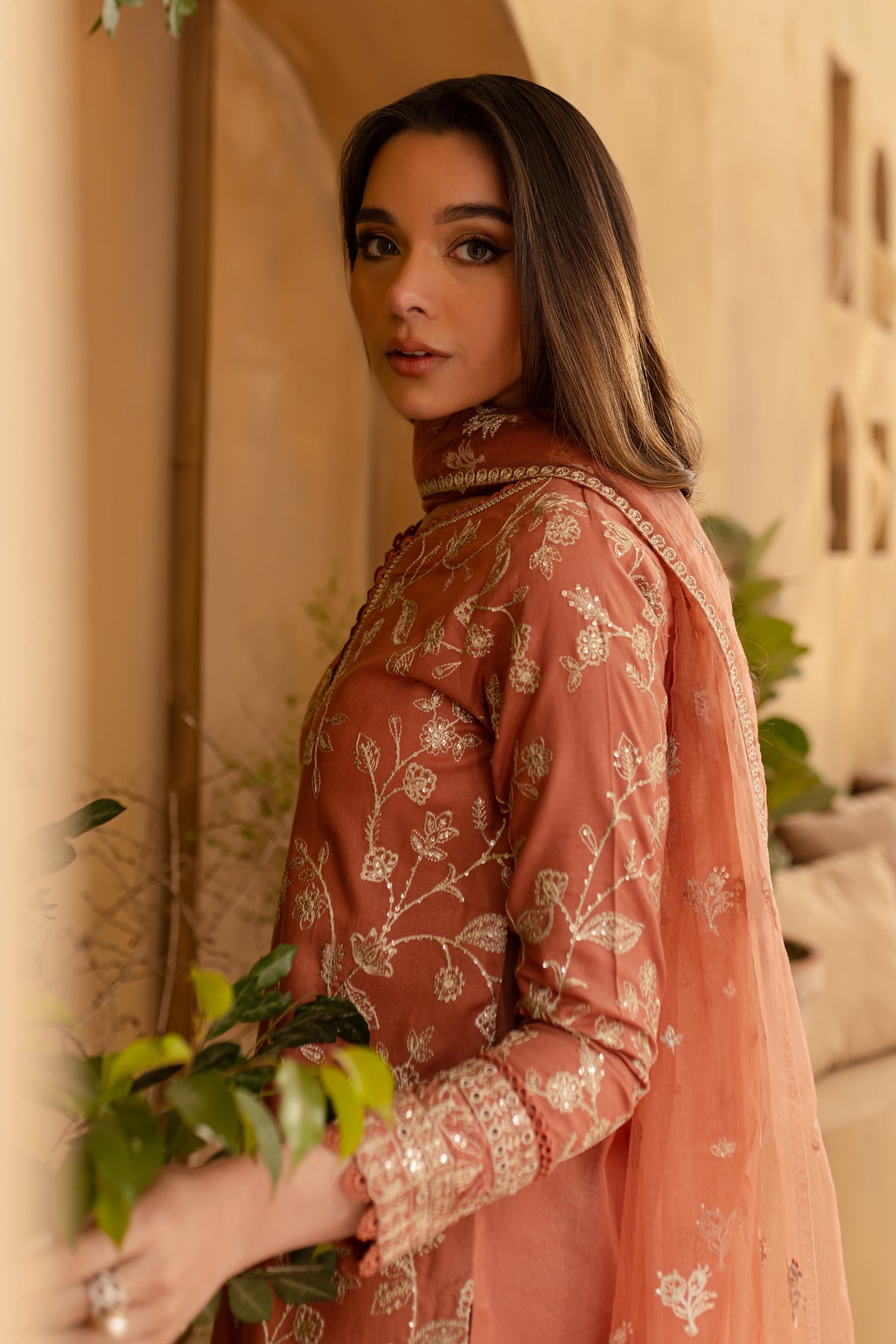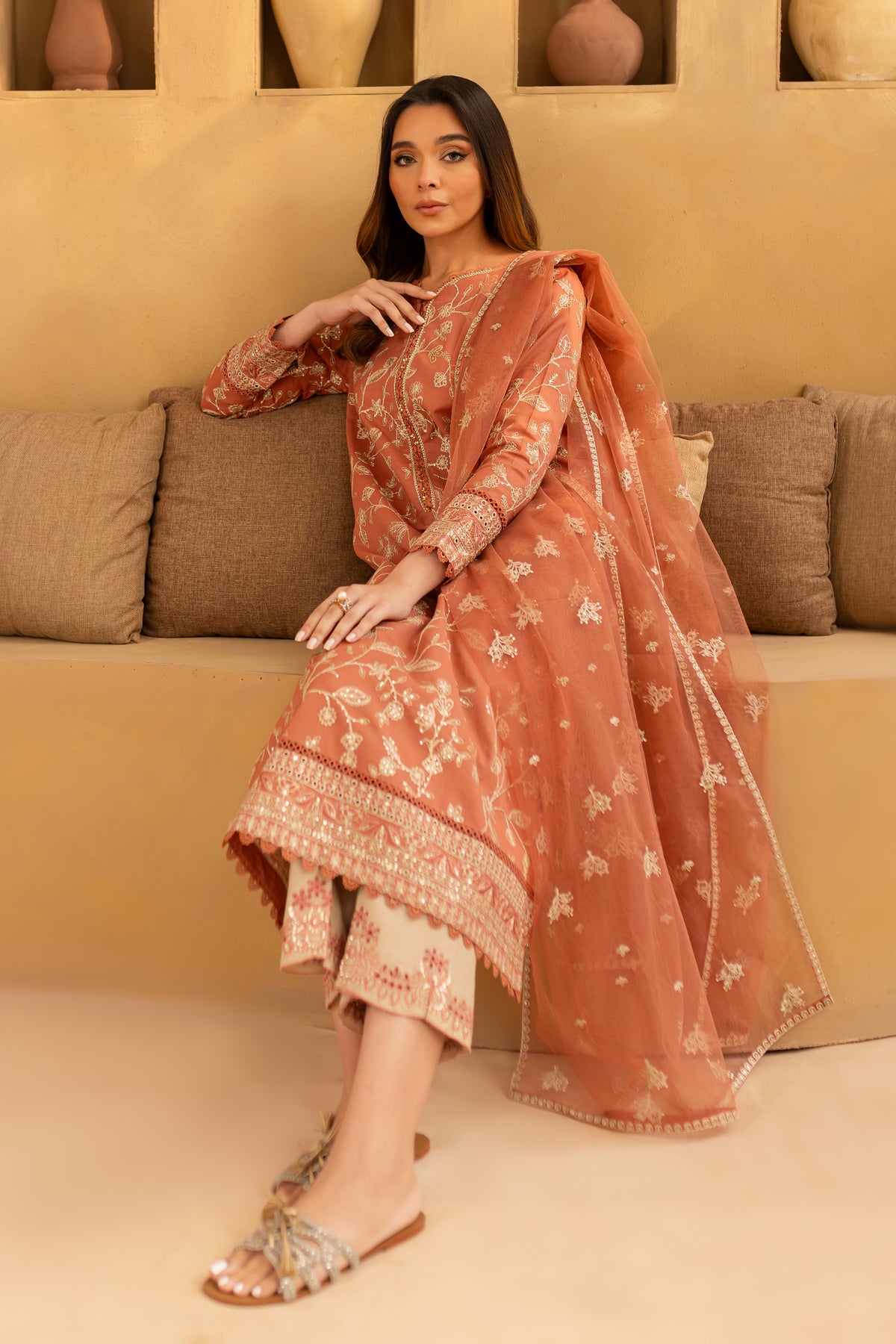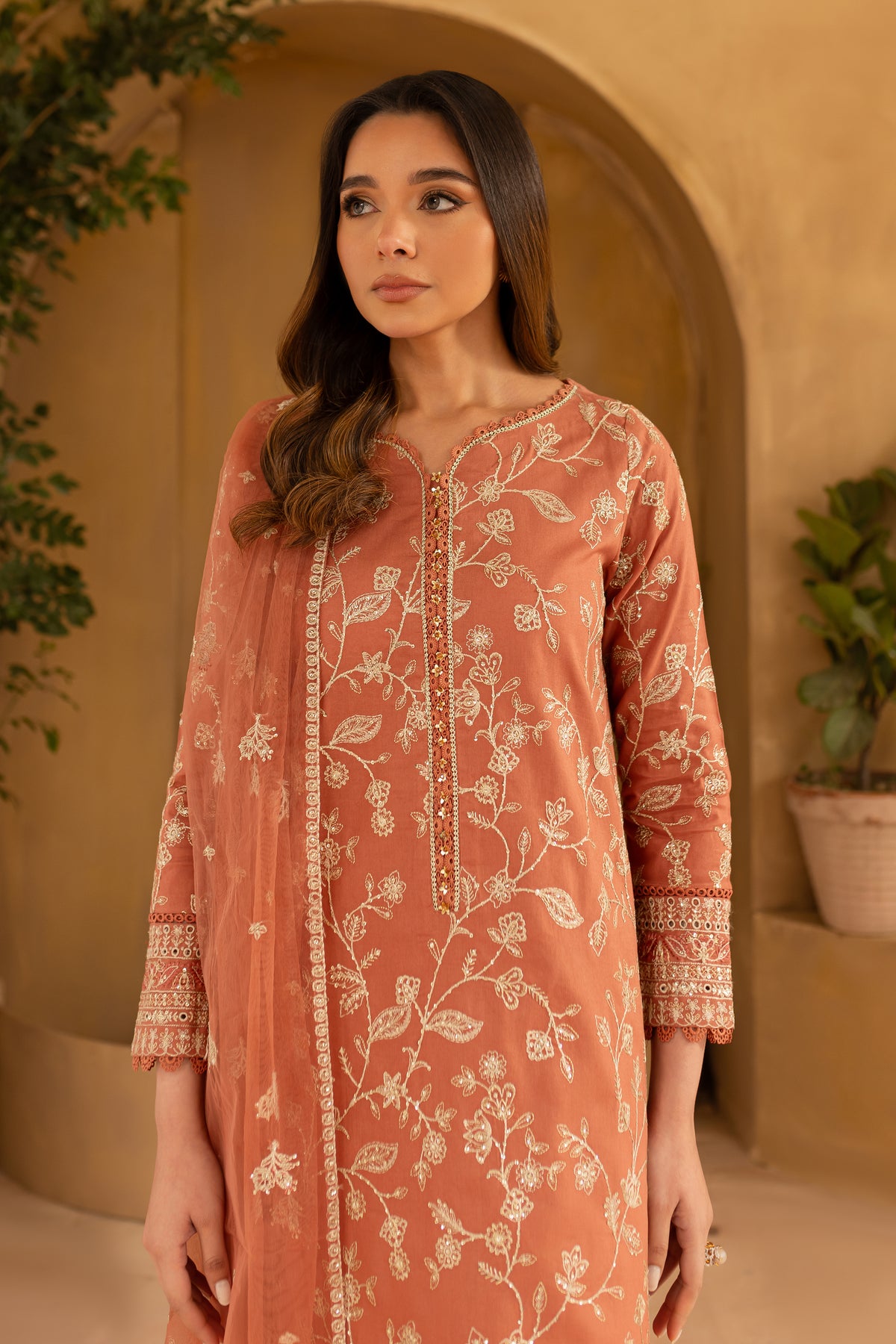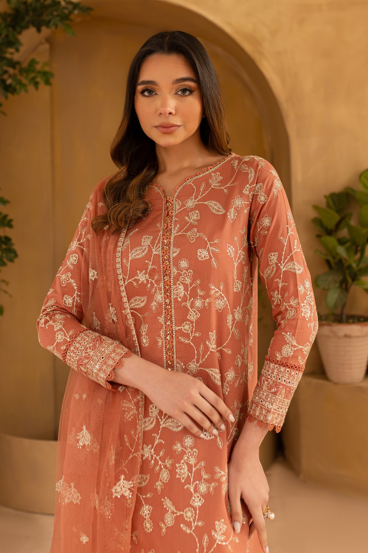 This stunning 3-piece peach Khaddar set features a long, elegantly embroidered shirt. The intricate embroidery all over the shirt is adorning the entire fabric for a rich, luxurious look. The fitted sleeves, showcasing exquisite detailing adds sophistication to the design.