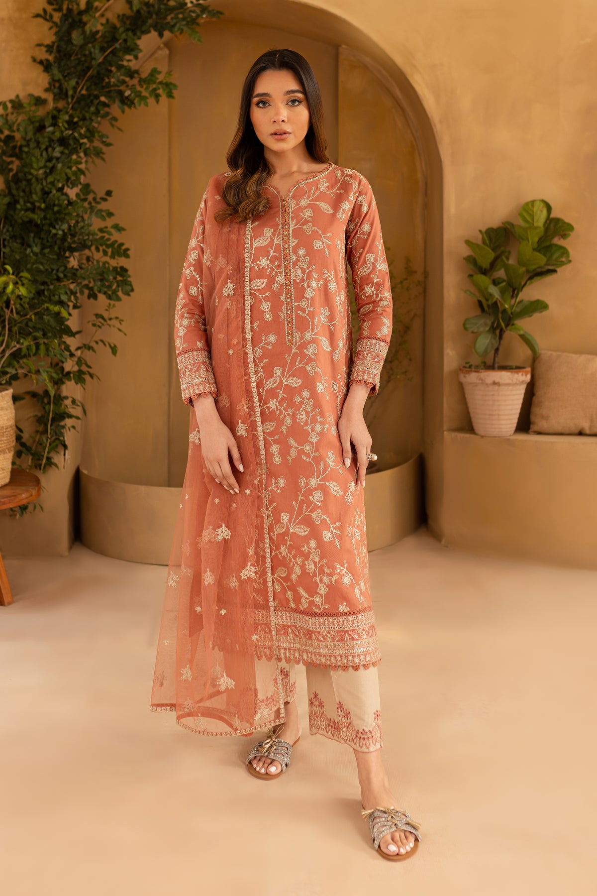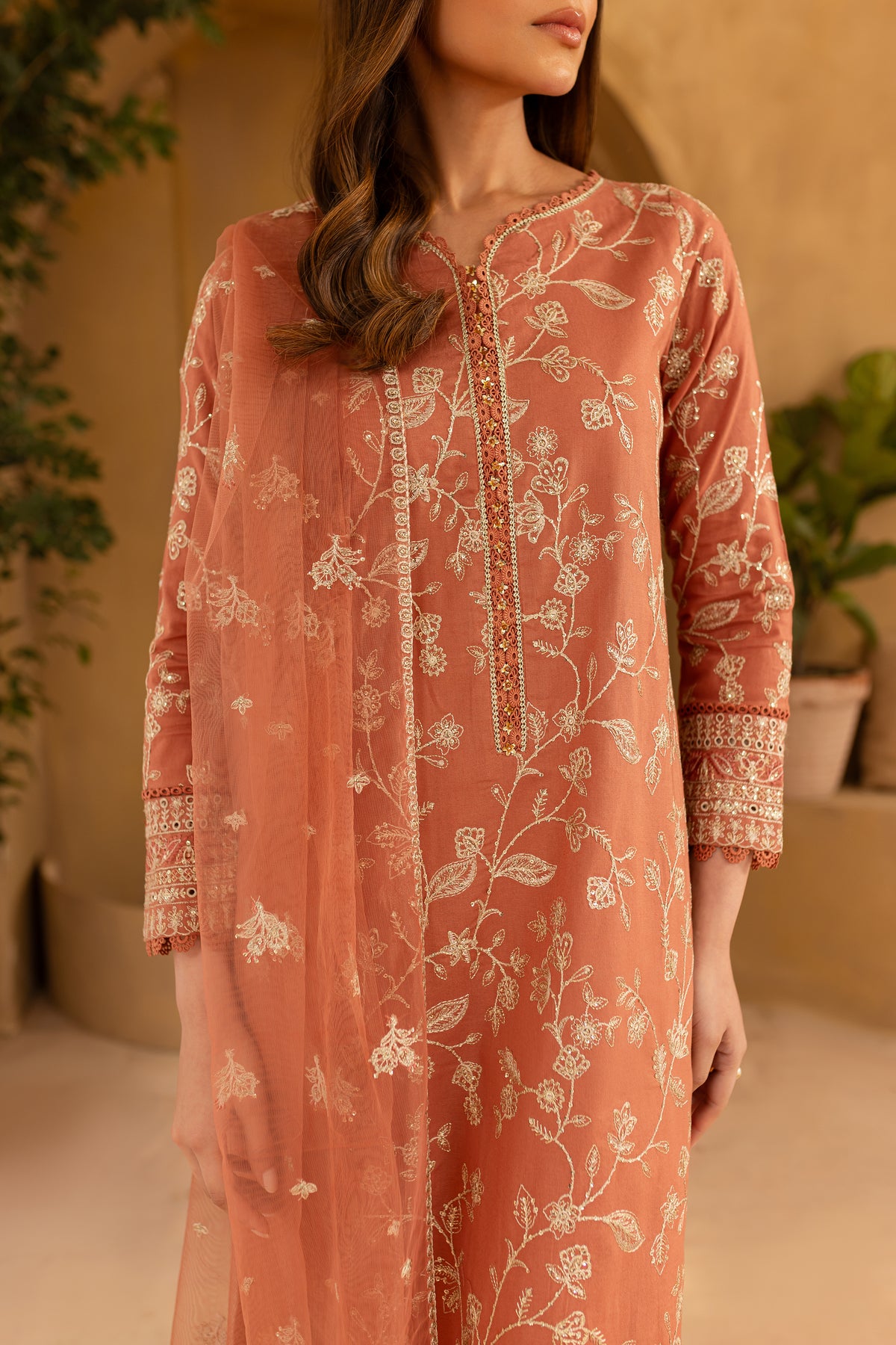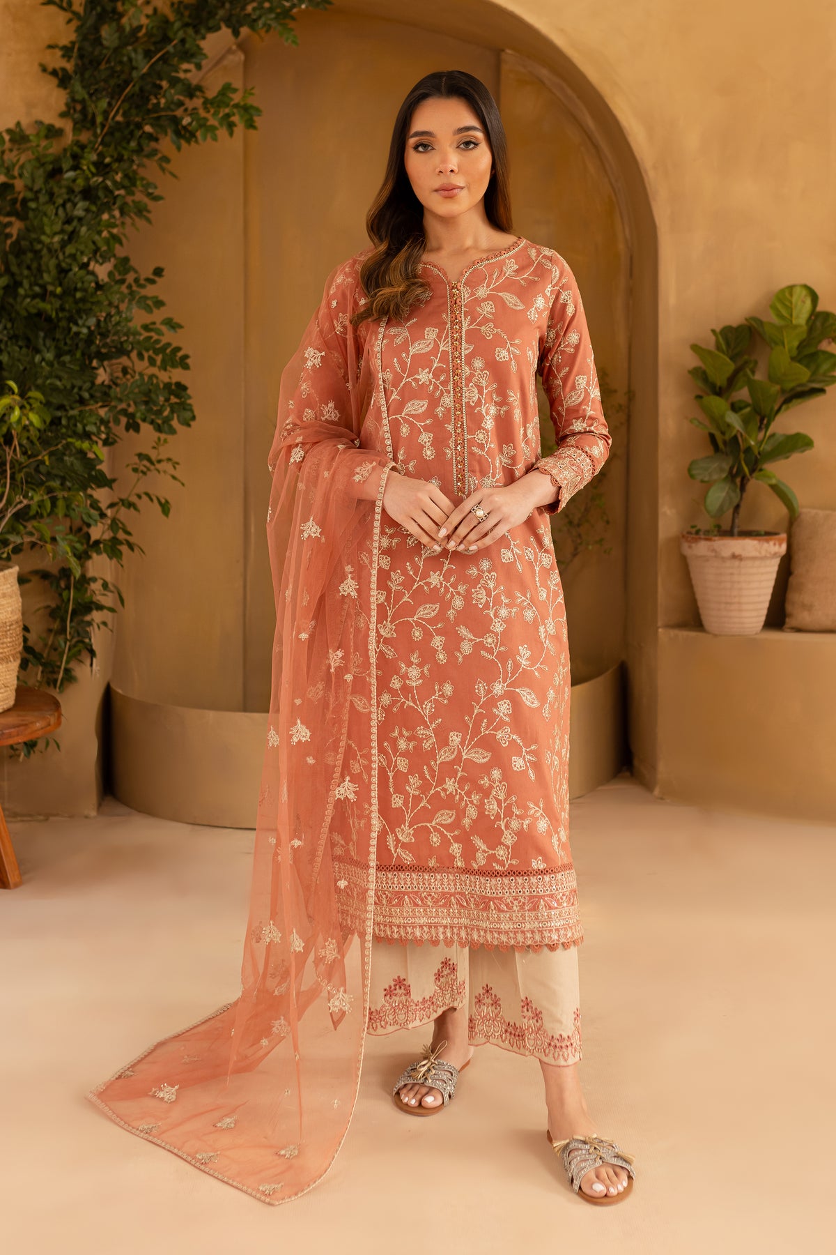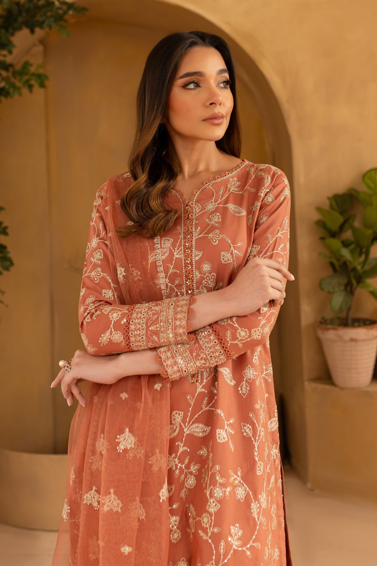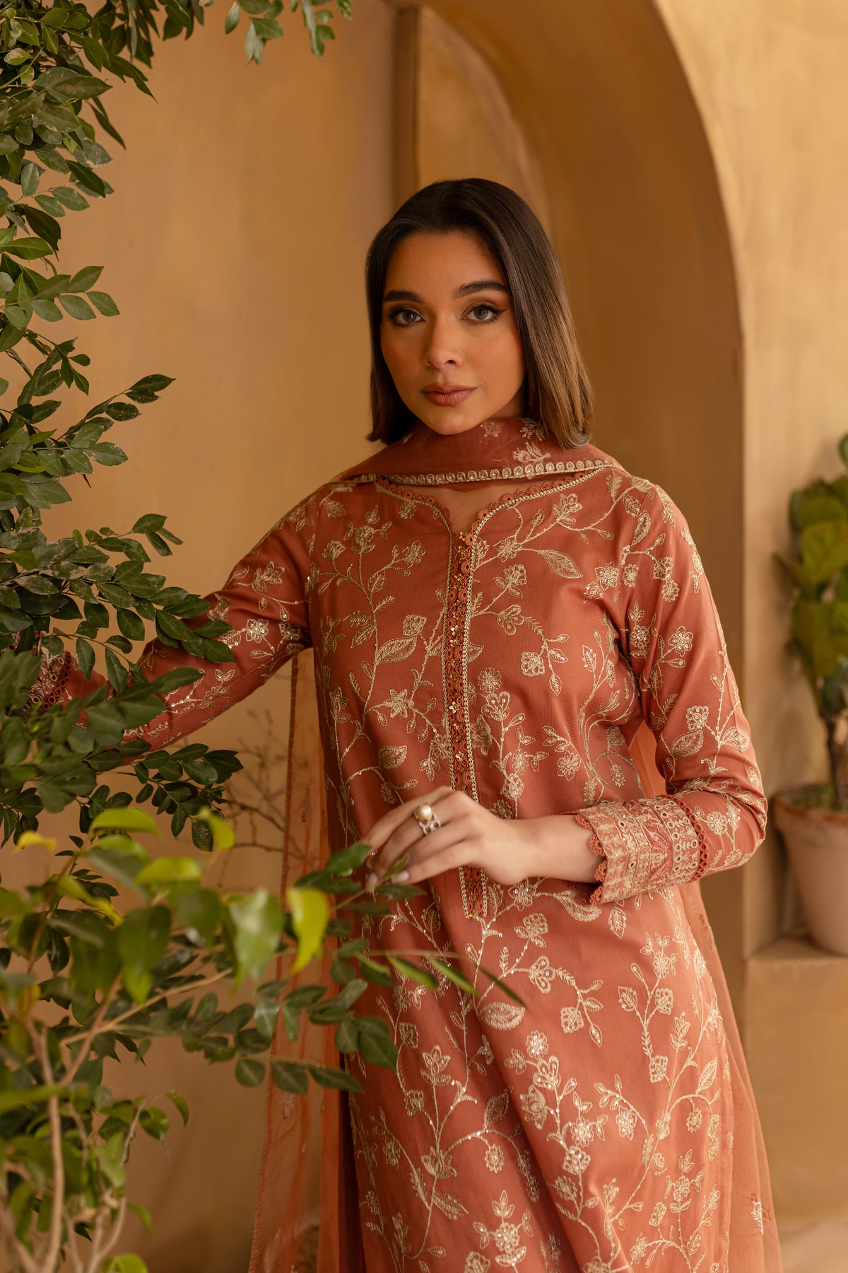 This stunning 3-piece peach Khaddar set features a long, elegantly embroidered shirt. The intricate embroidery all over the shirt is adorning the entire fabric for a rich, luxurious look. The fitted sleeves, showcasing exquisite detailing adds sophistication to the design.