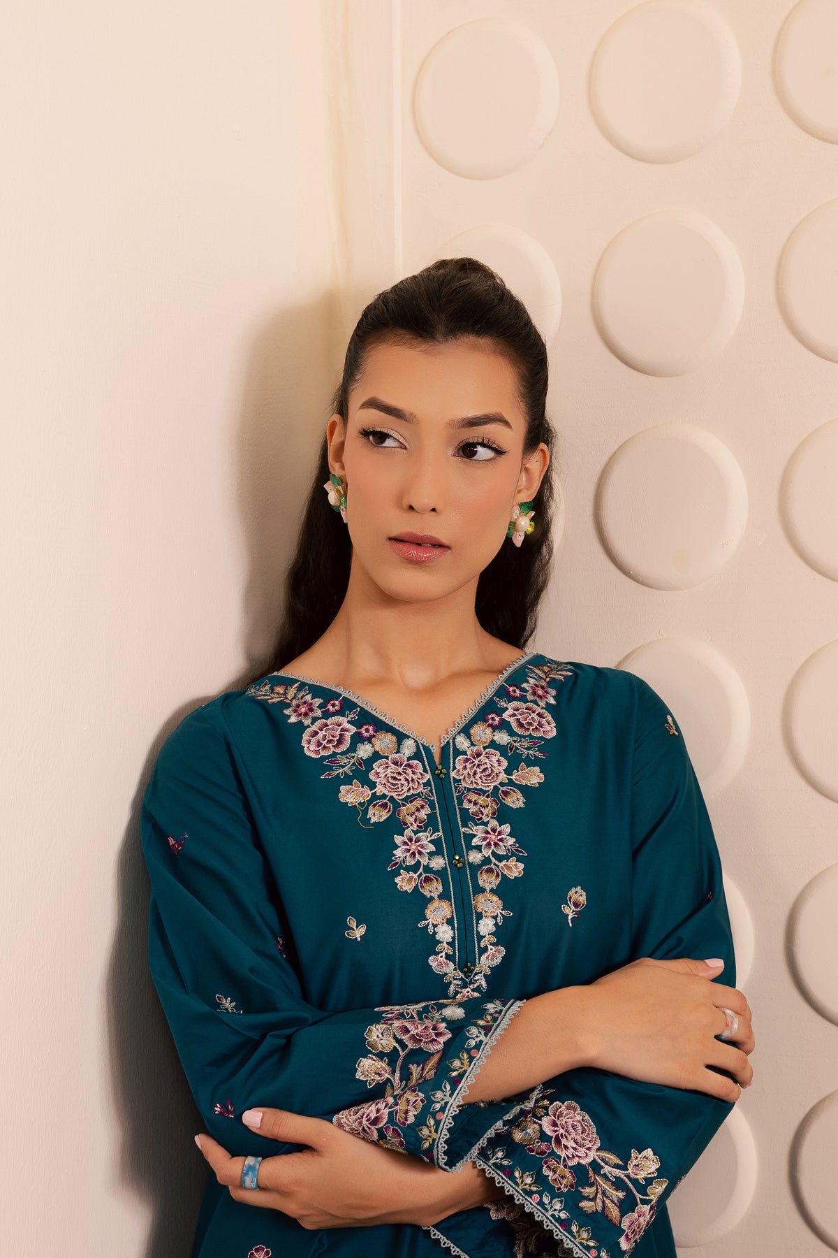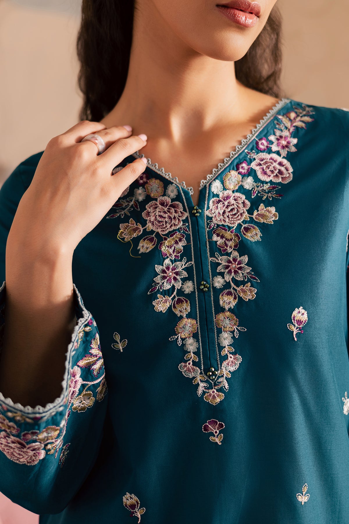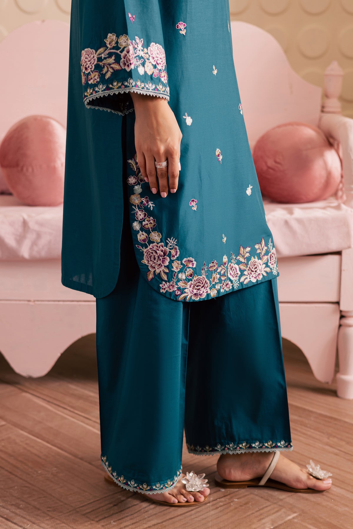 A beautifully crafted zinc blue pima lawn shirt featuring an embroidered spread and a V neckline delicately finished with simple lace, complemented by a rounded hem for a soft, feminine touch. The wide sleeves are adorned with embroidered borders and motifs, also finished with lace for added elegance.