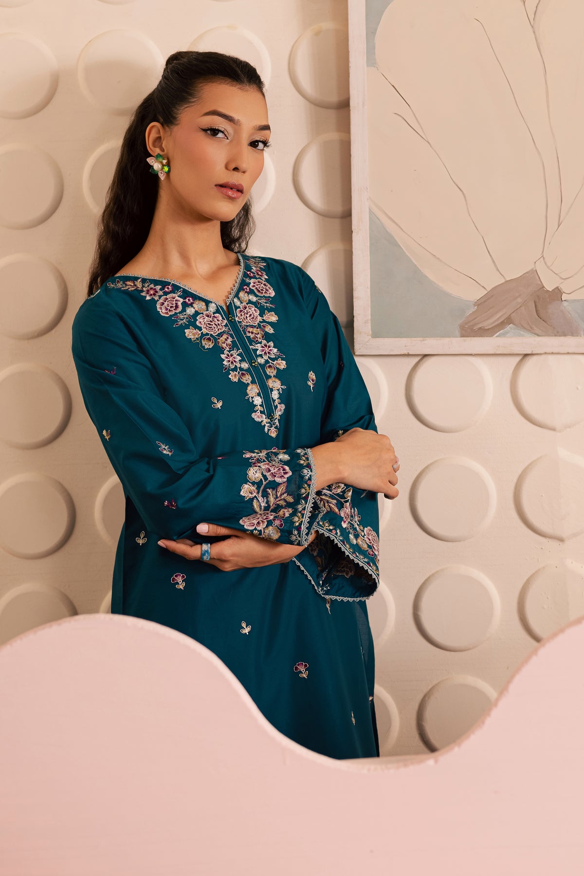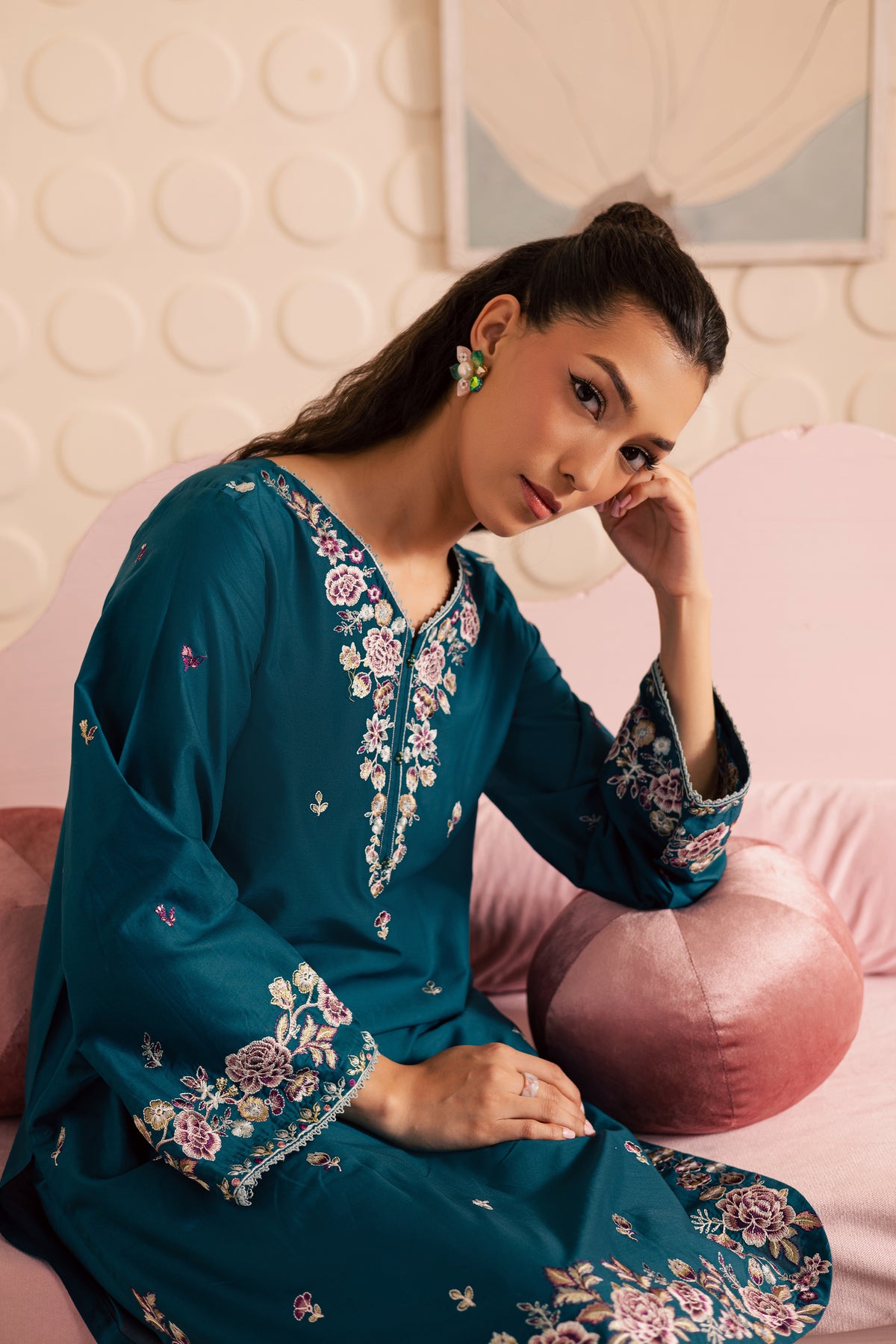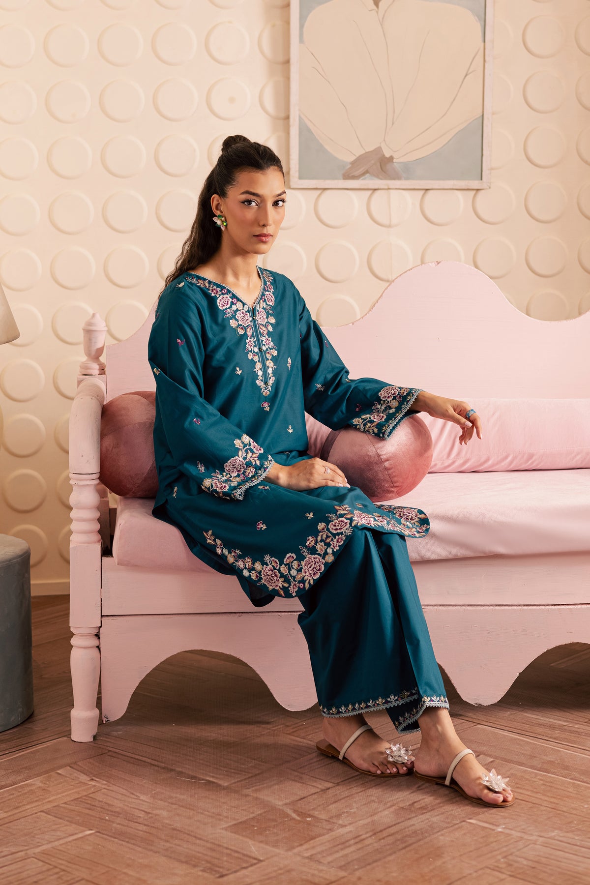 A beautifully crafted zinc blue pima lawn shirt featuring an embroidered spread and a V neckline delicately finished with simple lace, complemented by a rounded hem for a soft, feminine touch. The wide sleeves are adorned with embroidered borders and motifs, also finished with lace for added elegance.