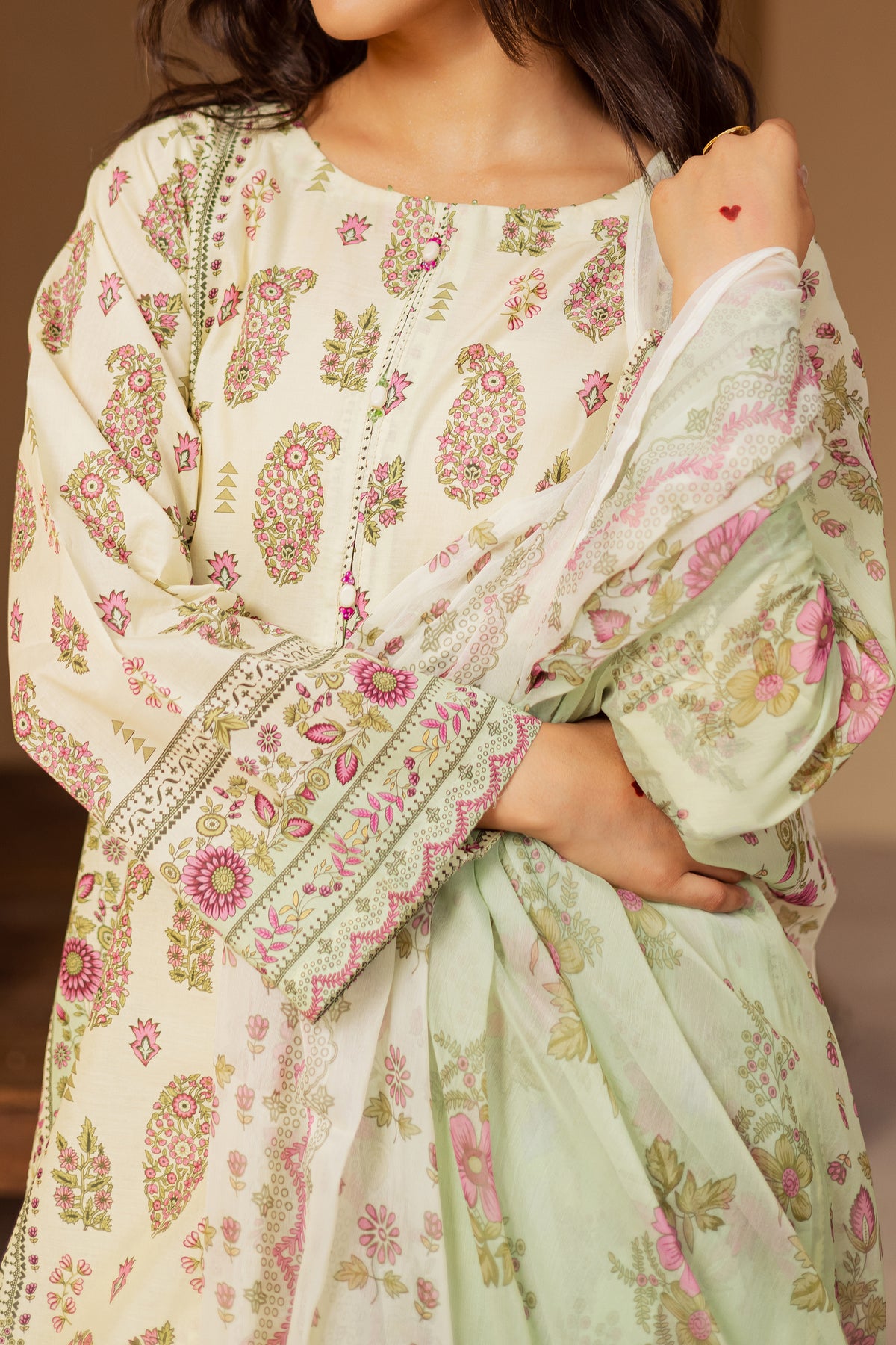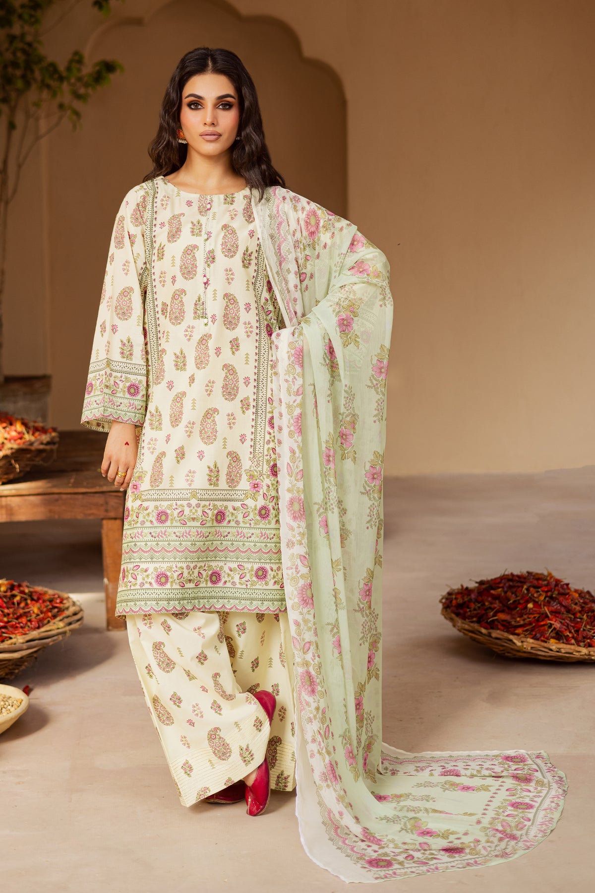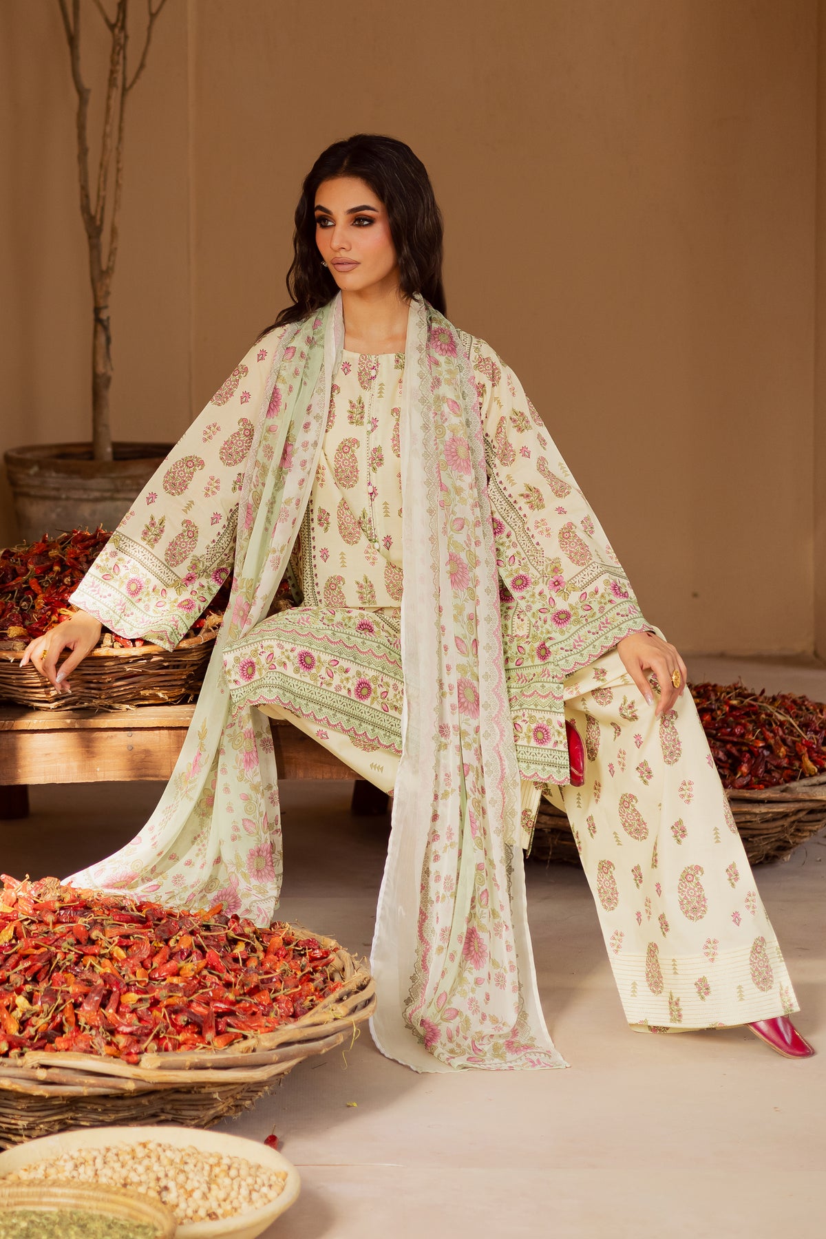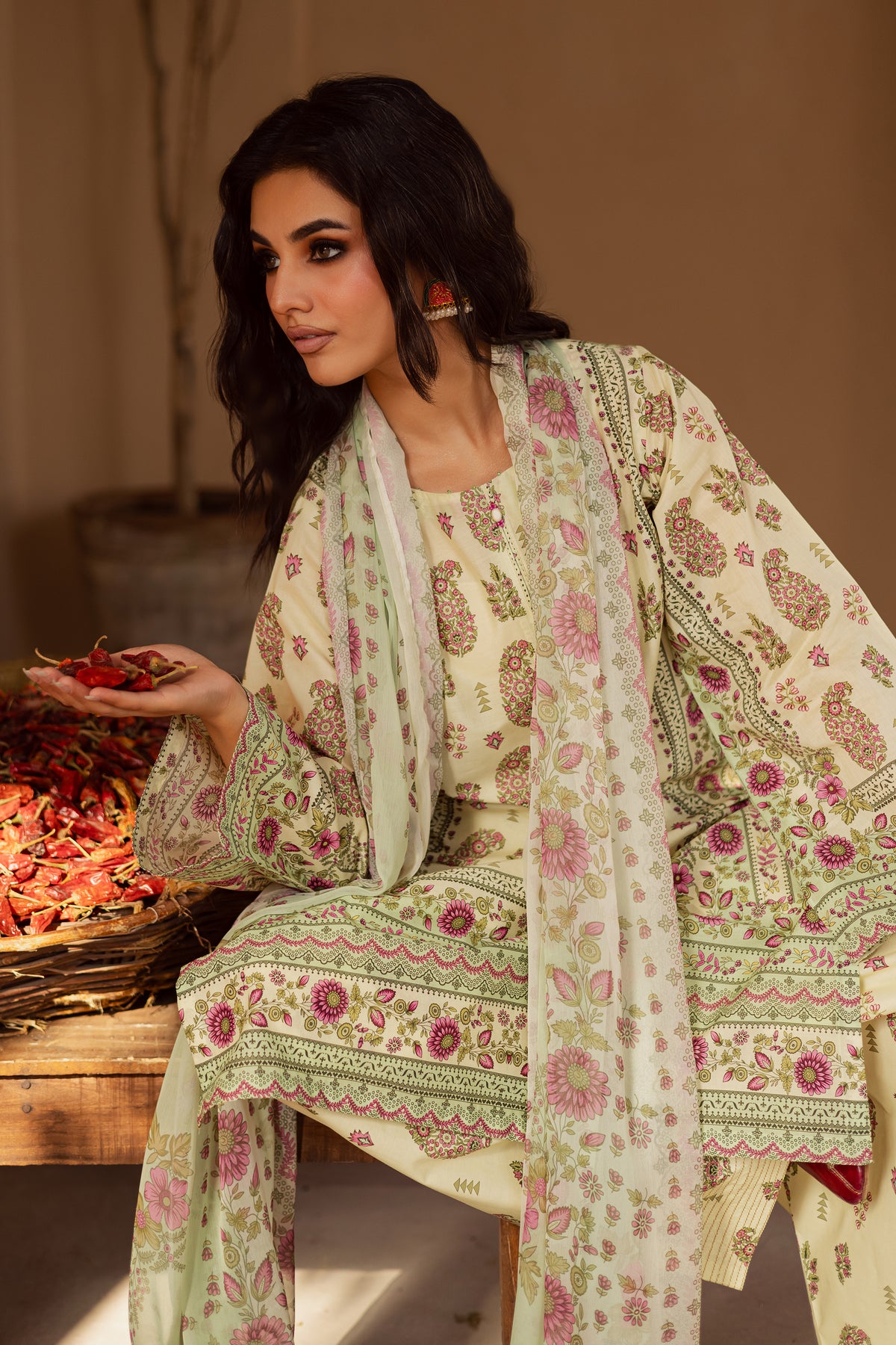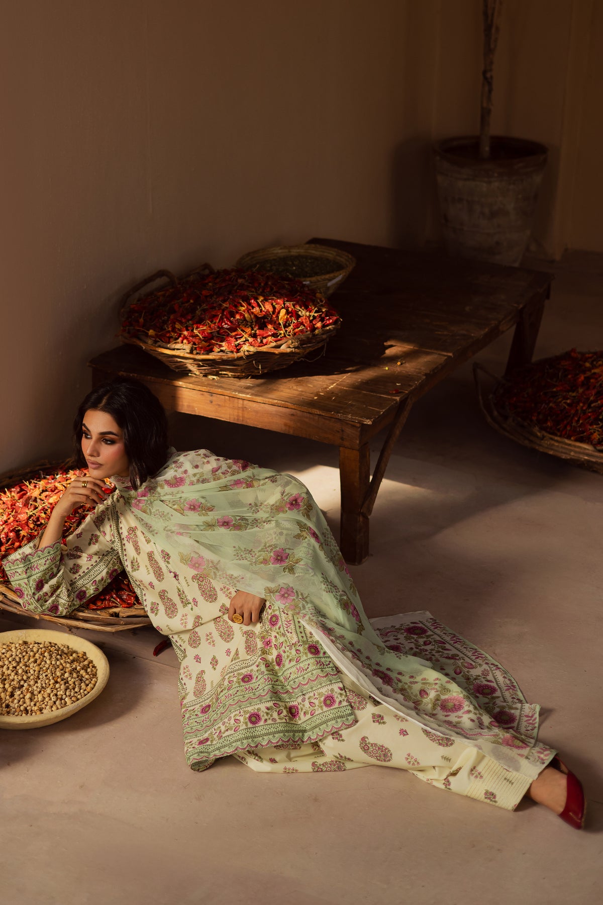 A chiffon printed dupatta completes the look, bringing a soft and flowing element that enhances the overall grace of the ensemble.