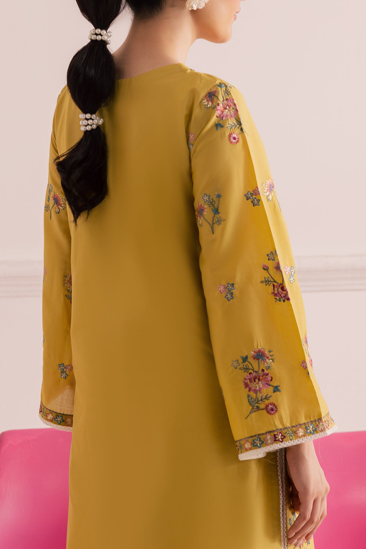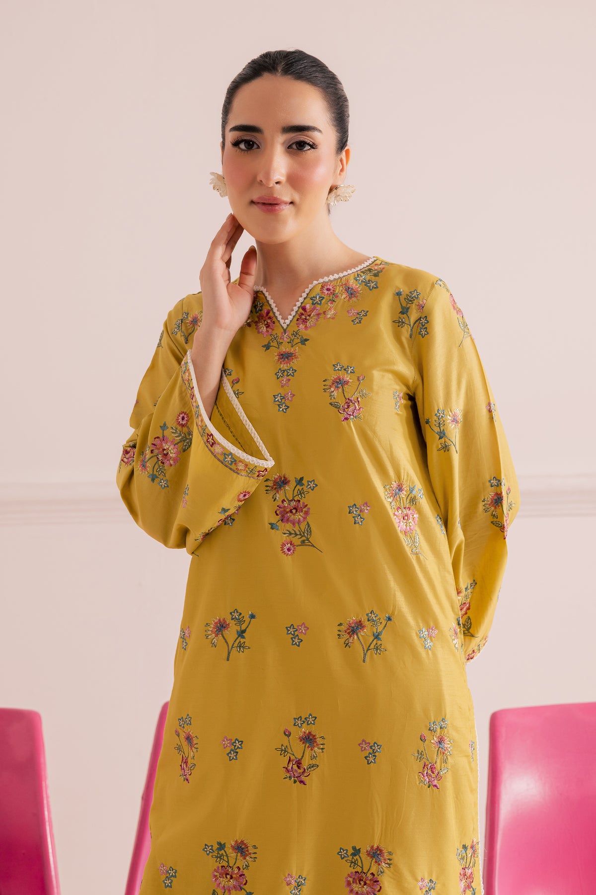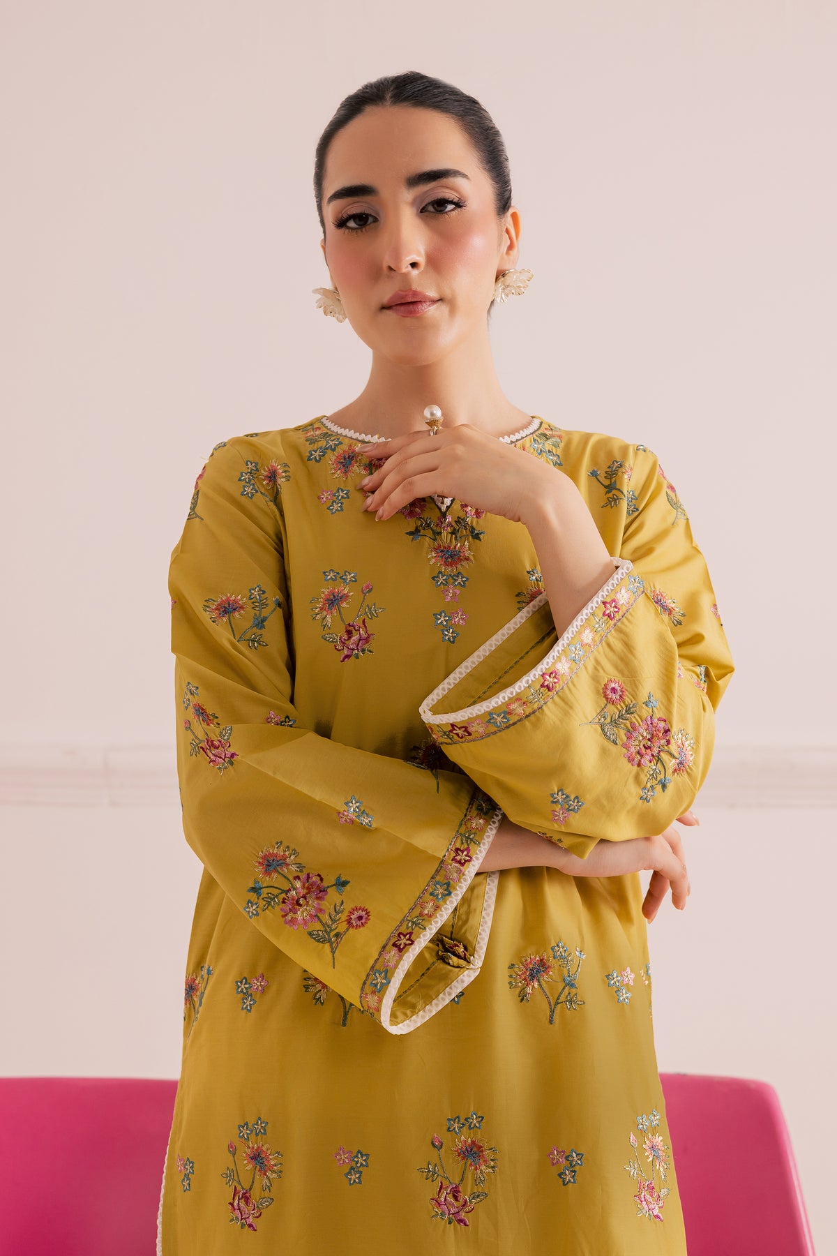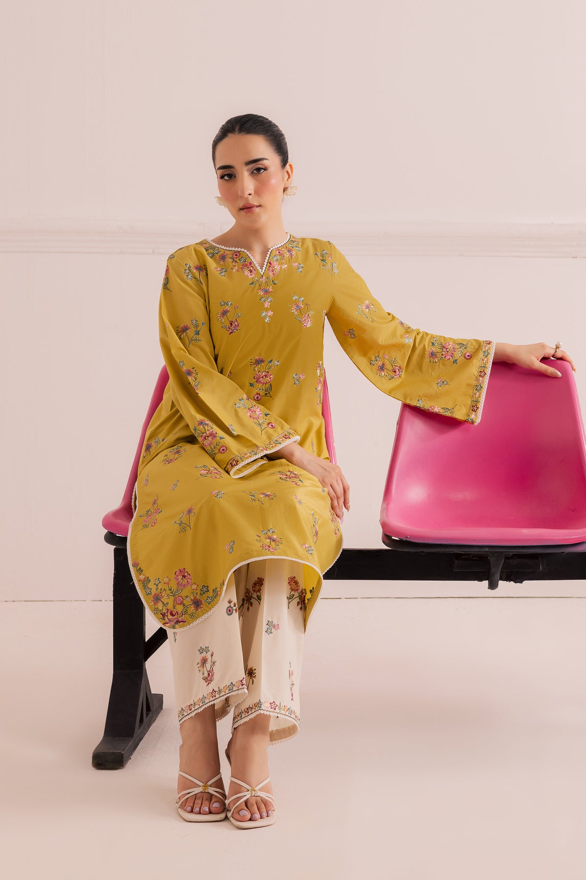This refreshing knee-length lime yellow pima lawn shirt in a soft lemonade hue features a minimally embroidered neckline with a composed spread and delicate embroidery on the chaaks. Bell sleeves adorned with embroidered borders add a graceful touch, while piping and lace around the hem, neckline, and sleeves complete the look with refined detailing.
