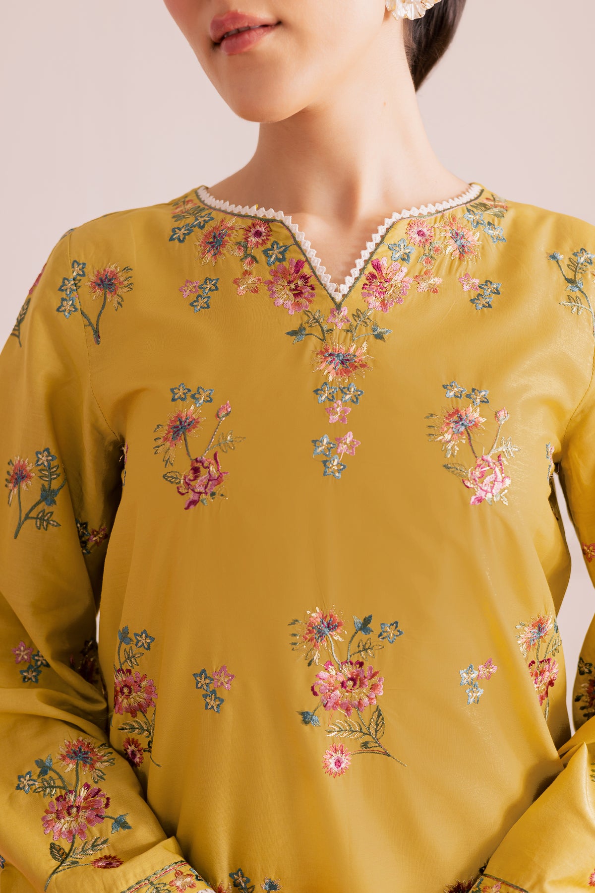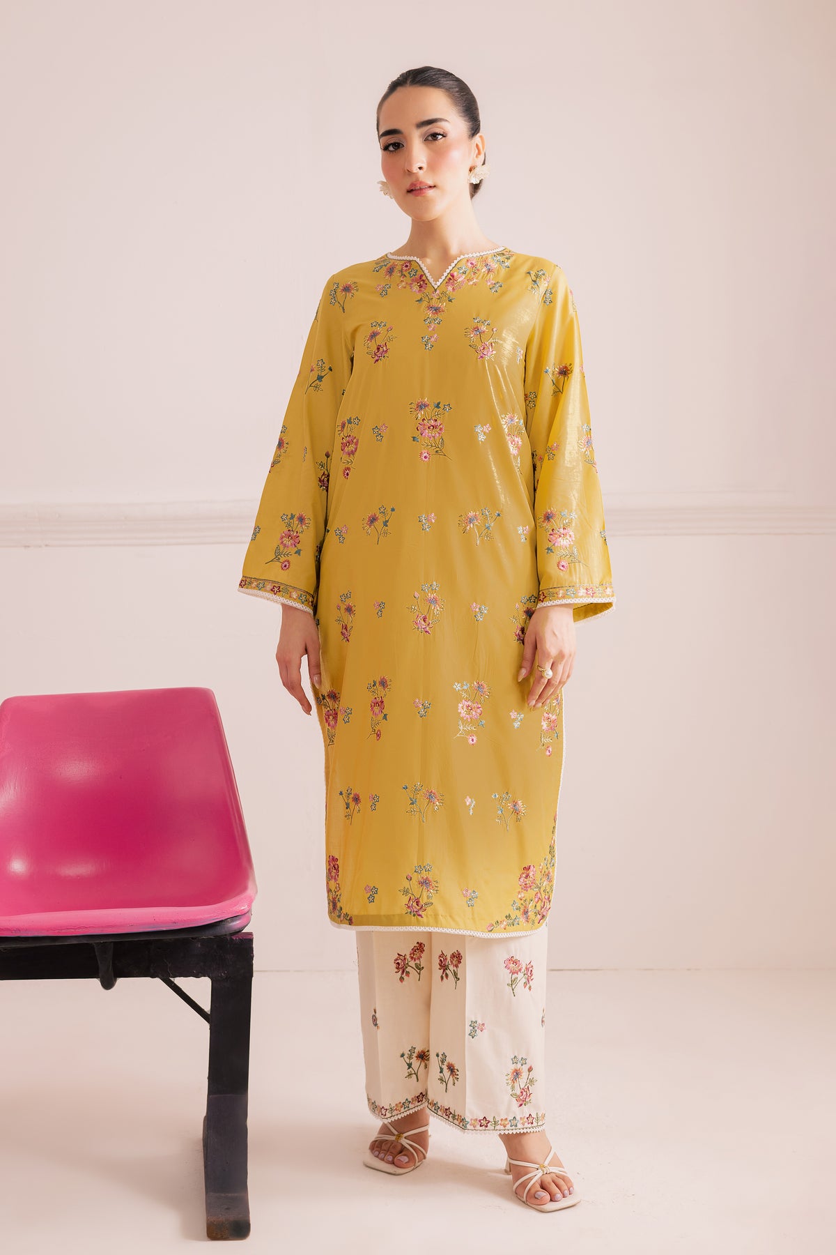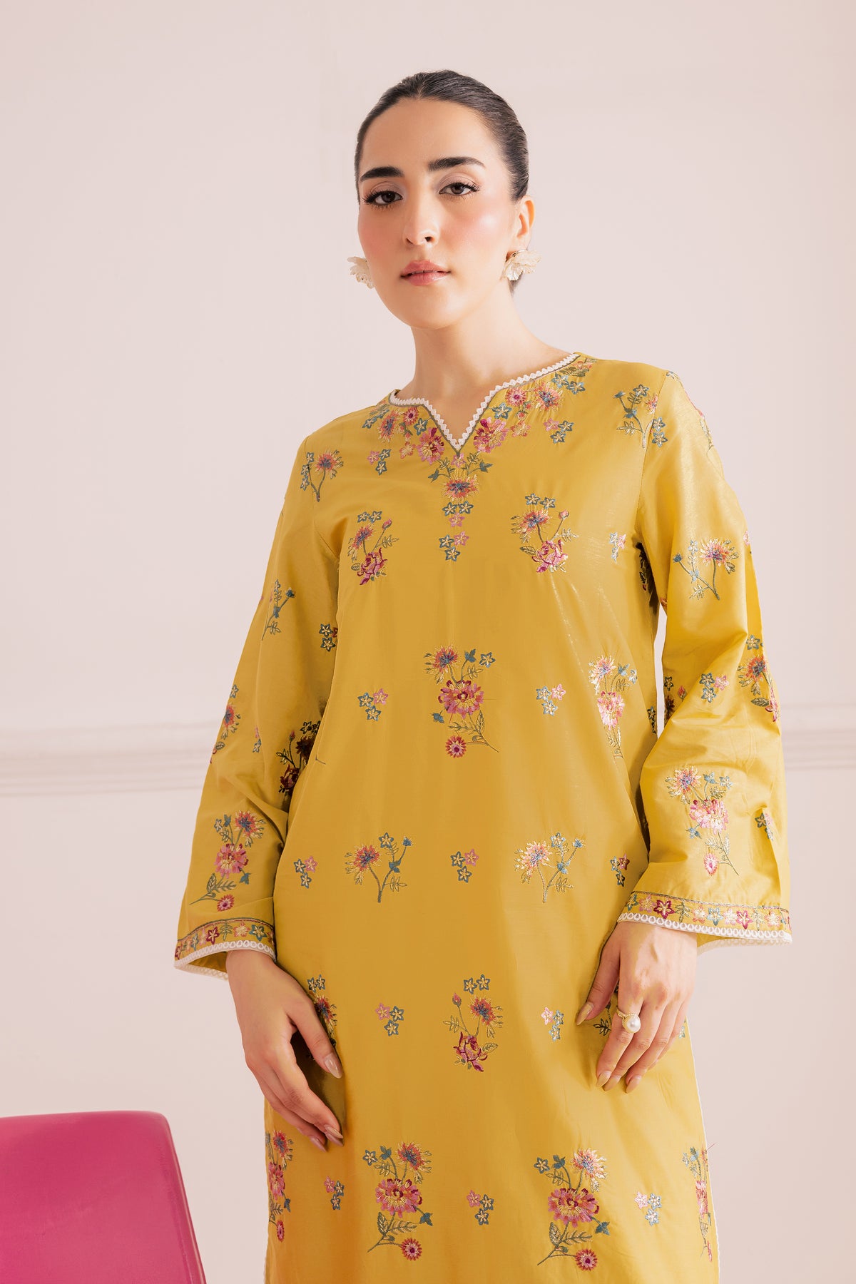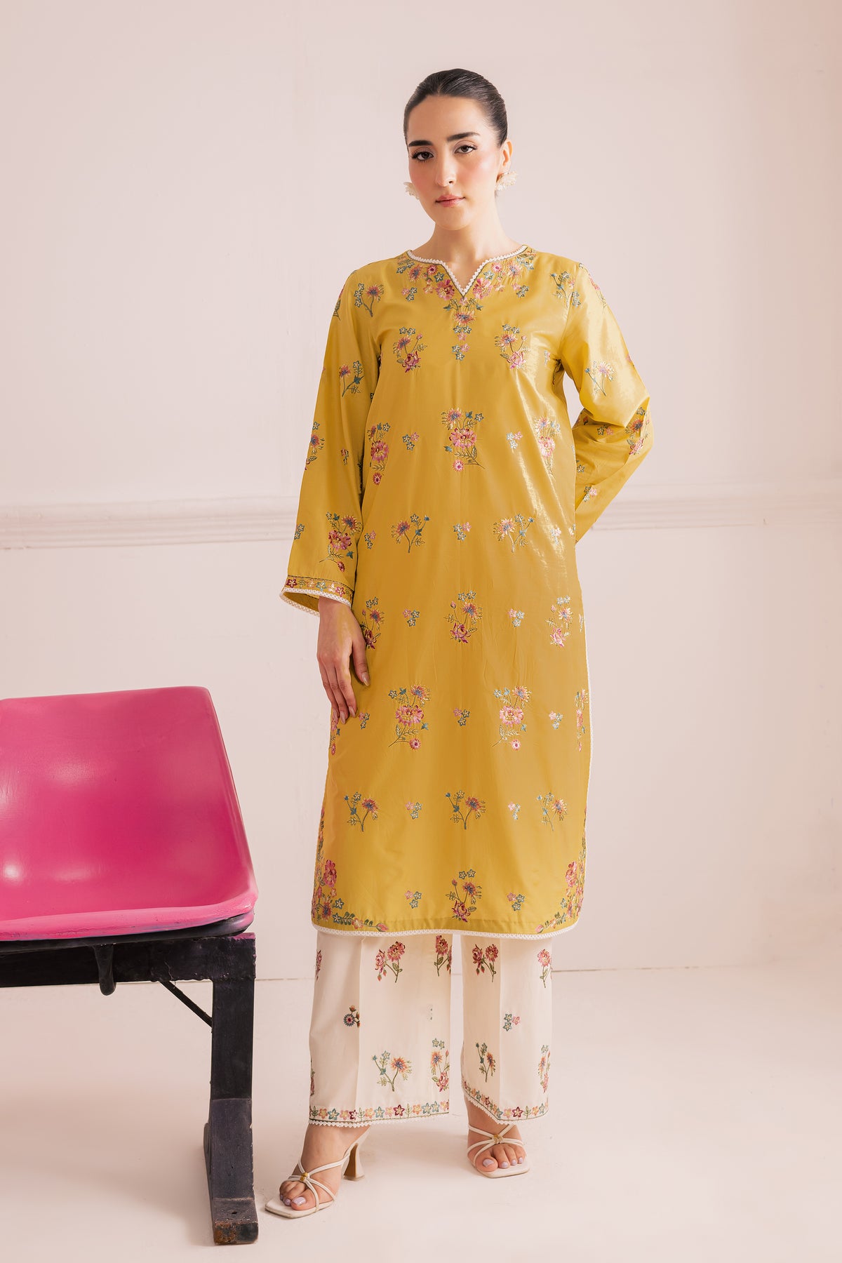 This refreshing knee-length lime yellow pima lawn shirt in a soft lemonade hue features a minimally embroidered neckline with a composed spread and delicate embroidery on the chaaks. Bell sleeves adorned with embroidered borders add a graceful touch, while piping and lace around the hem, neckline, and sleeves complete the look with refined detailing.