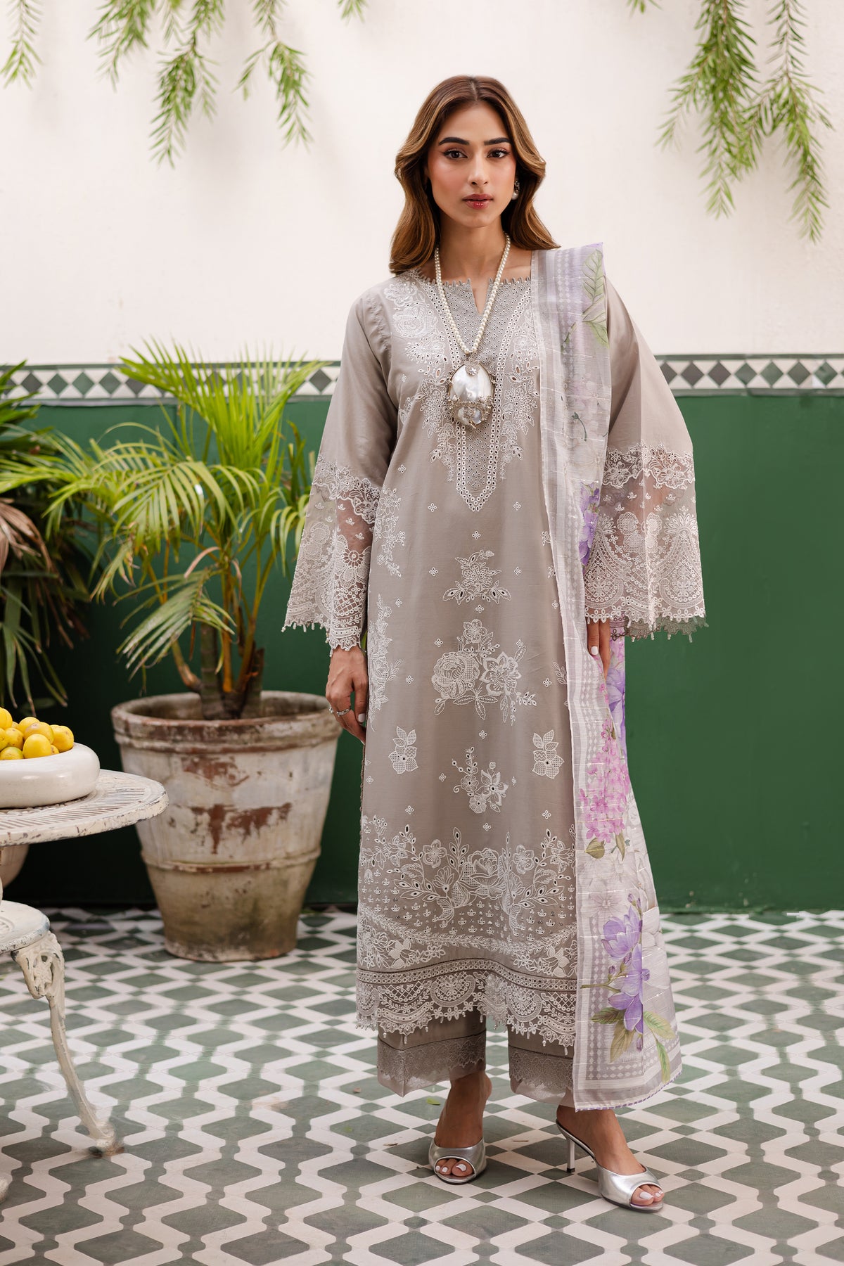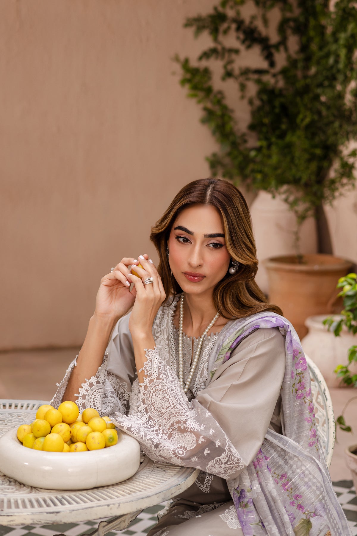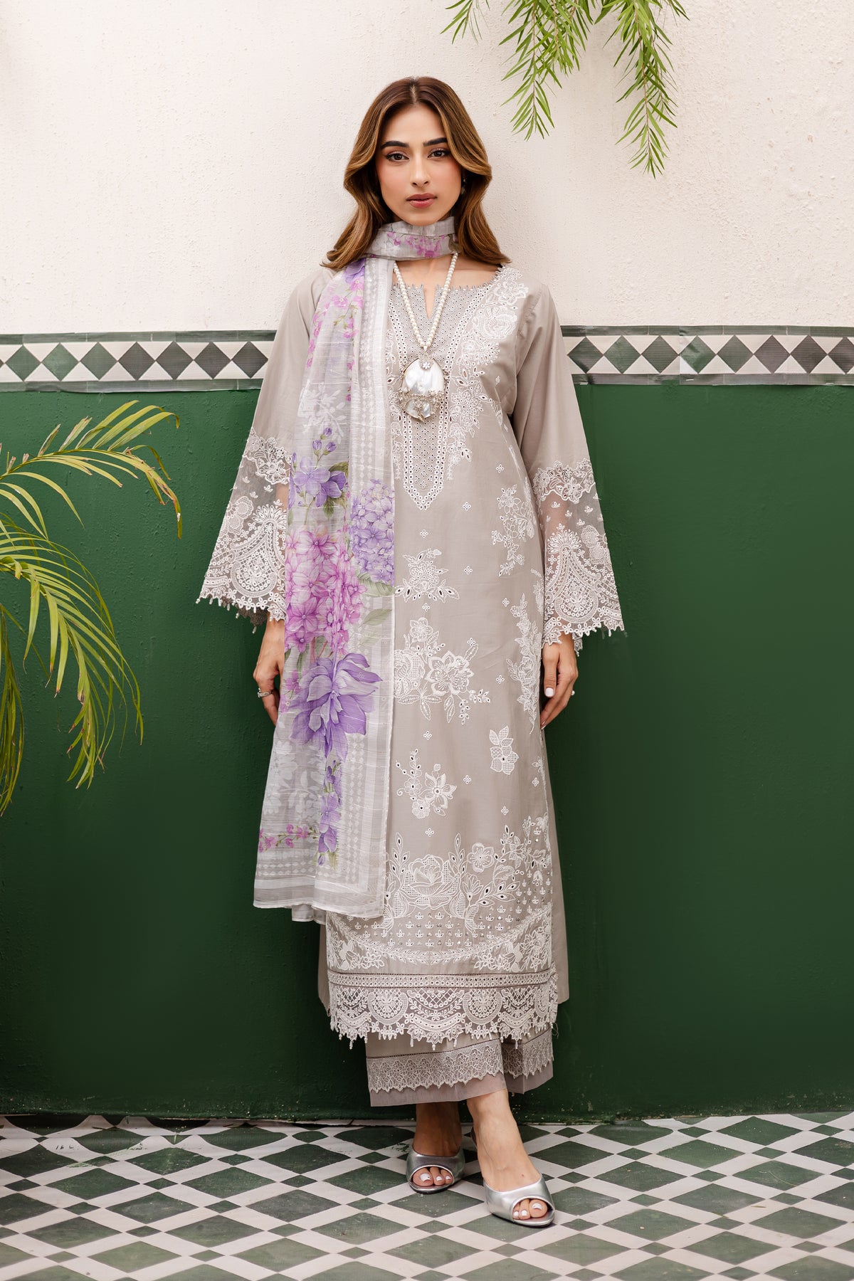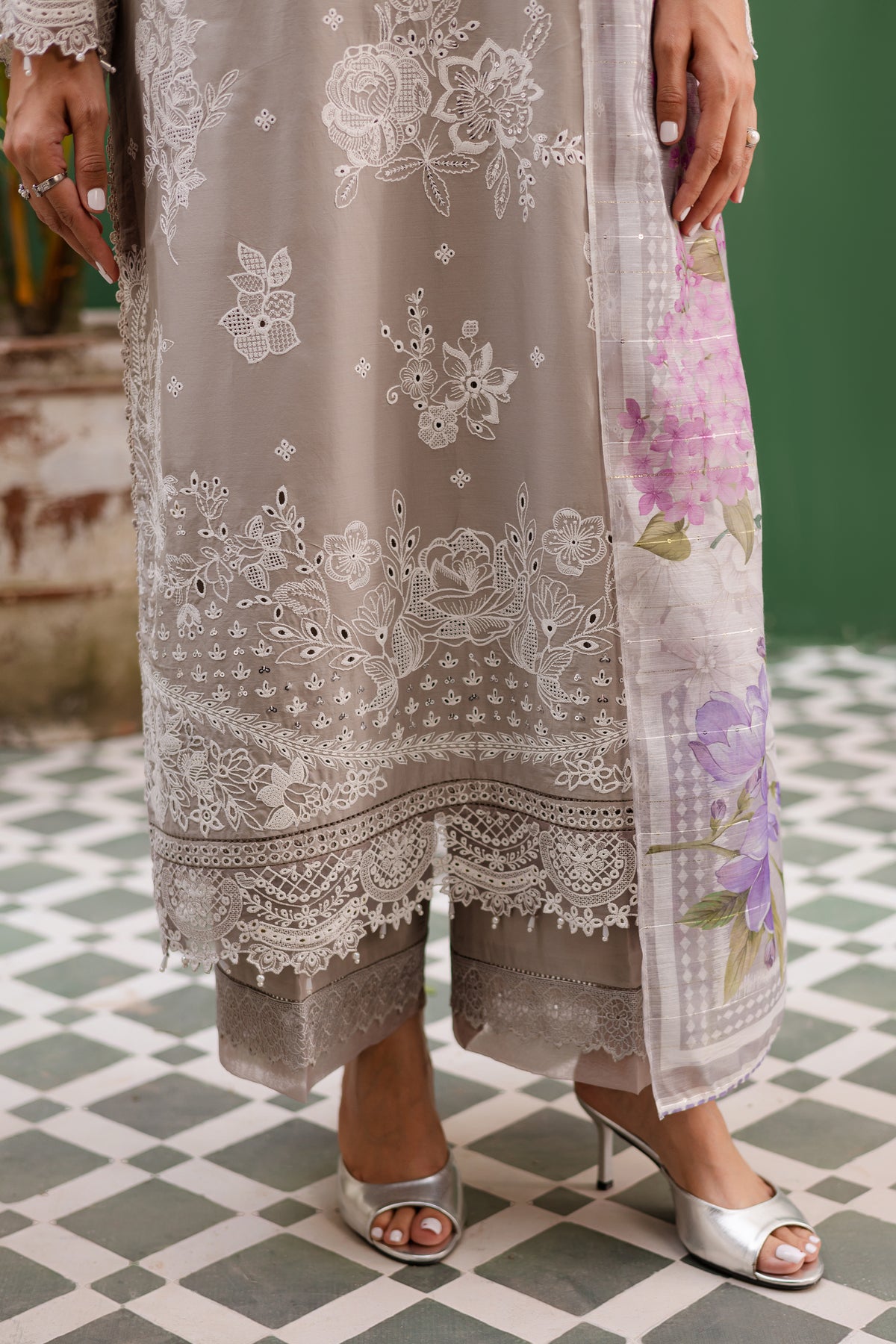 Exude effortless charm with this beautifully crafted pima lawn grey shirt featuring a fully composed embroidered front. The design is elevated with embroidered organza borders and a graceful scalloped hem, finished with delicate bead hangings that add movement and elegance. The sleeves are equally detailed with full embroidery, organza borders, and subtle pearl accents for a refined finish.