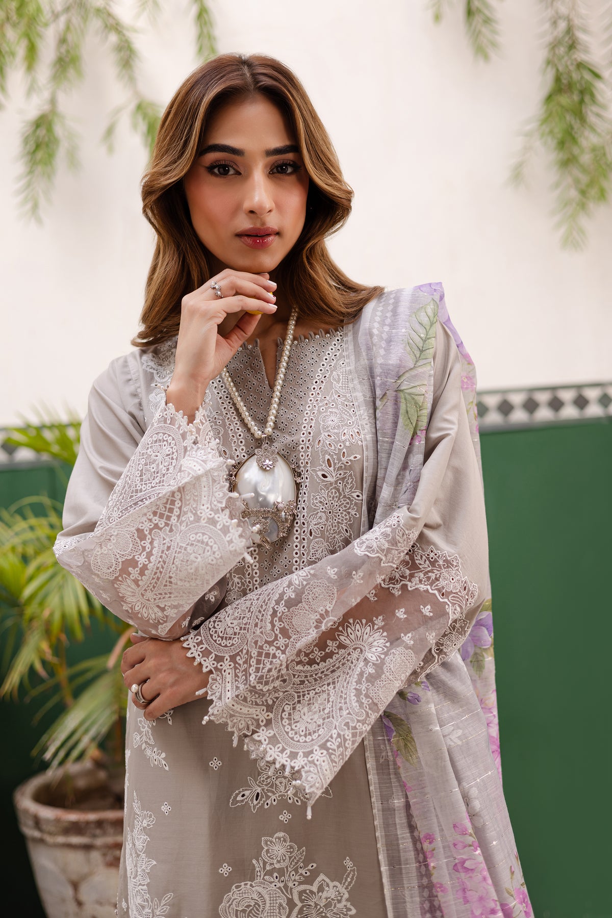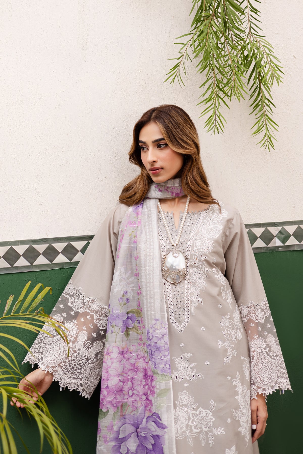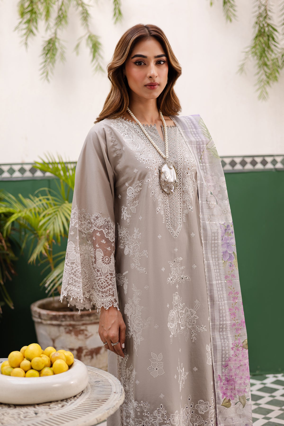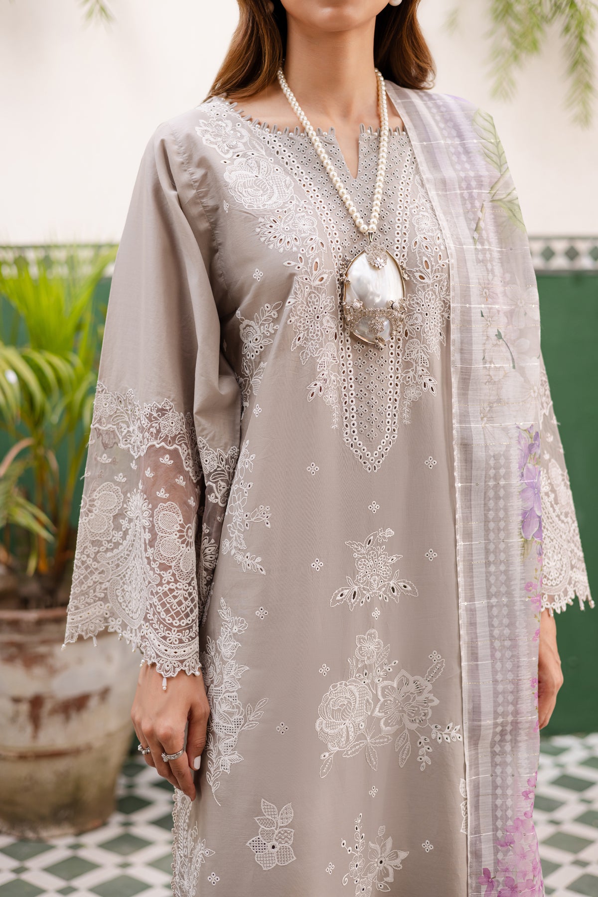 Exude effortless charm with this beautifully crafted pima lawn grey shirt featuring a fully composed embroidered front. The design is elevated with embroidered organza borders and a graceful scalloped hem, finished with delicate bead hangings that add movement and elegance. The sleeves are equally detailed with full embroidery, organza borders, and subtle pearl accents for a refined finish.
