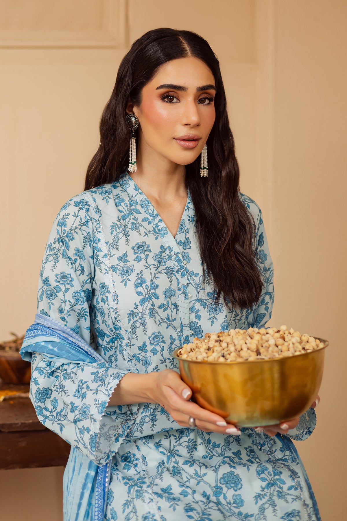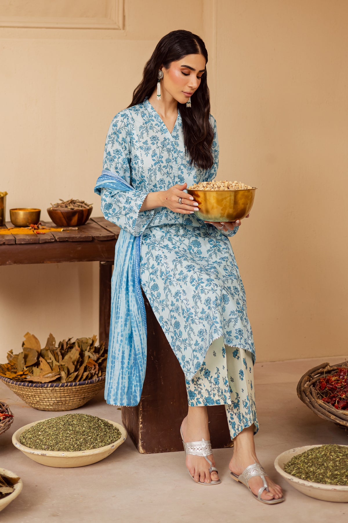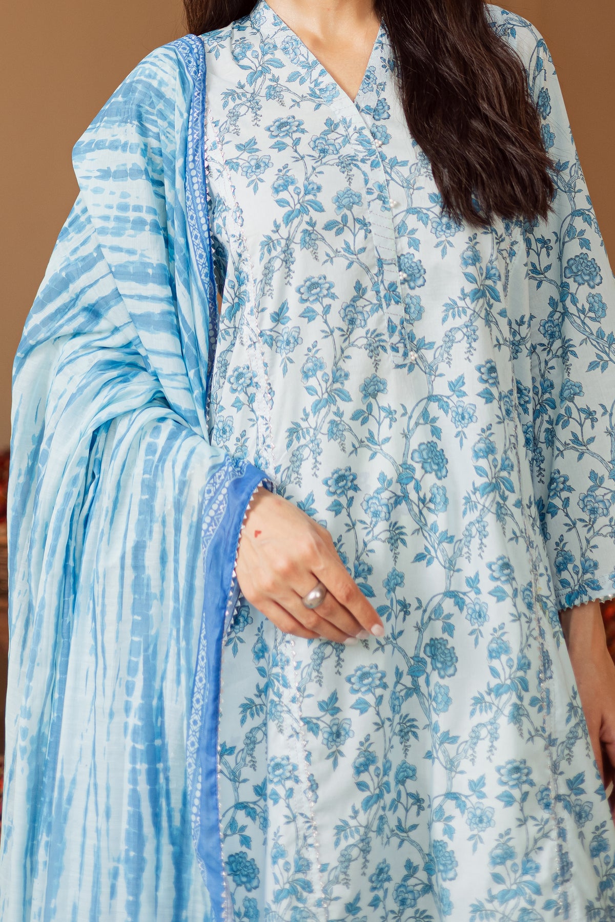 Crumble 3Pc features a refreshing ice blue lawn digital printed long length shirt, subtly embellished at the neckline and sleeves, and finished with delicate lace for a soft, feminine touch.