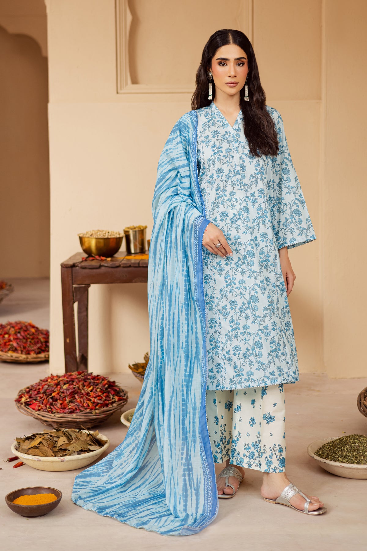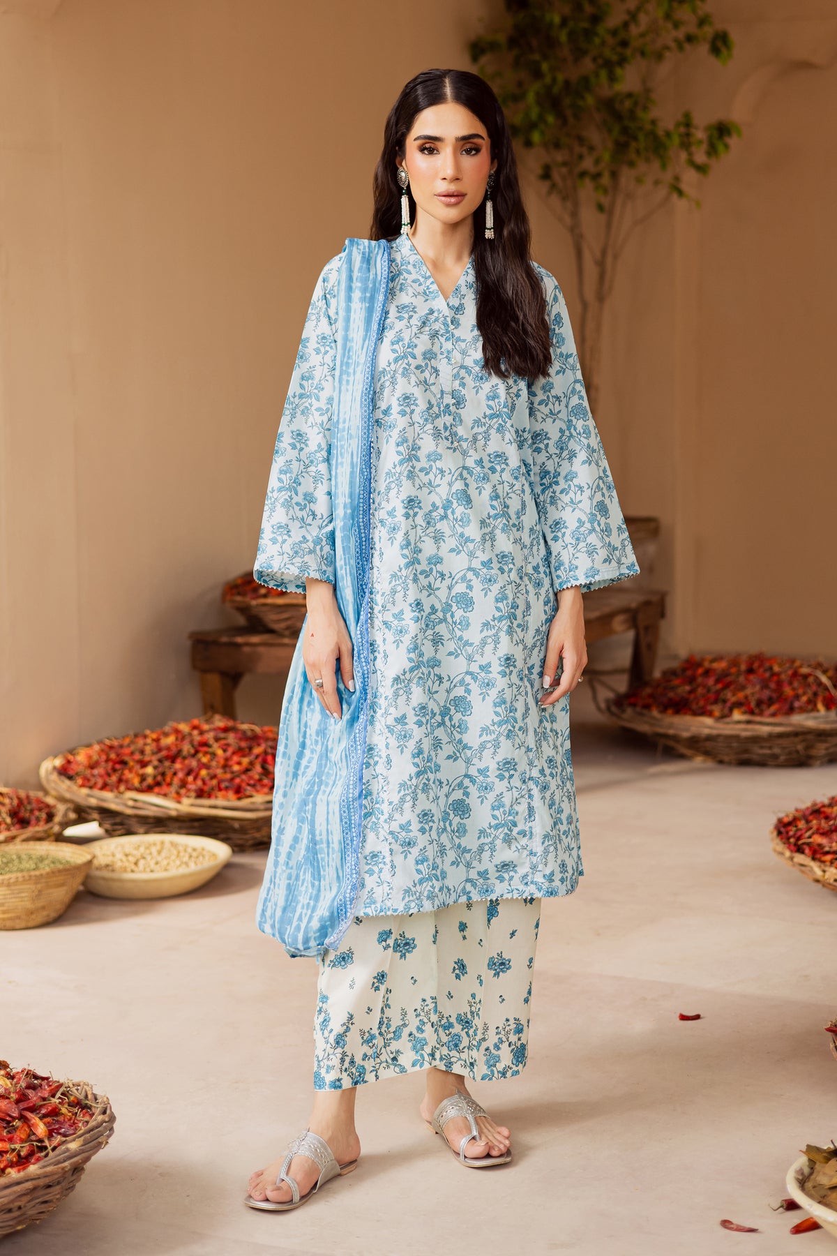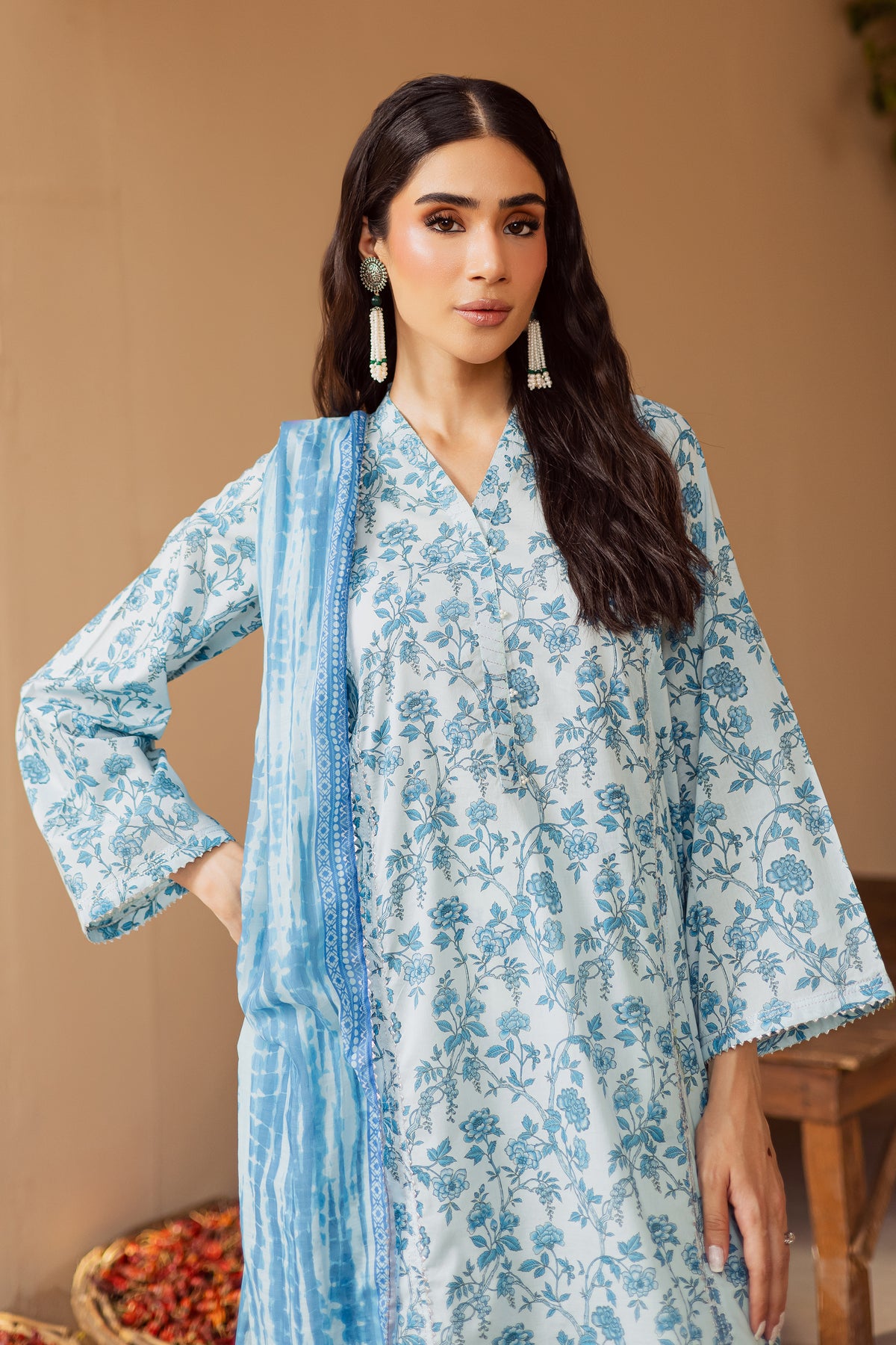 Crumble 3Pc features a refreshing ice blue lawn digital printed long length shirt, subtly embellished at the neckline and sleeves, and finished with delicate lace for a soft, feminine touch.
