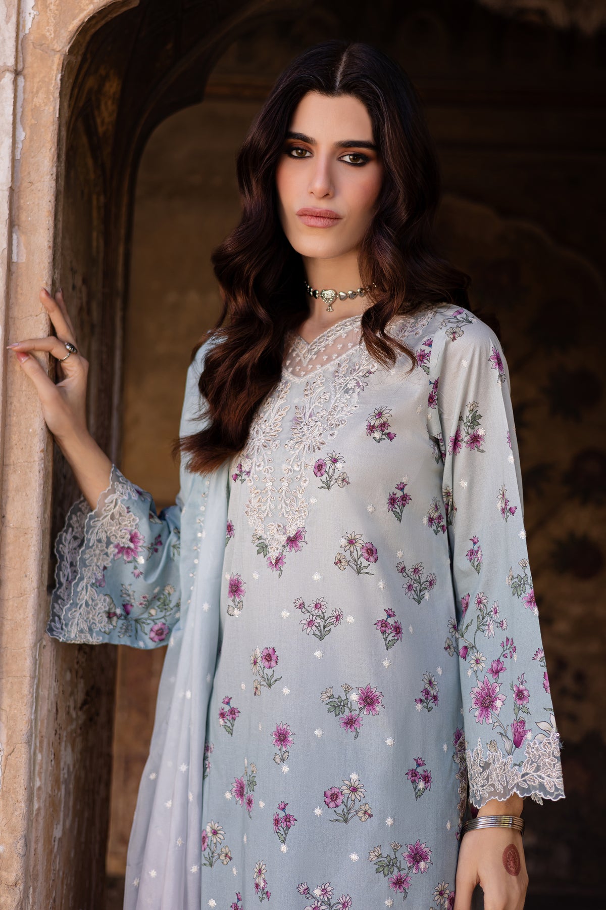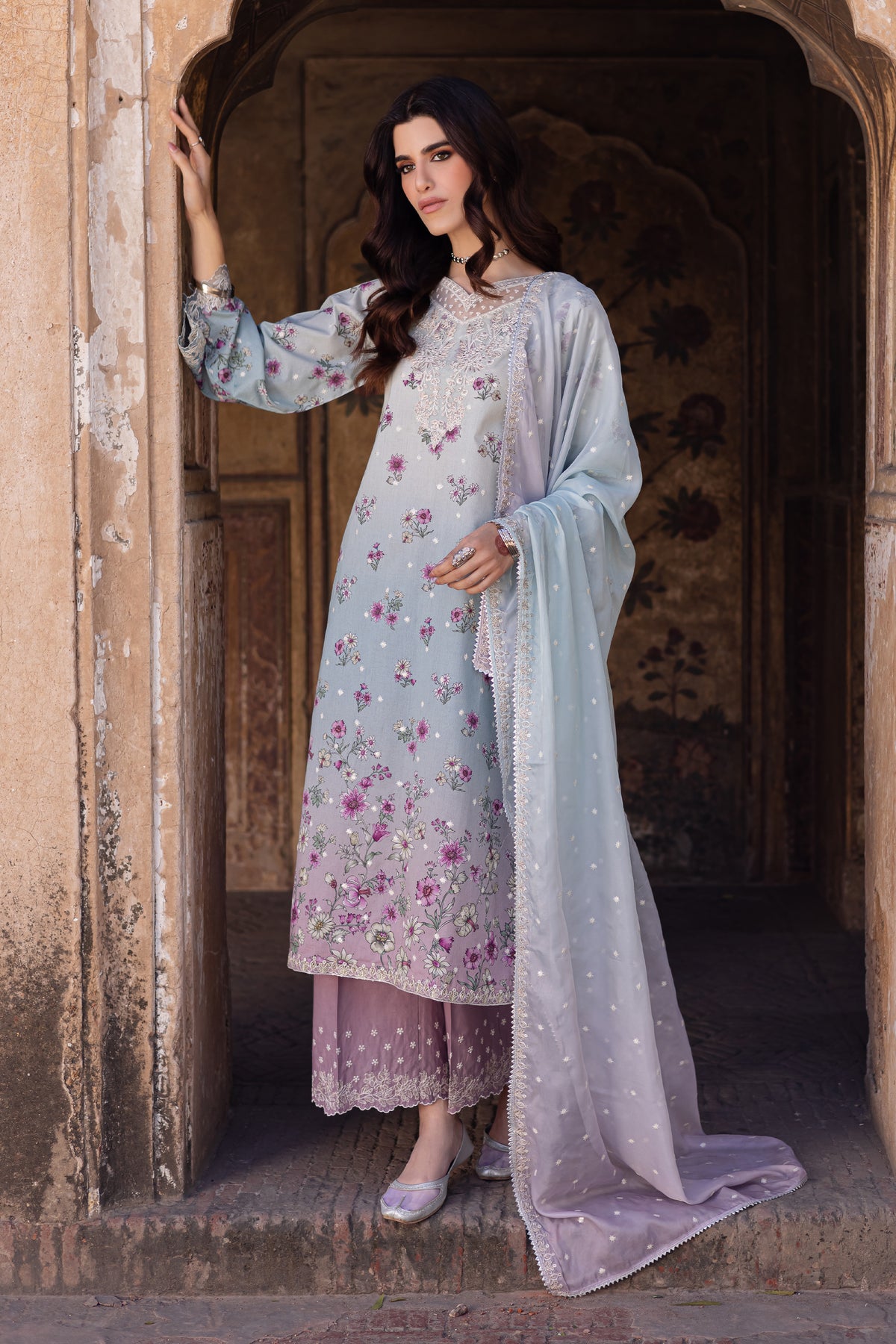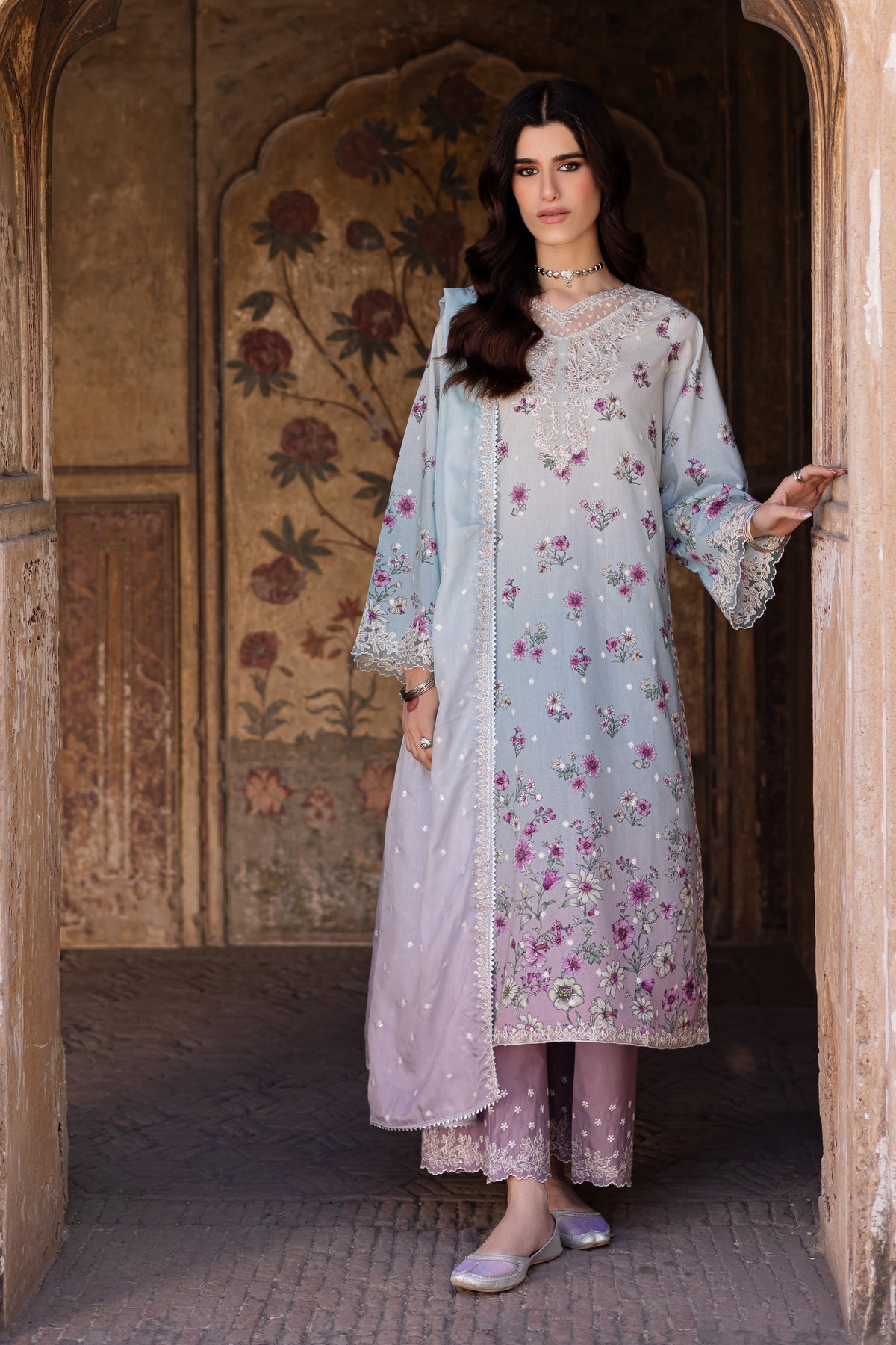 This ombre lilac and powder blue 3-piece set features a digitally printed long lawn shirt with intricate embroidery on the neckline, sleeve hem, and shirt hem, adding a rich and detailed touch to the design. The embroidery enhances the shirt’s elegance, giving it a sophisticated and luxurious finish.