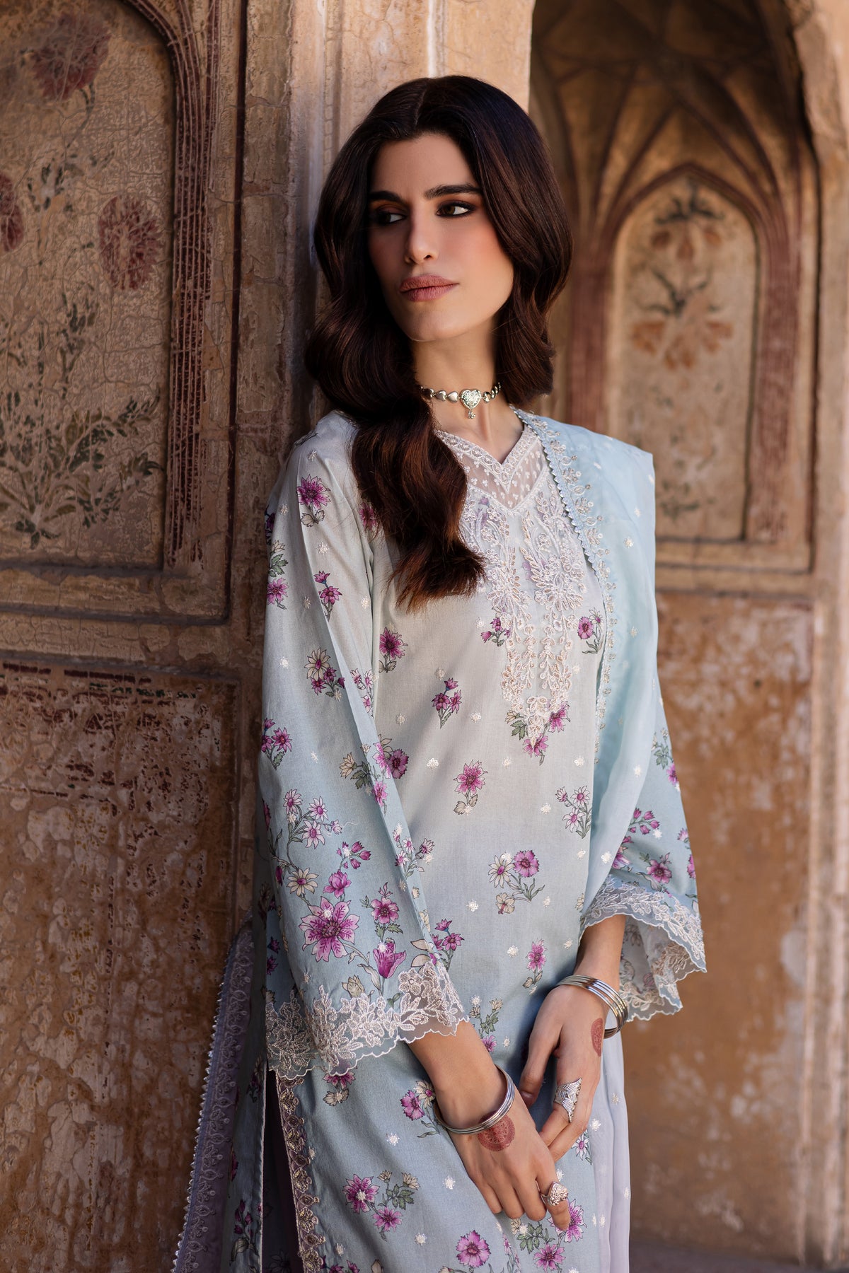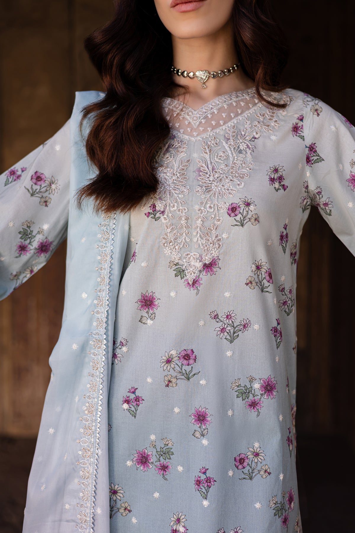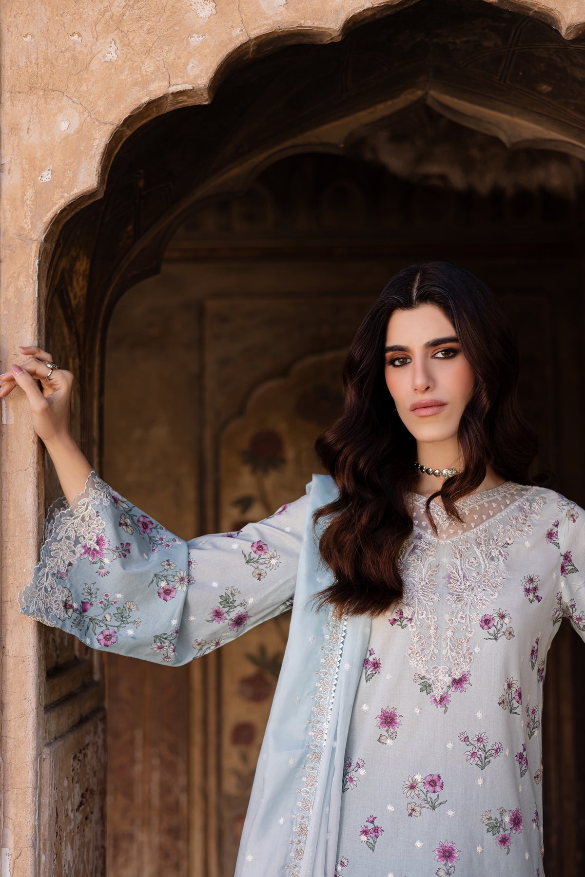 This ombre lilac and powder blue 3-piece set features a digitally printed long lawn shirt with intricate embroidery on the neckline, sleeve hem, and shirt hem, adding a rich and detailed touch to the design. The embroidery enhances the shirt’s elegance, giving it a sophisticated and luxurious finish.