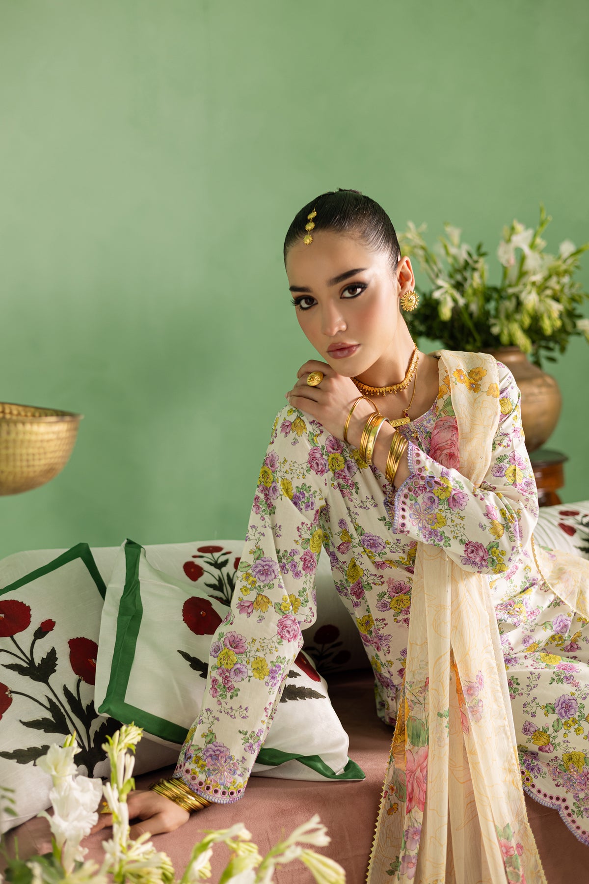 The printed sequin chiffon dupatta finishes the look with a touch of glamour, its sparkling sequins catching the light as it flows gracefully around you. The delicate lace trim adds a soft, feminine touch.