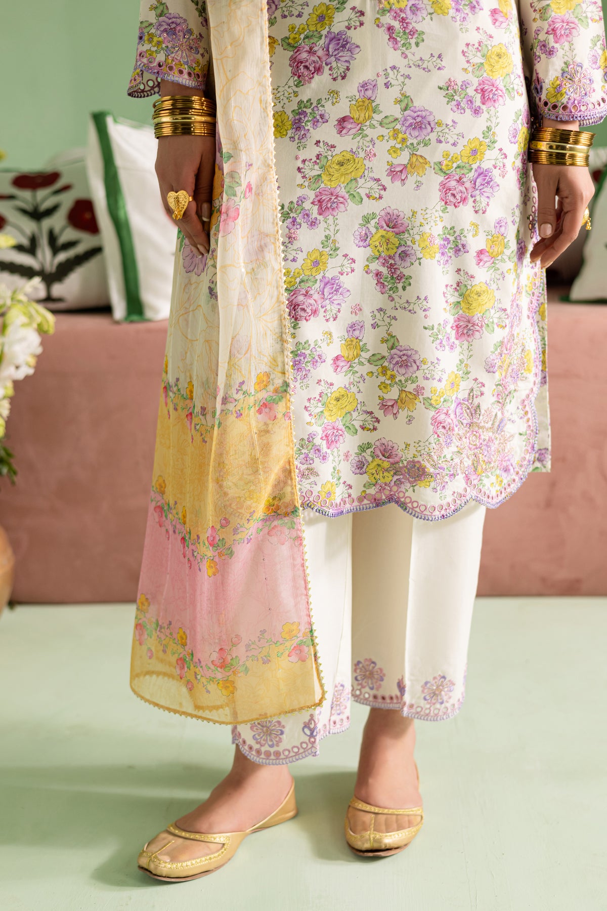 Paired with dyed embroidered cambric trouser beautifully complements the shirt, with its delicate embroidery that adds a layer of sophistication to the ensemble.
