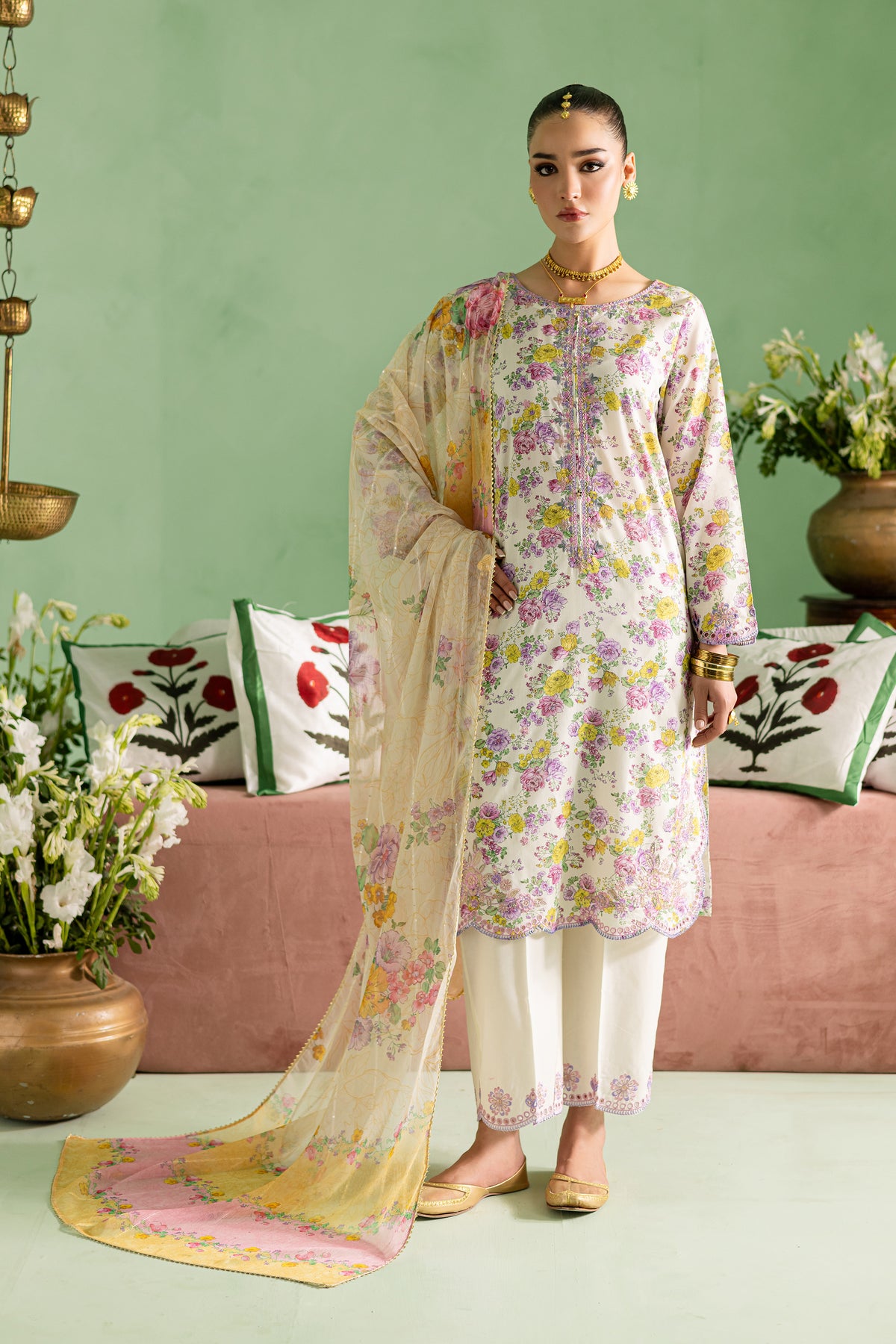 This printed pima lawn shirt features an embroidered neckline with scallop embroidery at the hem and sides adding a touch of intricate beauty. The chalks embroidery at the sleeve hem enhances the overall design, giving the shirt a refined, festive feel that’s both timeless and trendy.