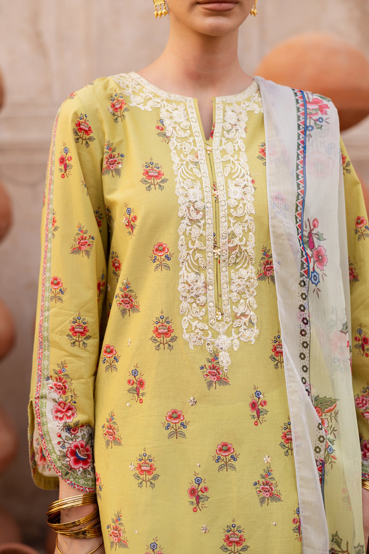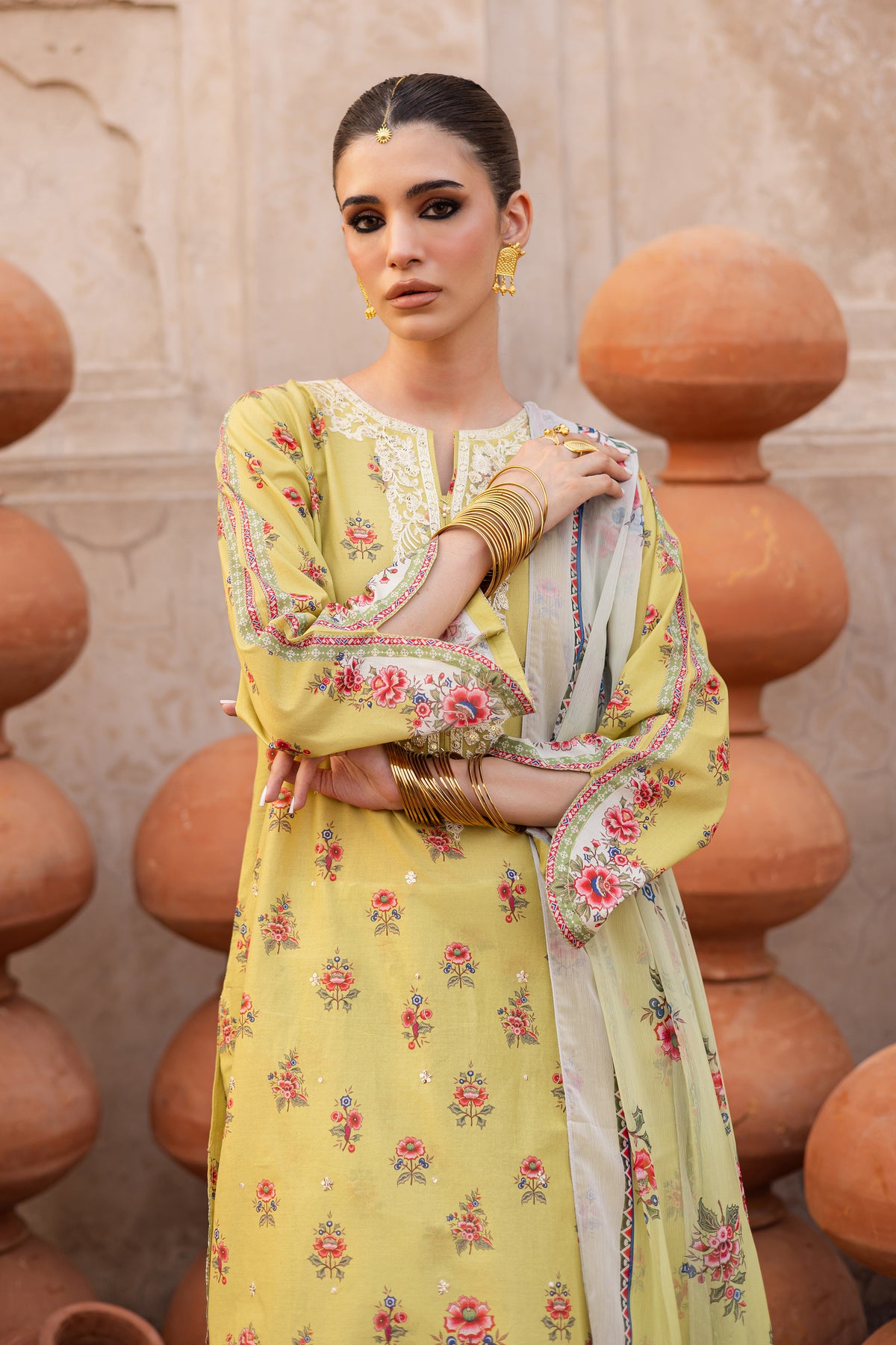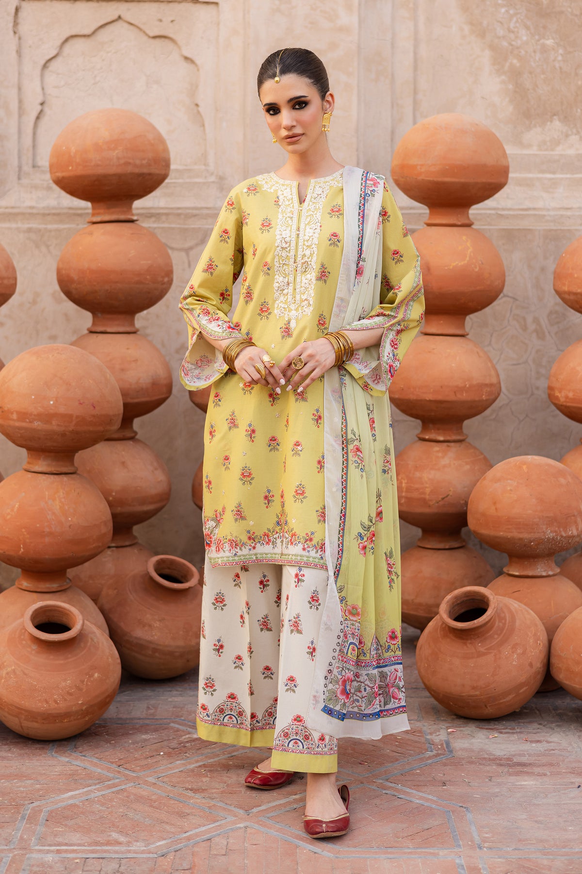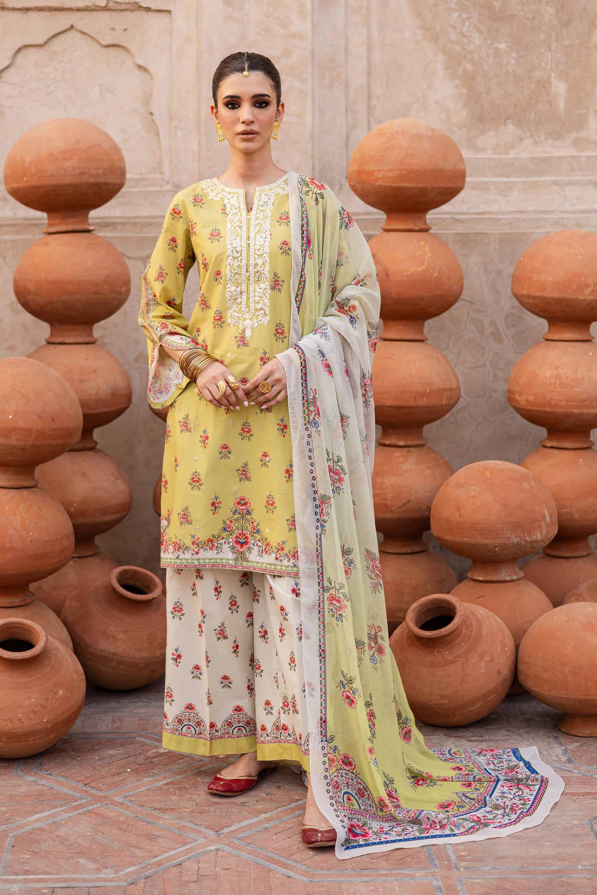 This mid-length lime green printed lawn shirt, features a round hem and an elegantly embroidered neckline with a subtle sequin spread on the front, adding a refined sparkle to its fresh, modern look. The rounded hem sleeves with delicate slits bring a touch of graceful movement and contemporary flair.