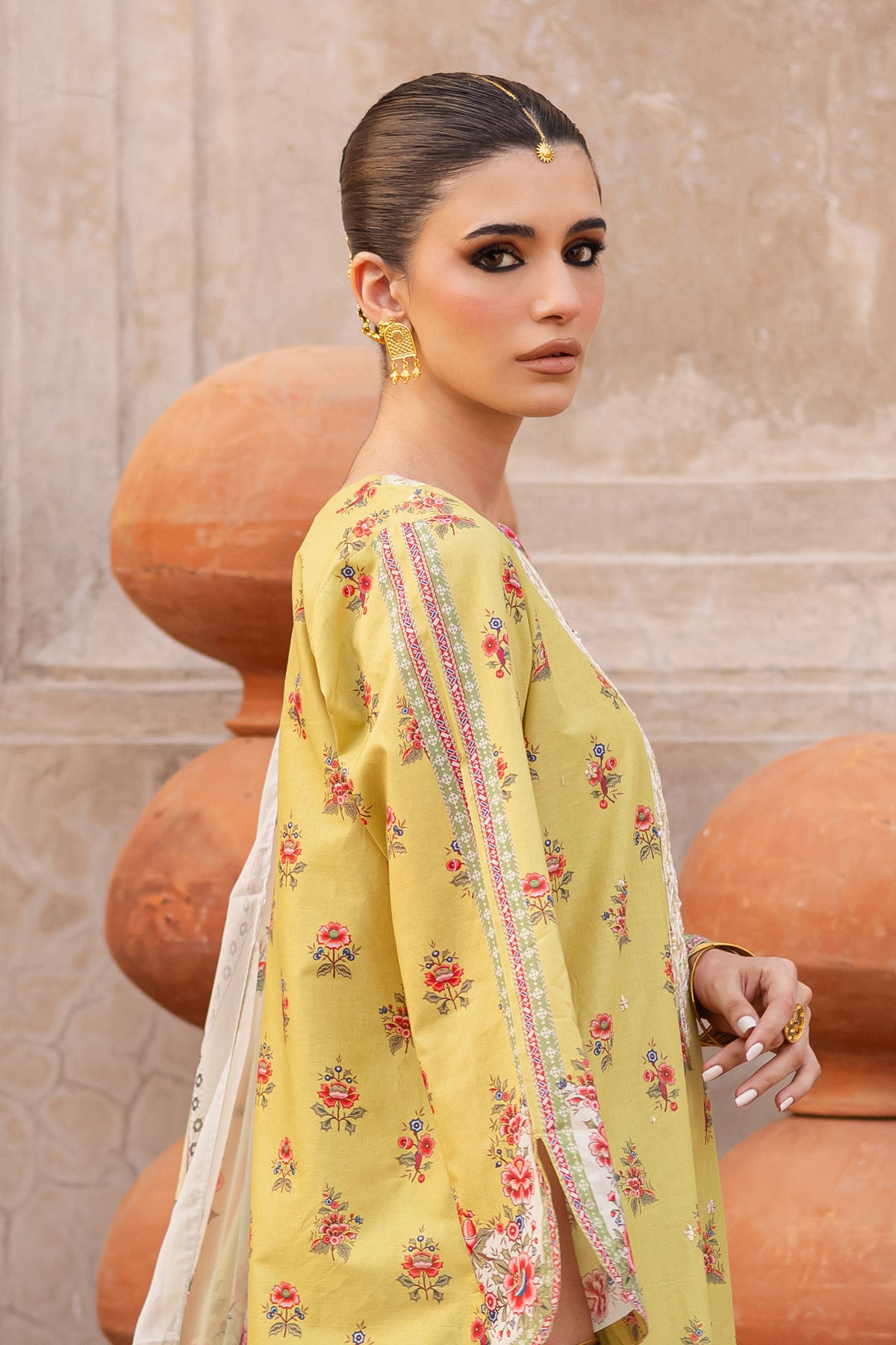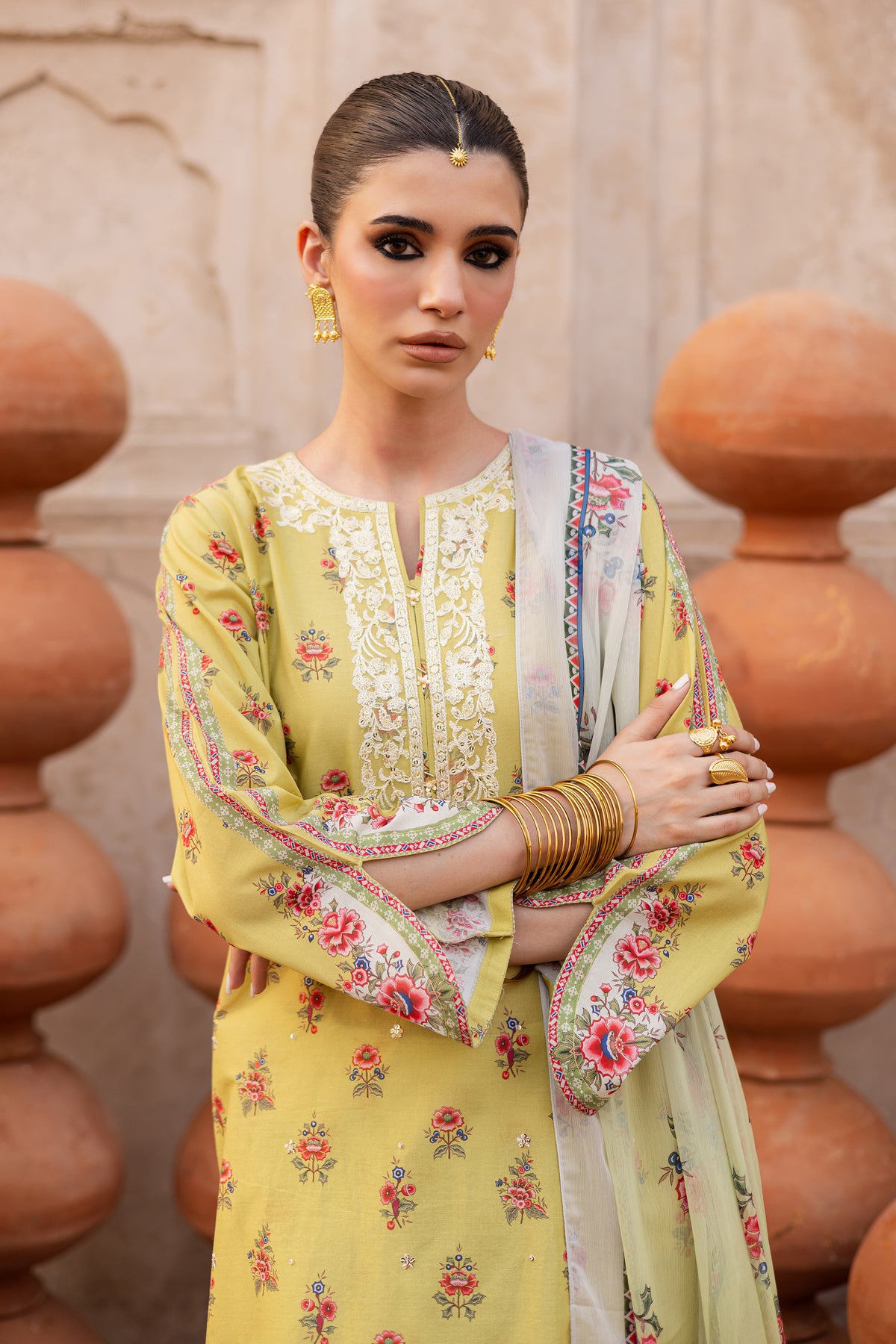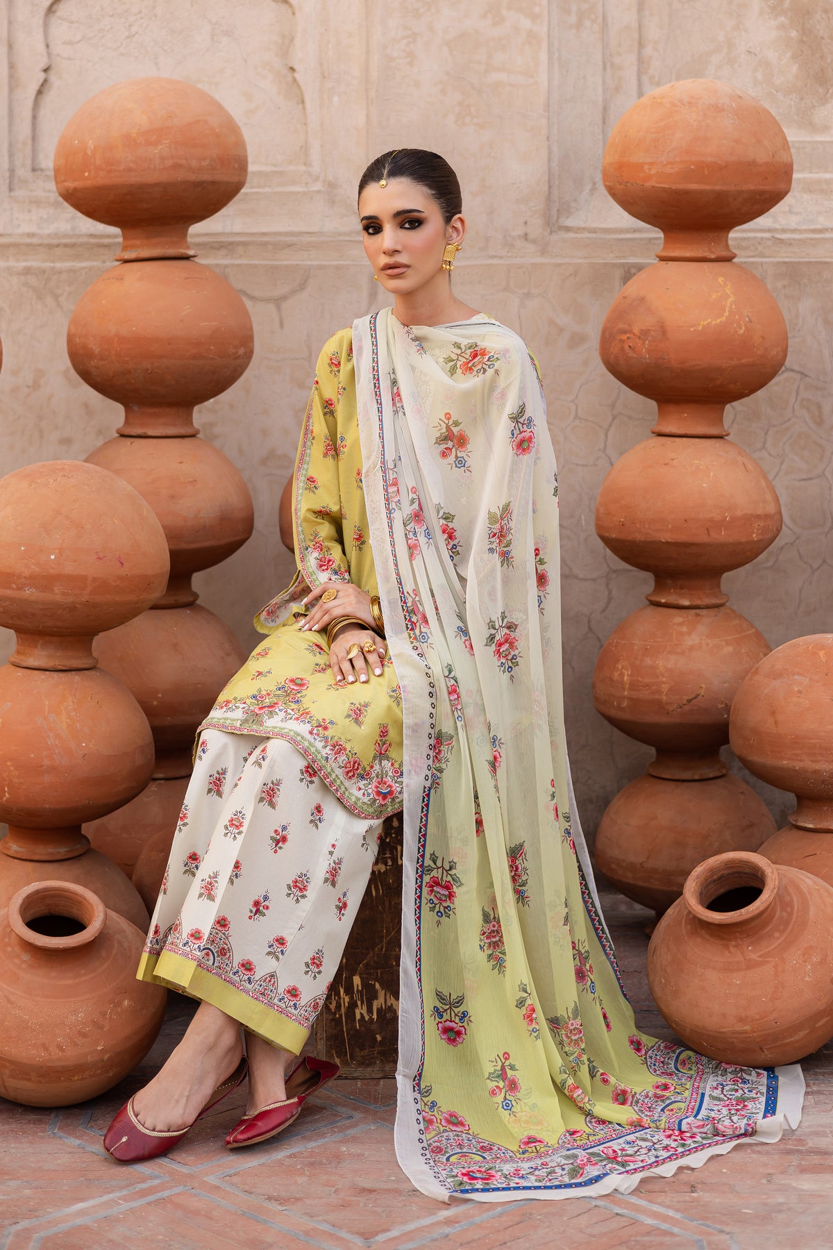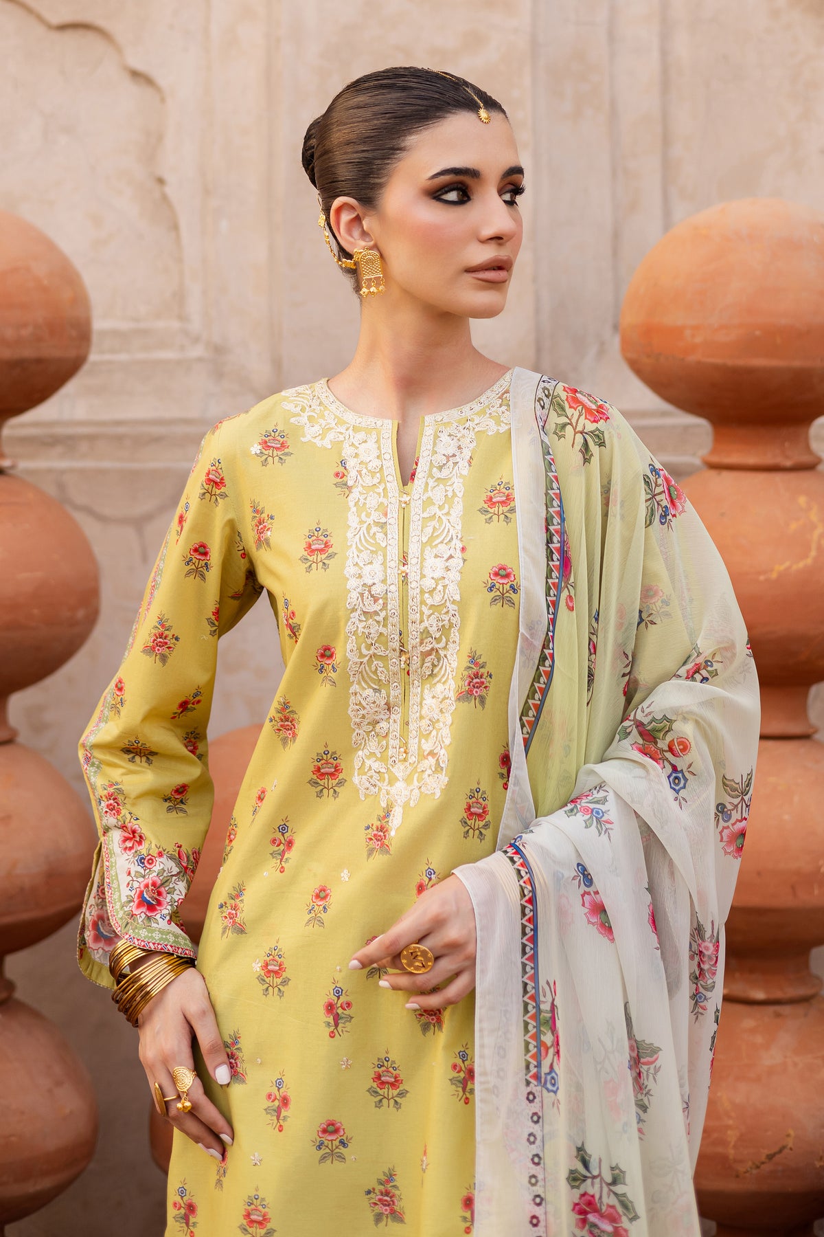 This mid-length lime green printed lawn shirt, features a round hem and an elegantly embroidered neckline with a subtle sequin spread on the front, adding a refined sparkle to its fresh, modern look. The rounded hem sleeves with delicate slits bring a touch of graceful movement and contemporary flair.
