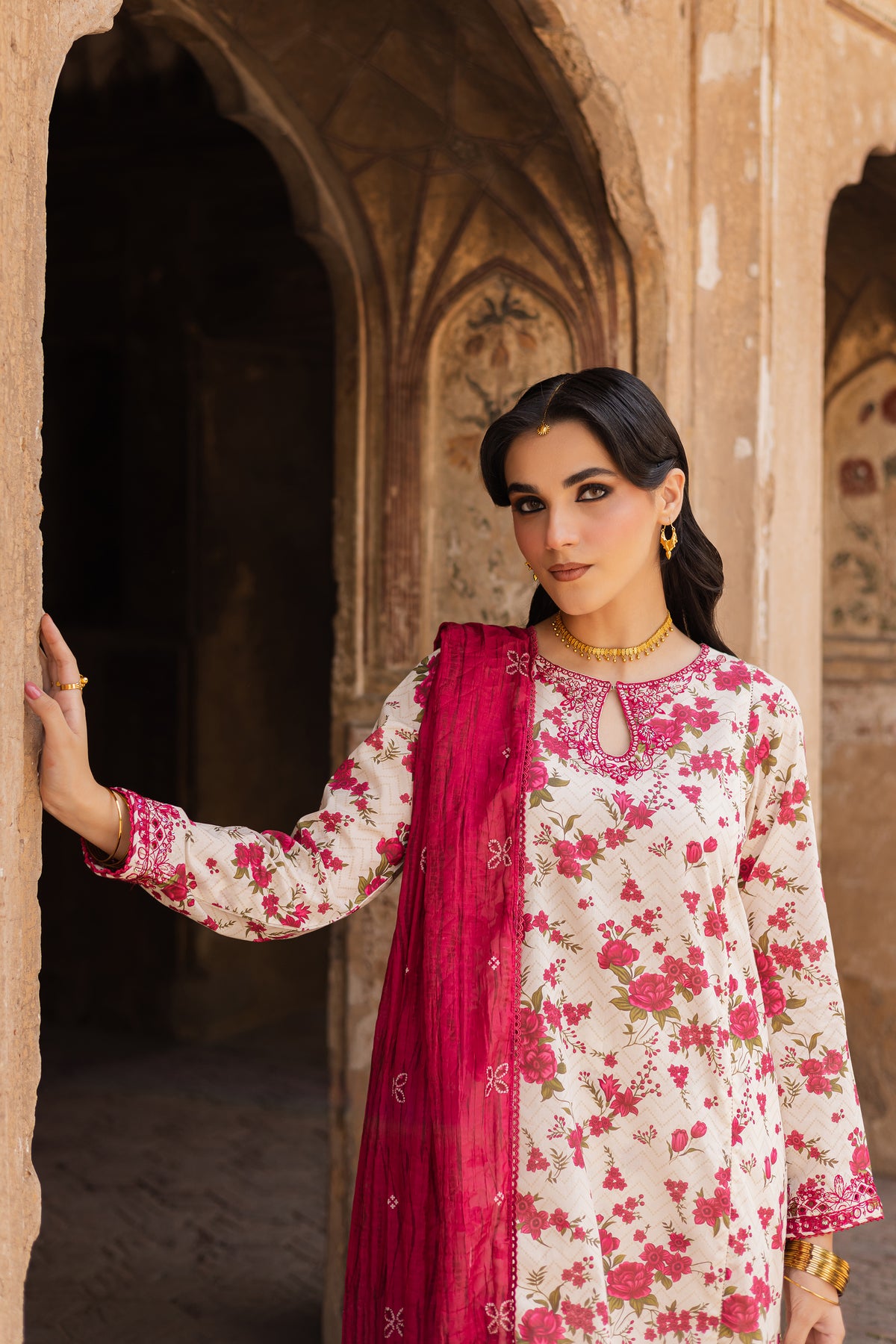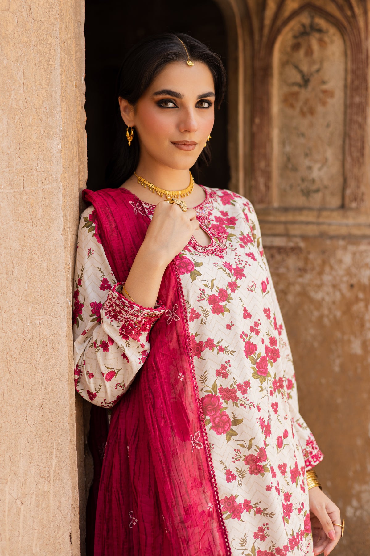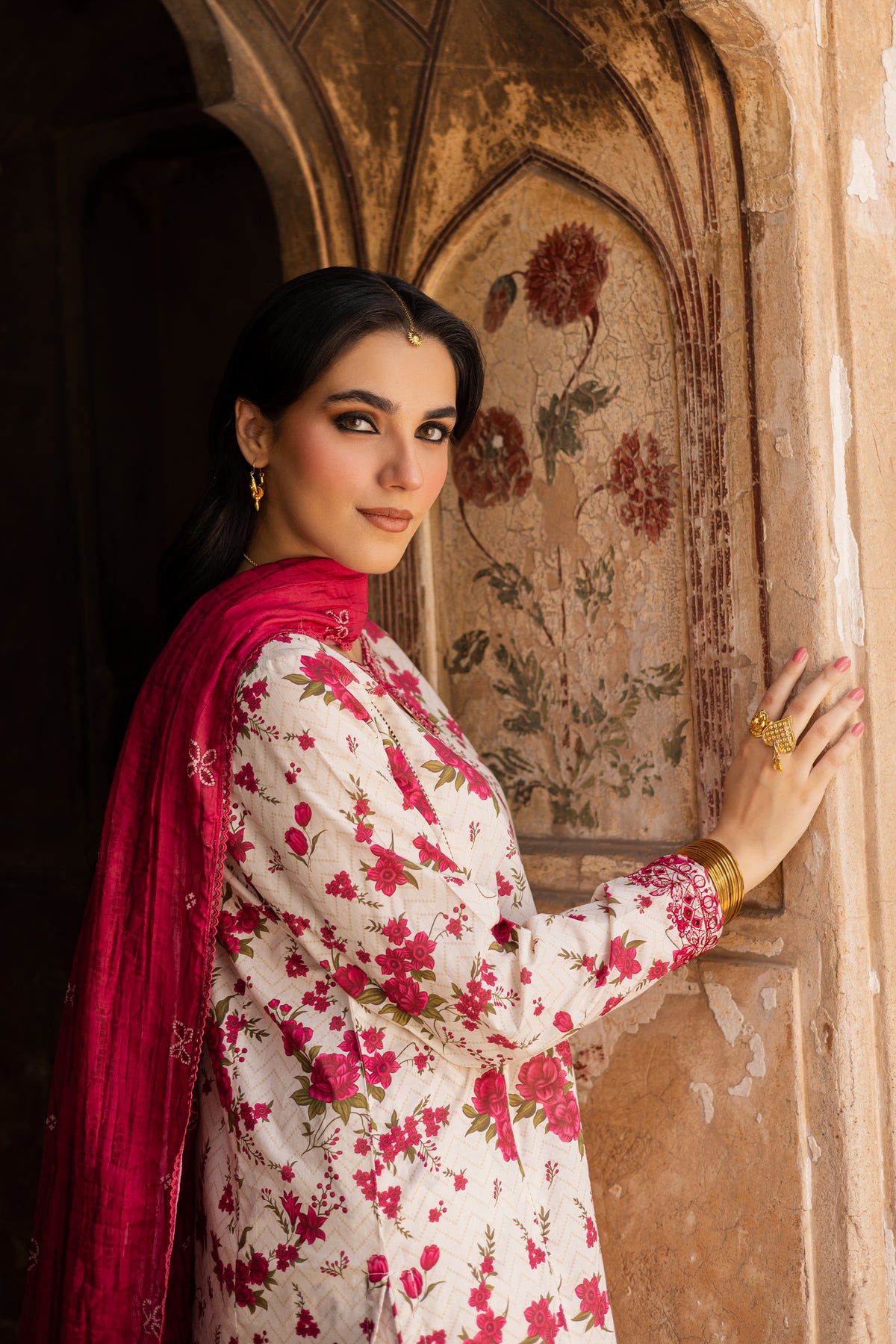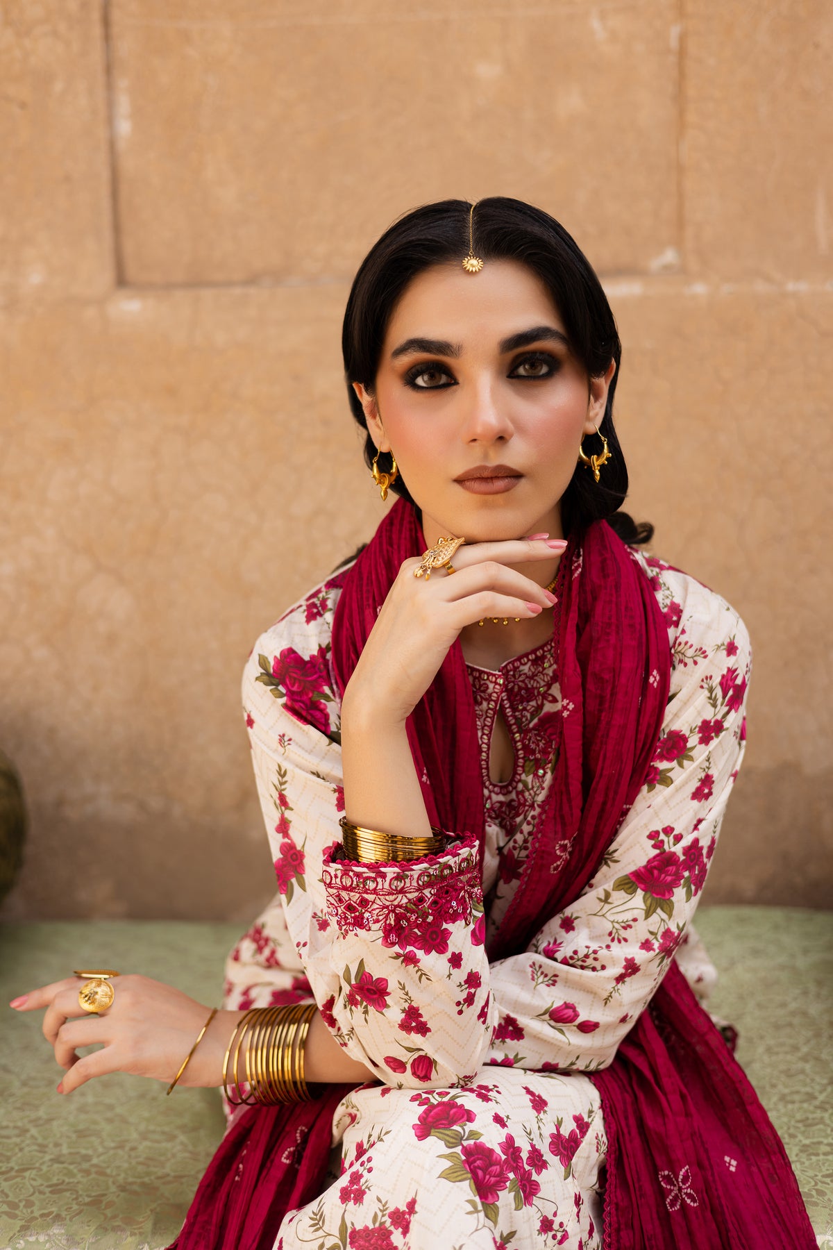 A printed swiss voile dupatta completes the ensemble, adding a soft and airy finish with its graceful drape and vibrant print.