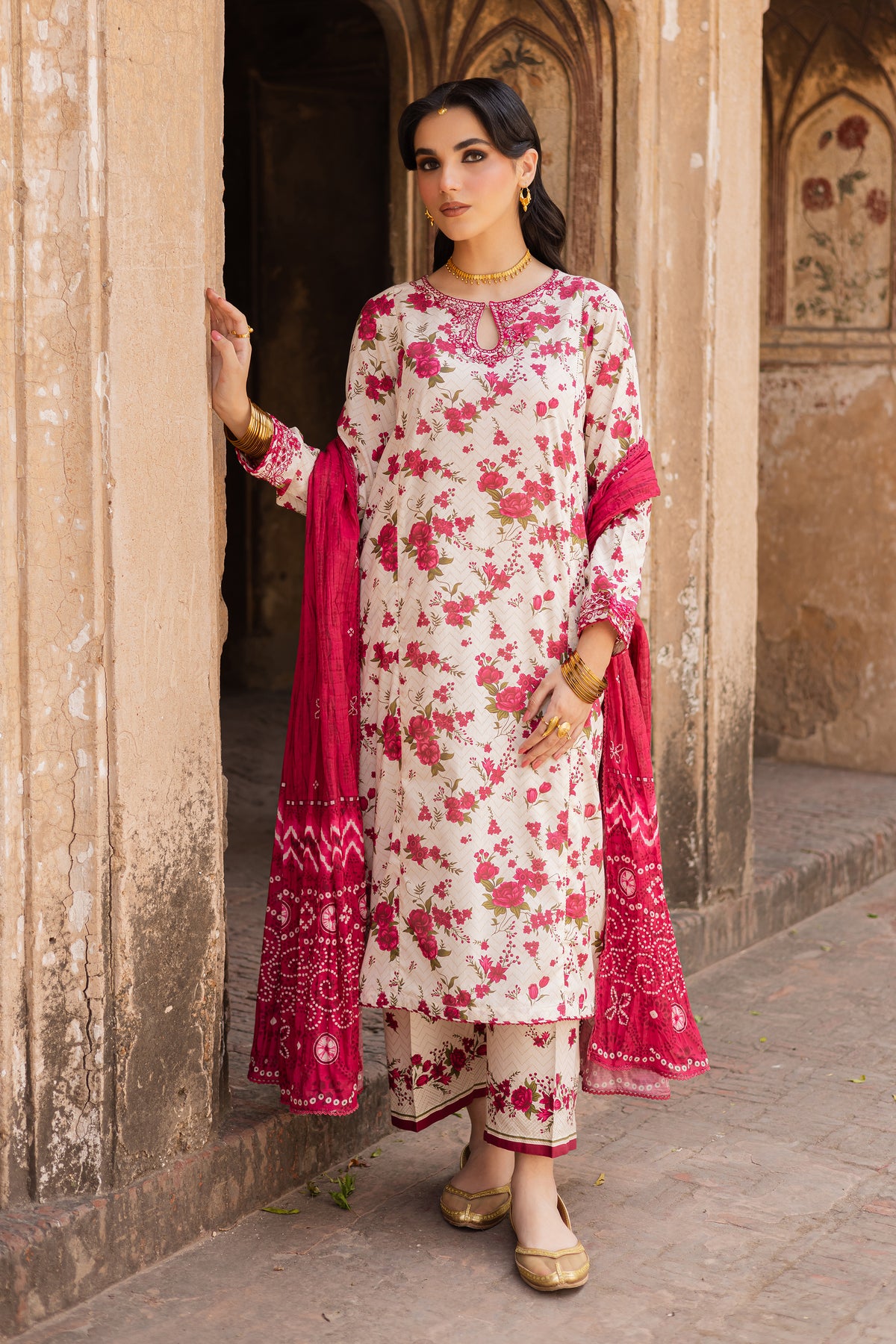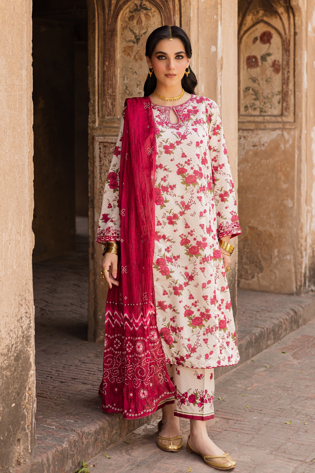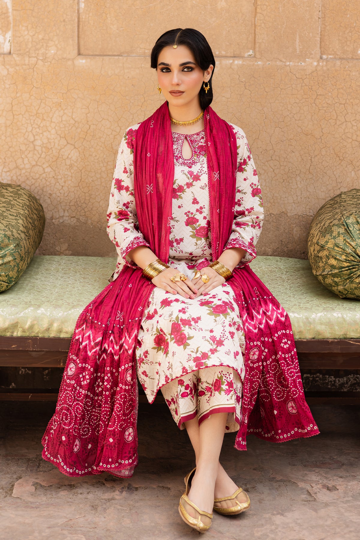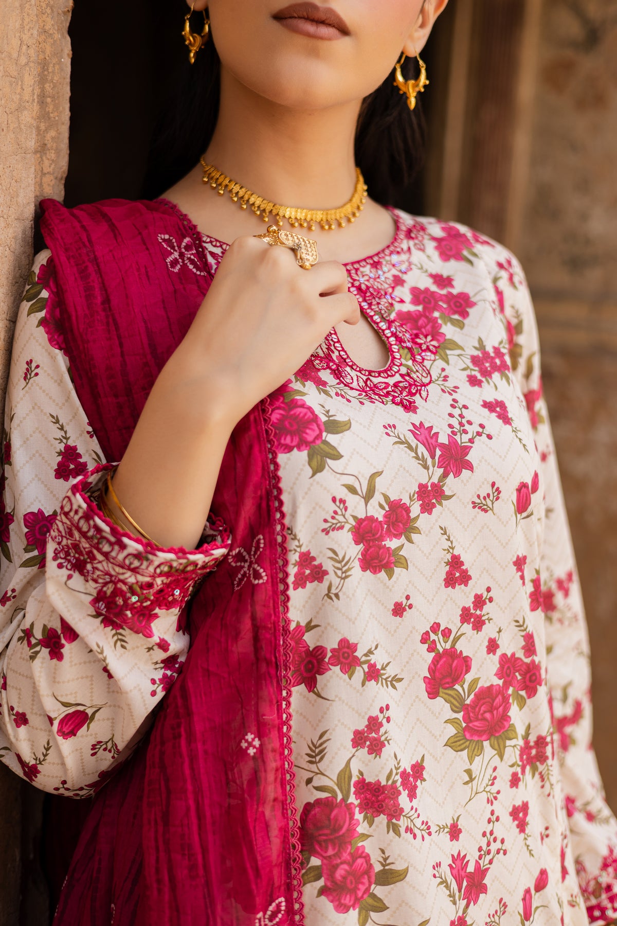 A printed swiss voile dupatta completes the ensemble, adding a soft and airy finish with its graceful drape and vibrant print.