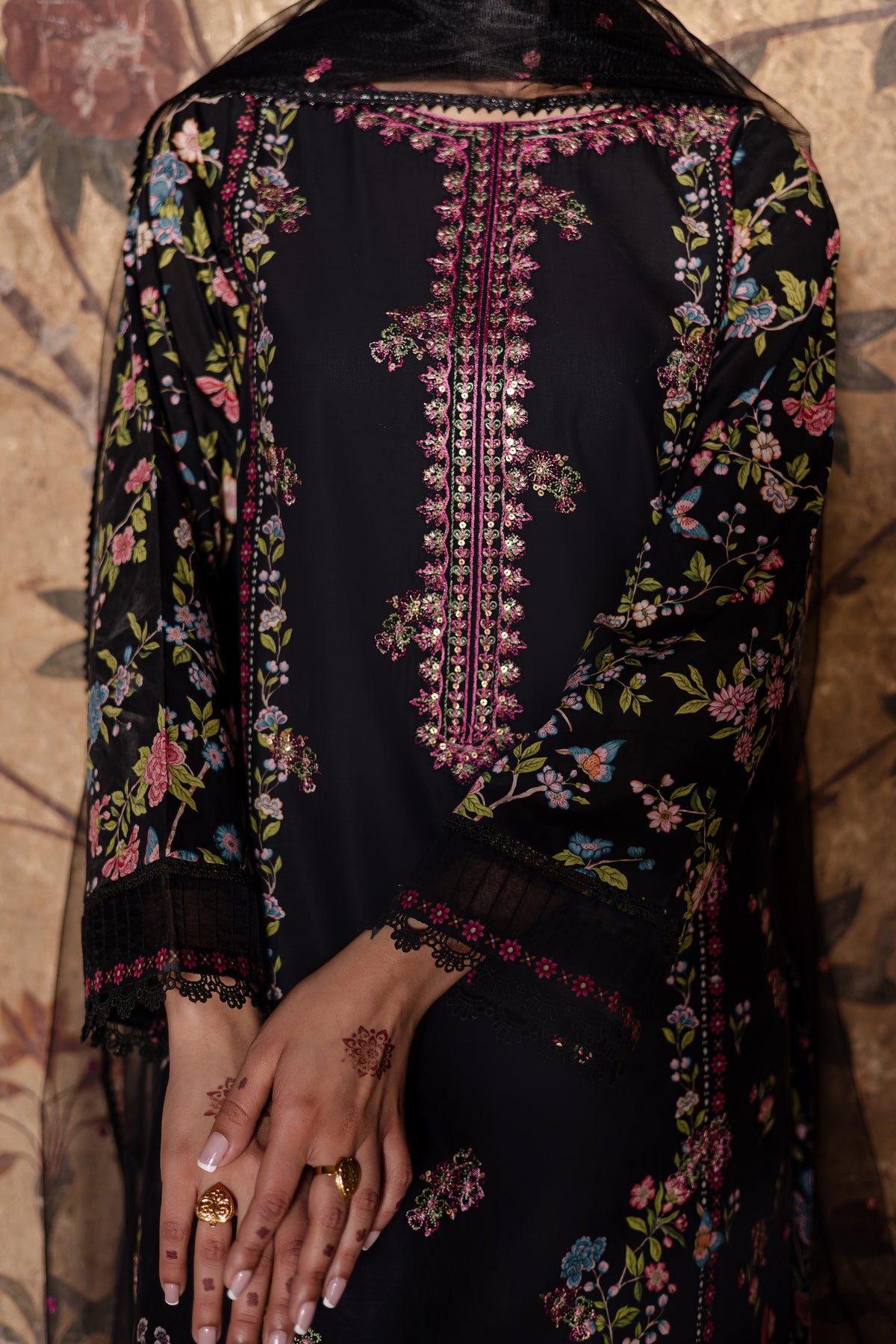 This composed black printed lawn shirt features beautiful embroidery at the neckline, complemented by organza detailing at the sleeves and lace at the sleeve hem, adding a delicate and intricate touch to the design.