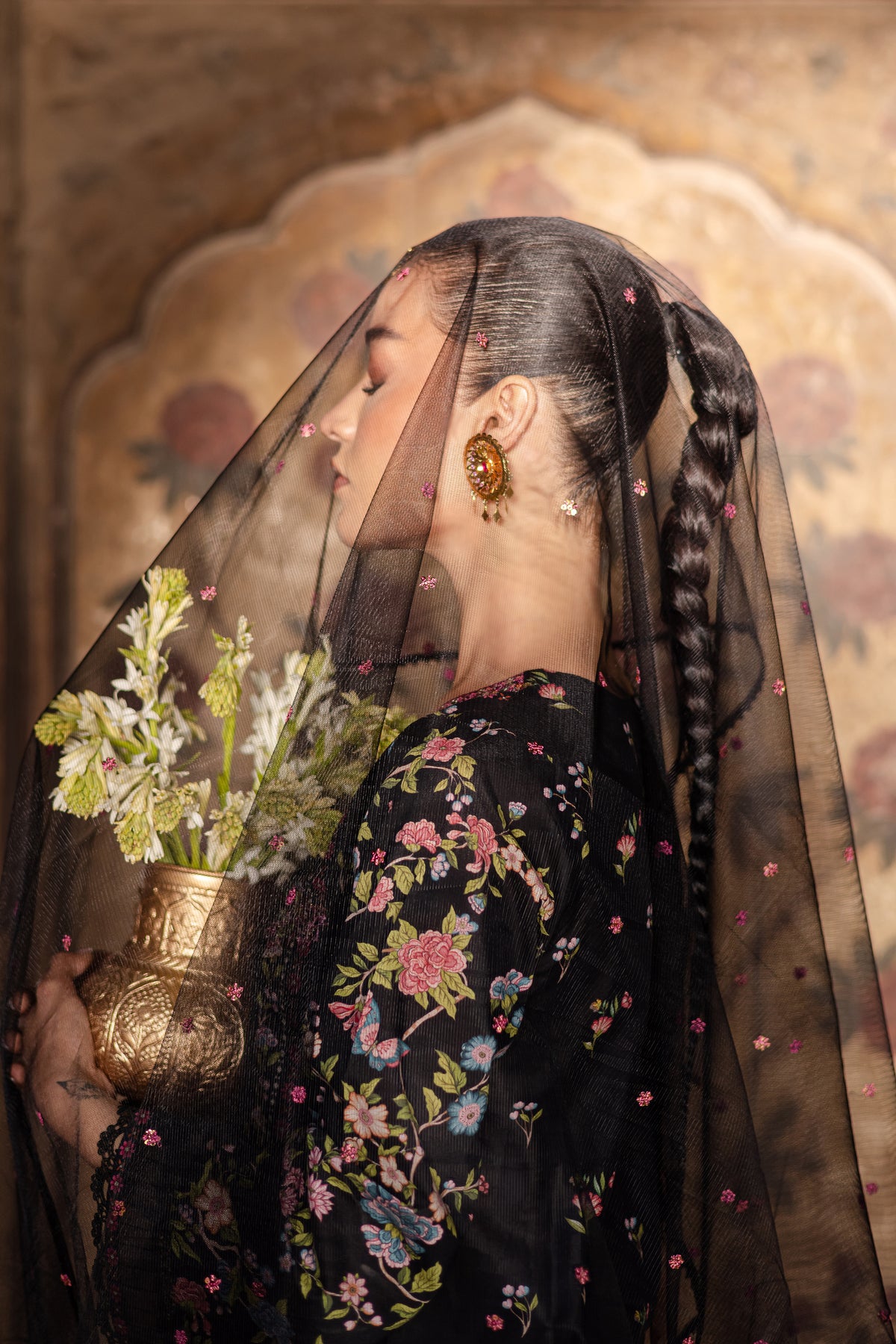 A net embroidered dupatta completes the look, offering a refined and graceful finish that ties the entire outfit together.