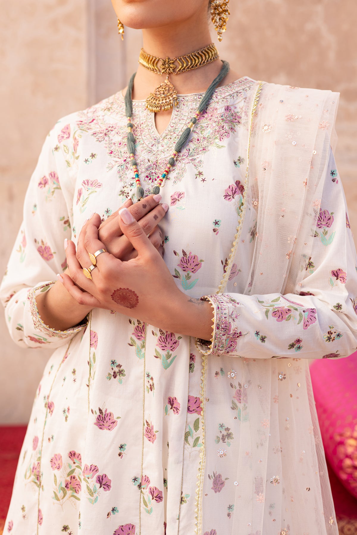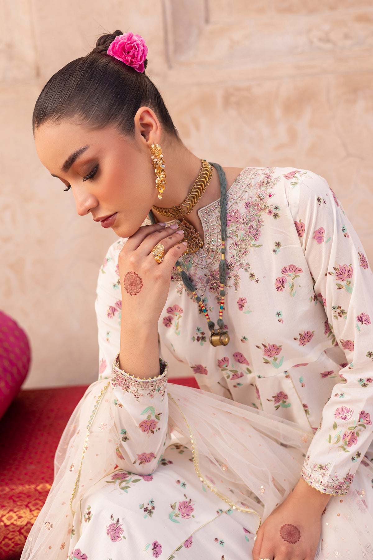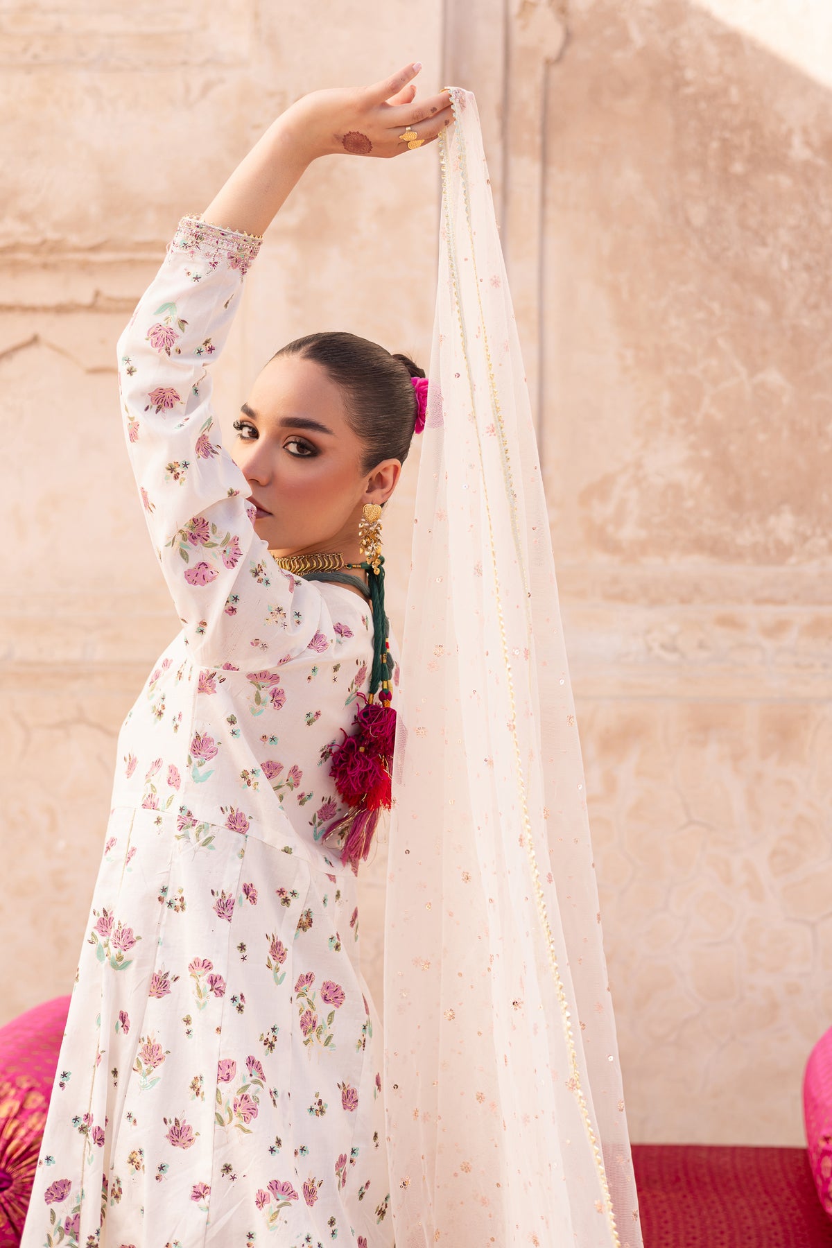 This white lawn frock features a screen-printed panel design, enhanced with beautiful embroidery at the neckline and sleeve hem, adding an intricate touch of craftsmanship. The samosa lace at the hem and dori lace at the panels further elevate the elegance of the piece, giving it a unique and refined finish.