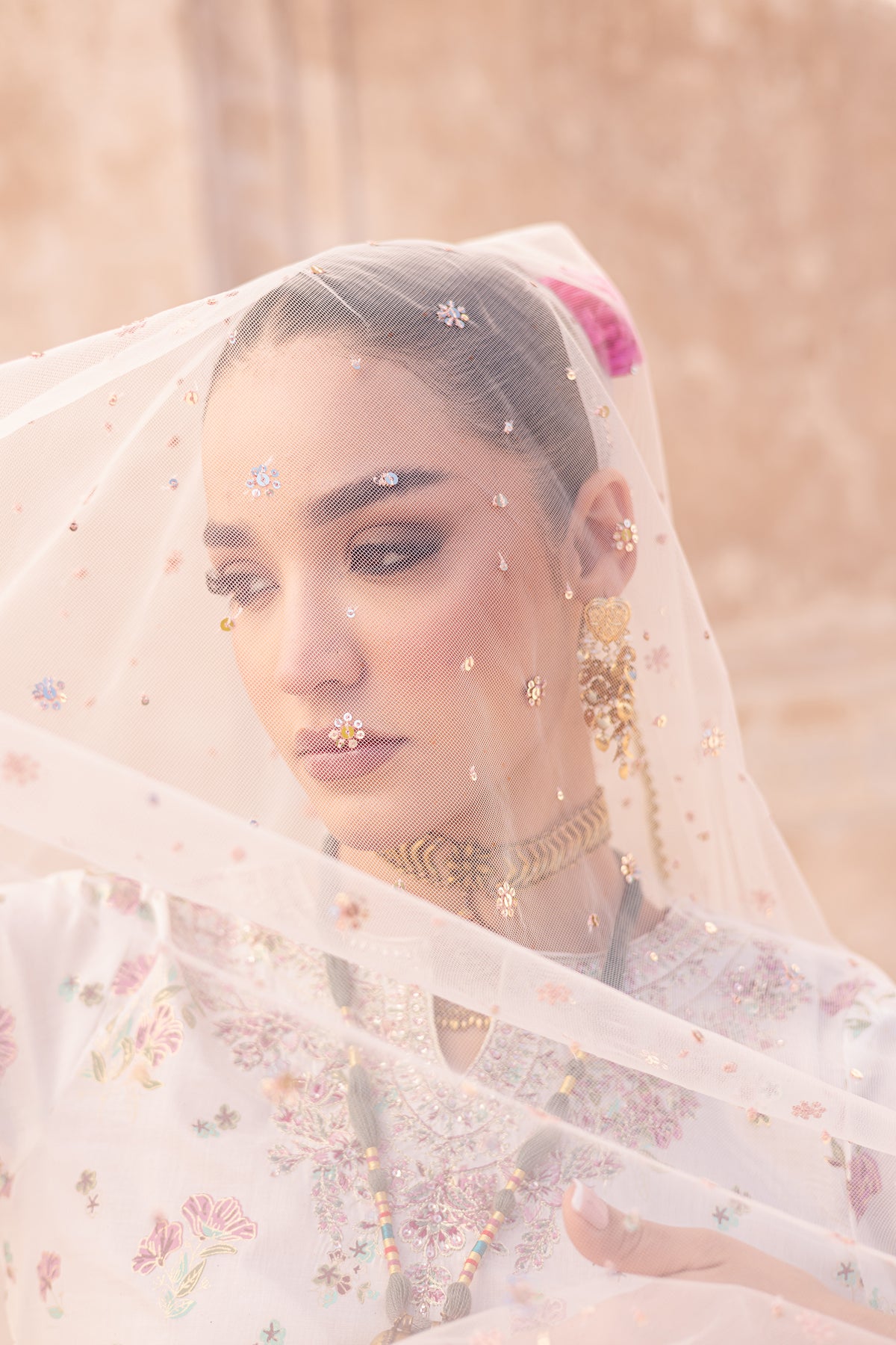 A net dupatta with a sequin spread completes the ensemble, adding a delicate shimmer and bringing the look together with a touch of grace.