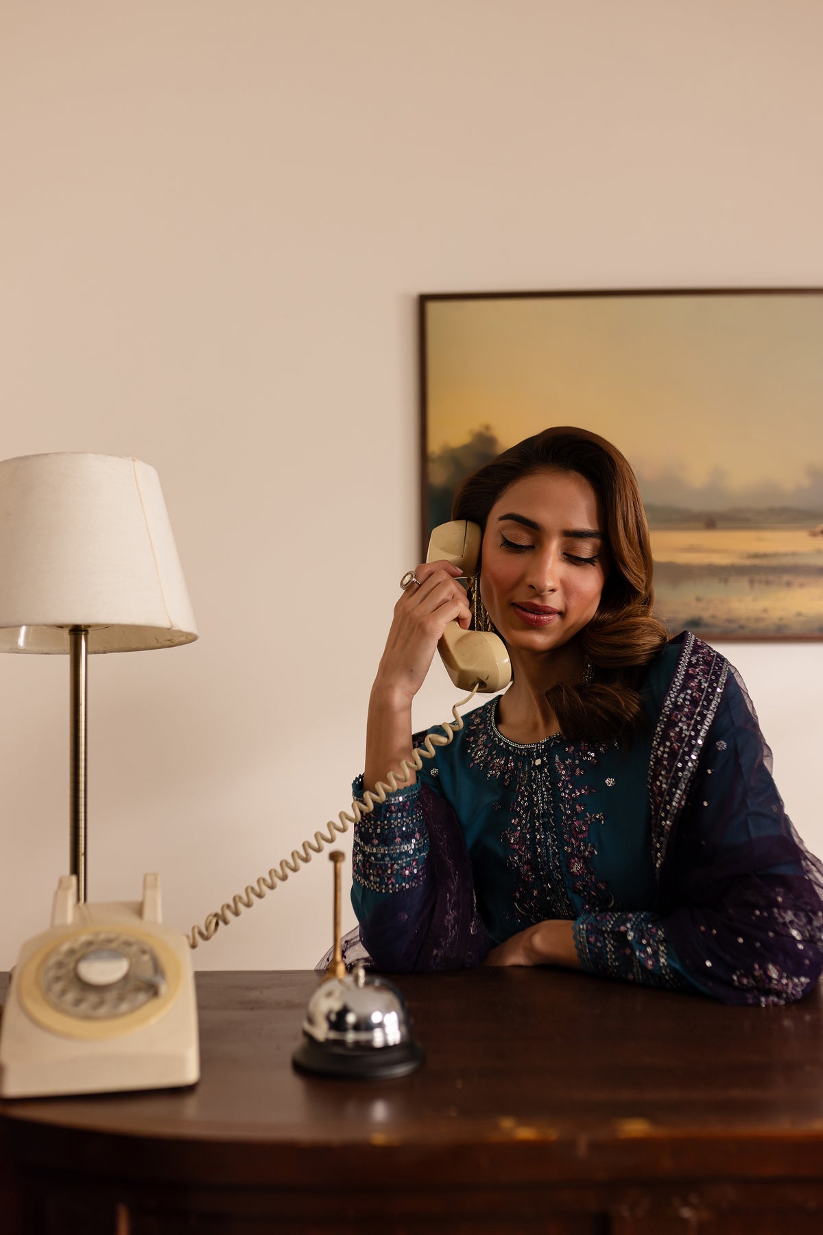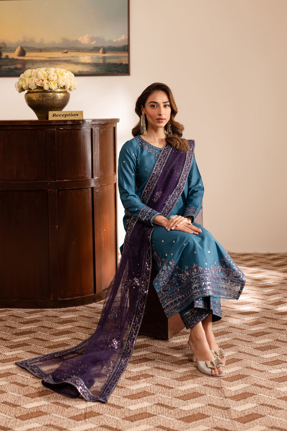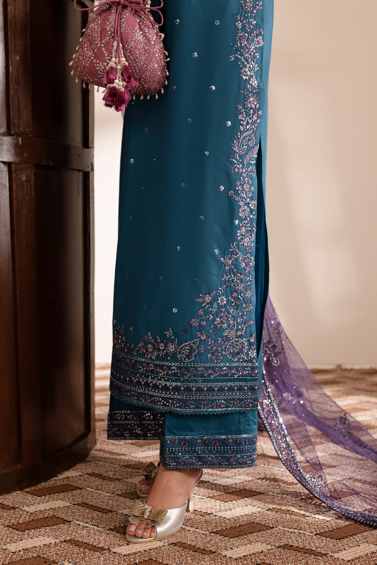 This elegant long pima lawn shirt in blue coral shade features an embroidered neckline with a striking contrast-colored embroidery on the hem and side chaaks. A mirror-embellished collage adorns the neckline, while a sequin motif spread enhances the entire shirt. The hem and sleeves are finished with intricate lace borders, adding a touch of sophistication.