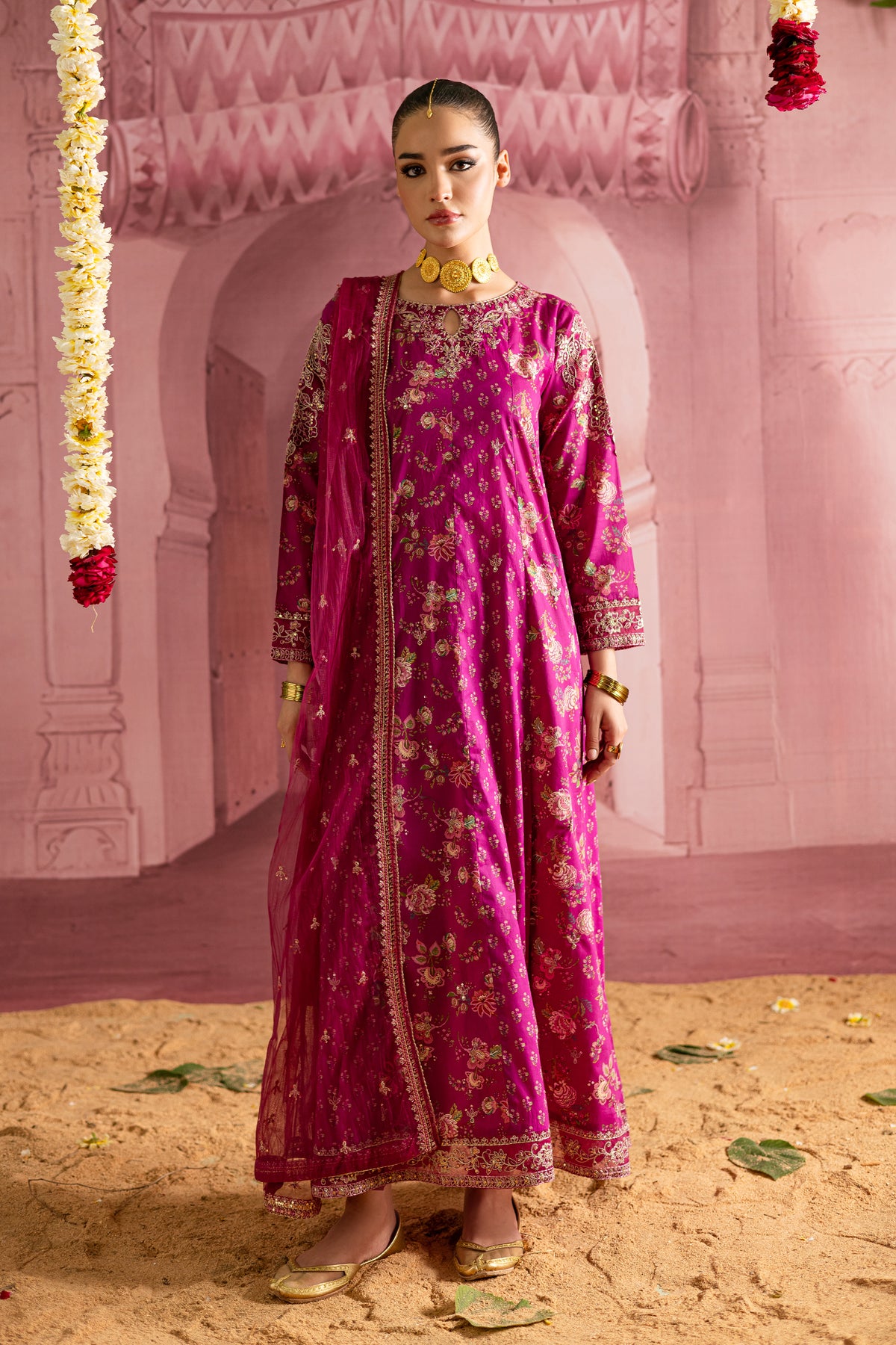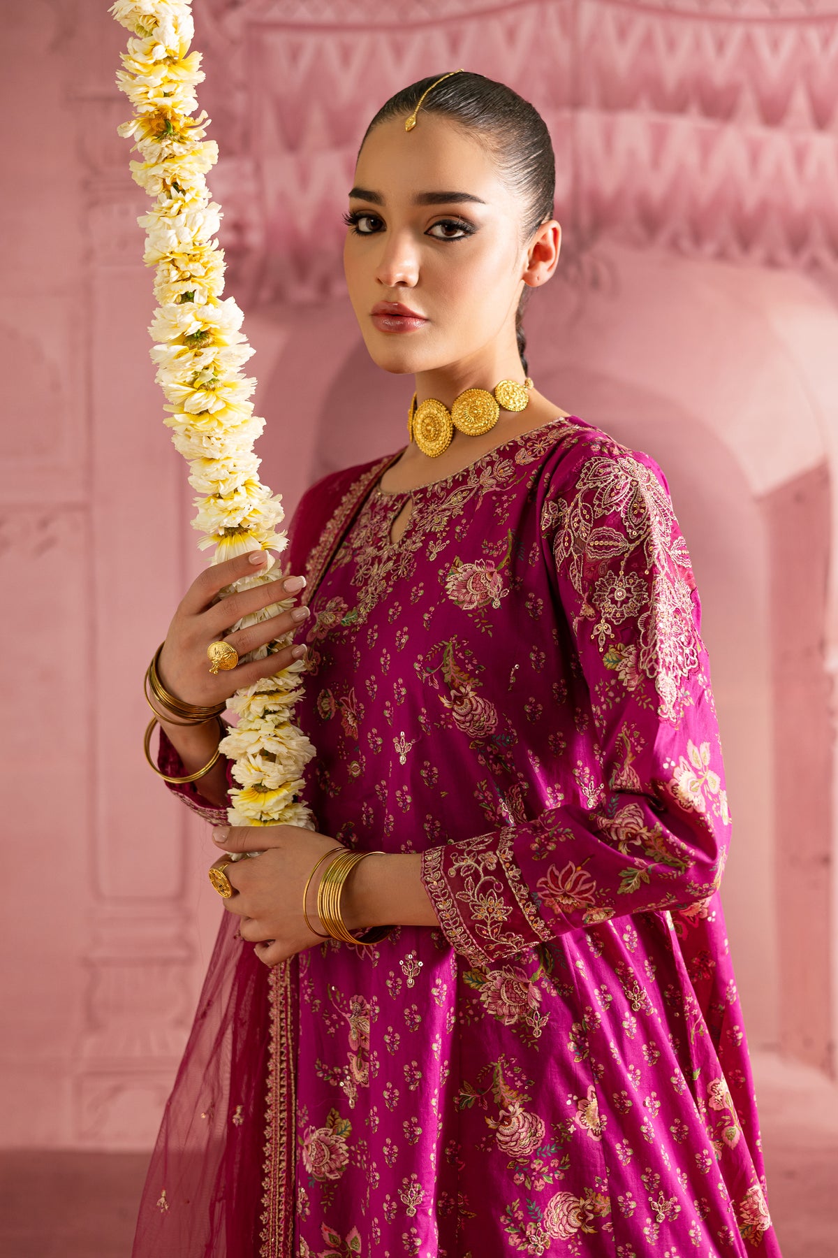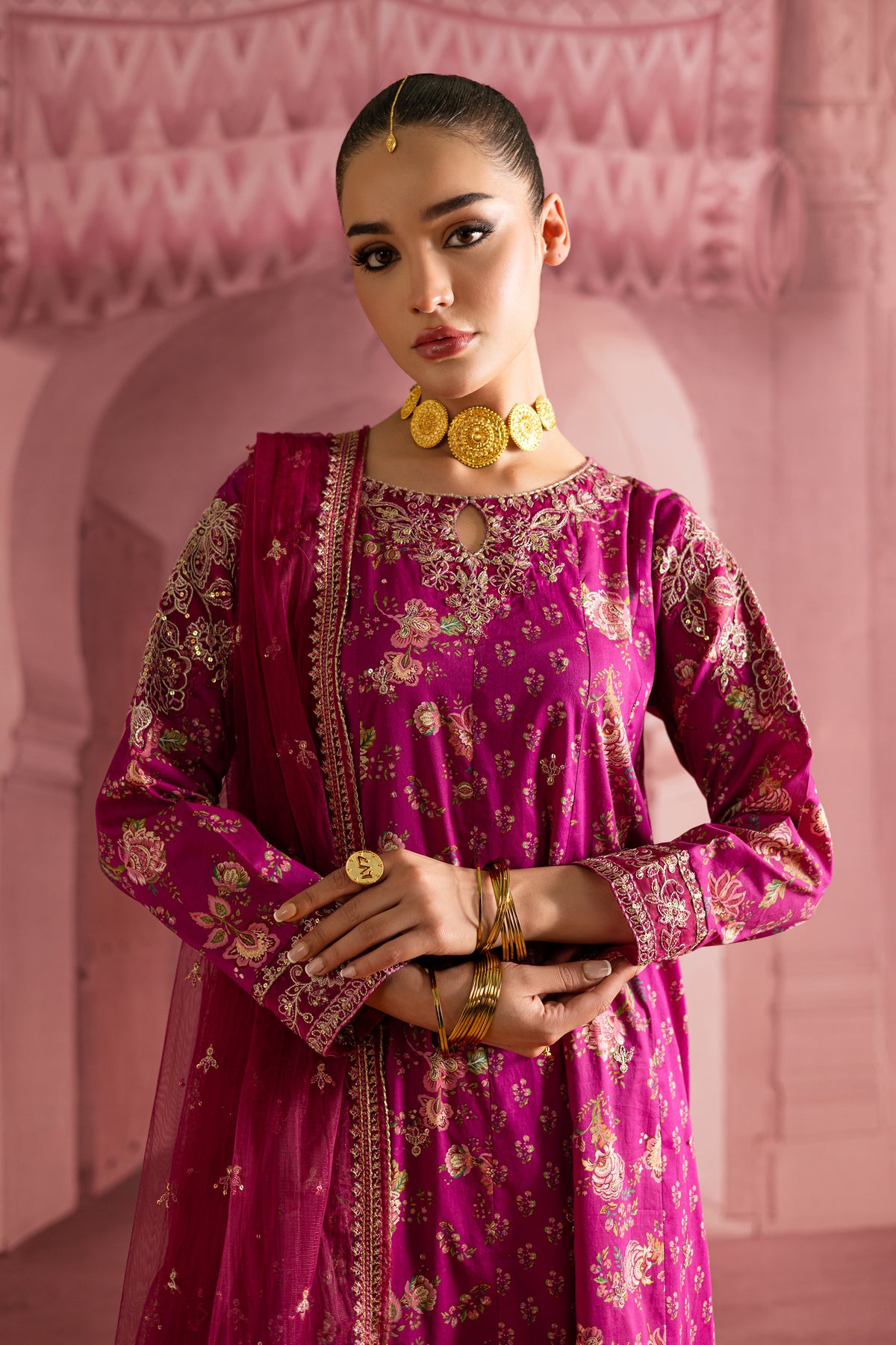 This printed pink pima lawn paneled frock is a stunning fusion of intricate design and festive flair. With delicate embroidery at the neckline and sleeves, it brings an element of timeless elegance, while the bold print adds a modern touch, creating a perfect balance of tradition and style.