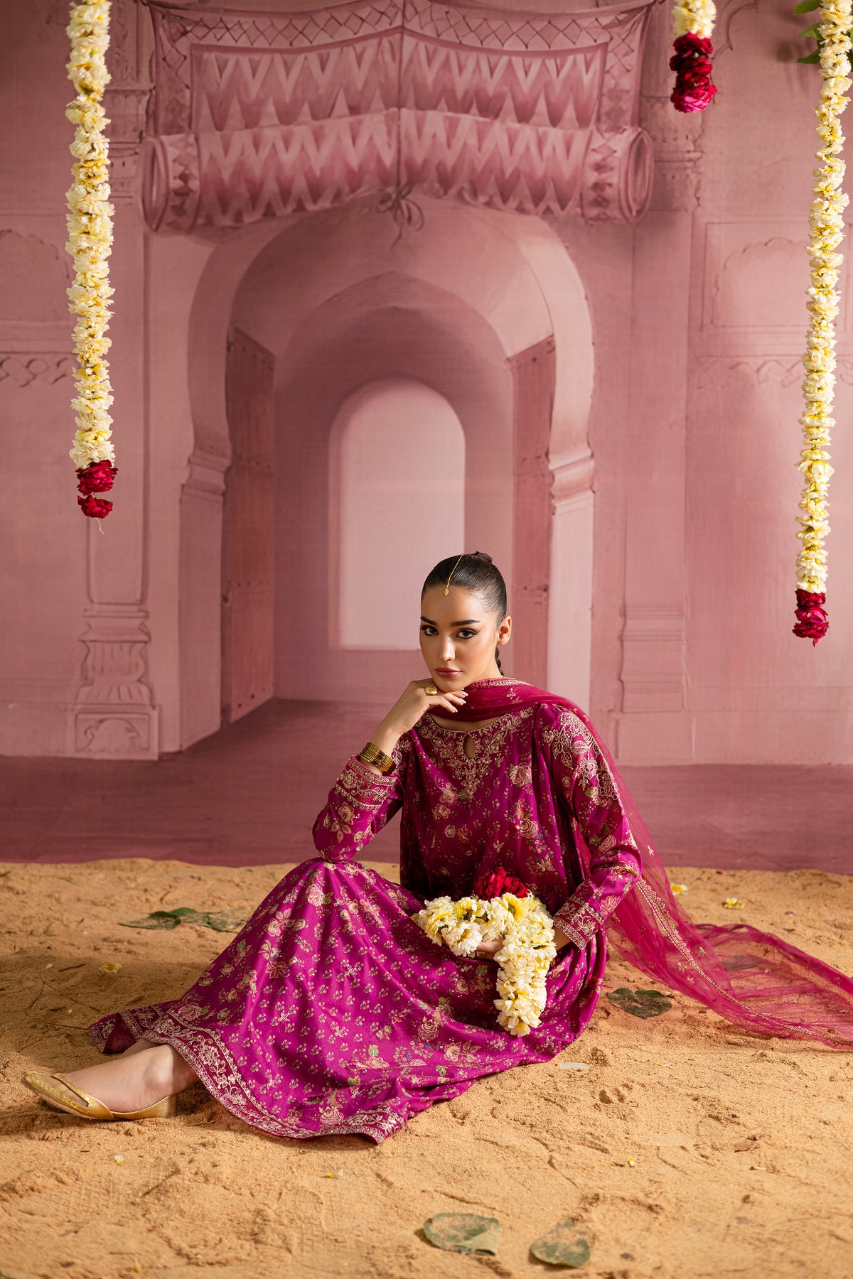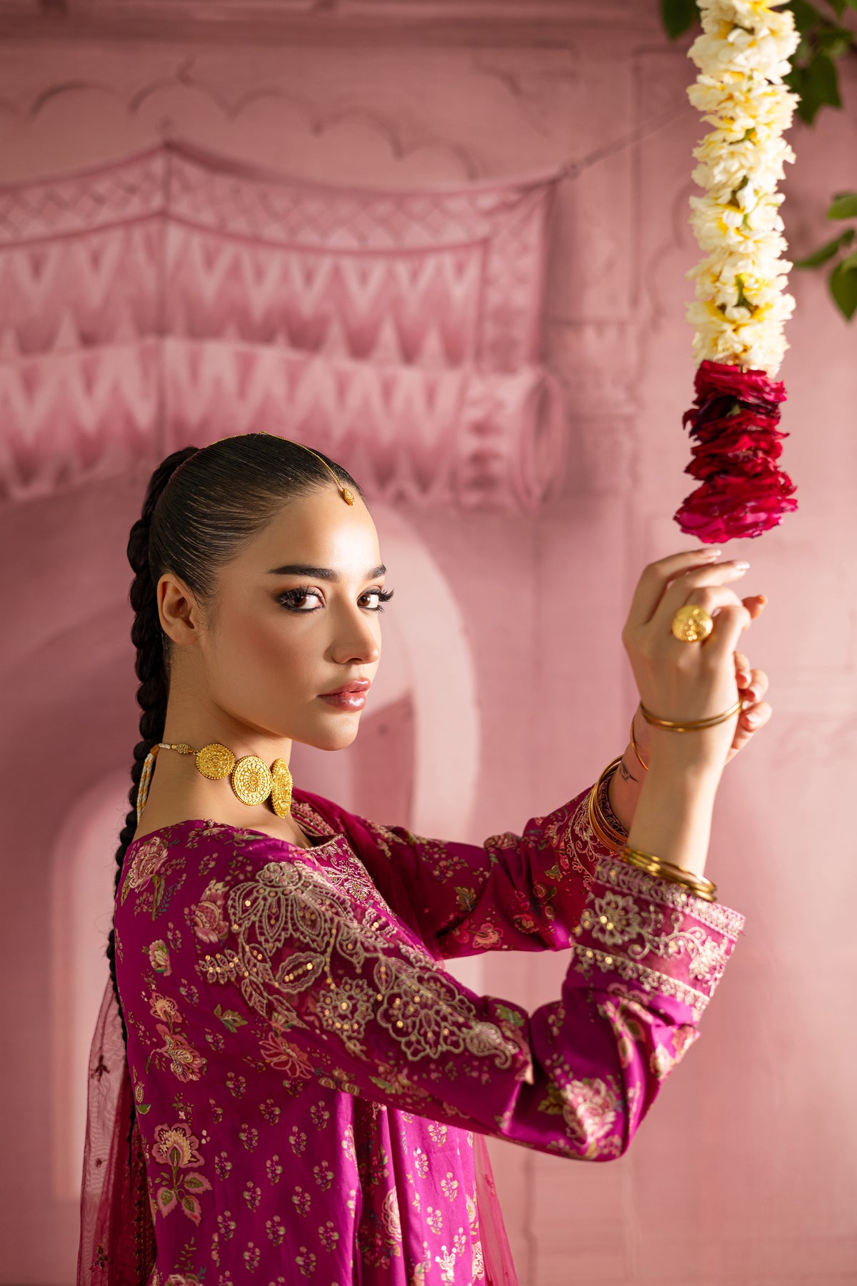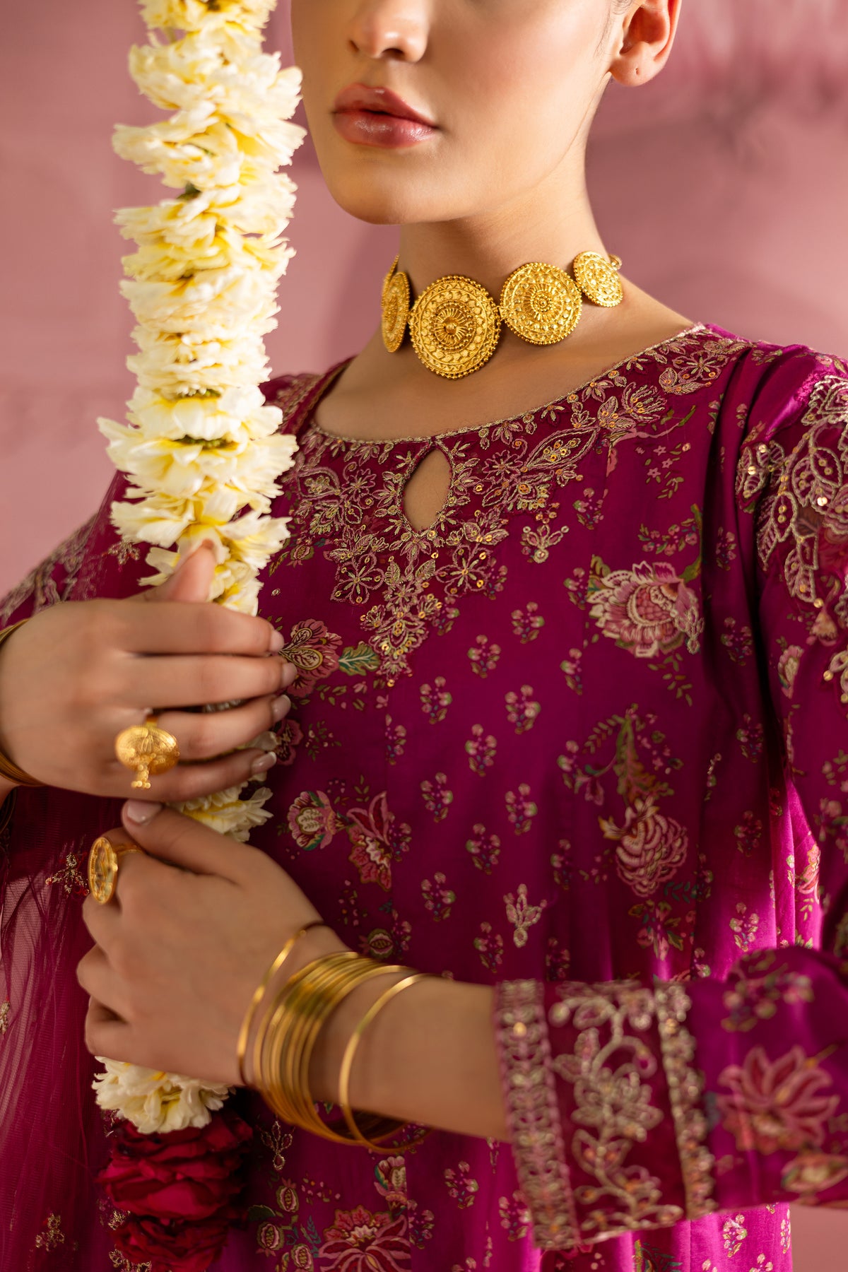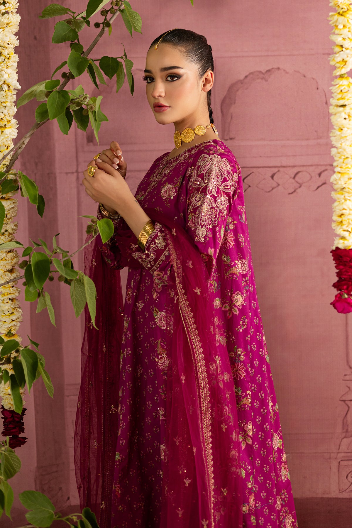 This printed pink pima lawn paneled frock is a stunning fusion of intricate design and festive flair. With delicate embroidery at the neckline and sleeves, it brings an element of timeless elegance, while the bold print adds a modern touch, creating a perfect balance of tradition and style.