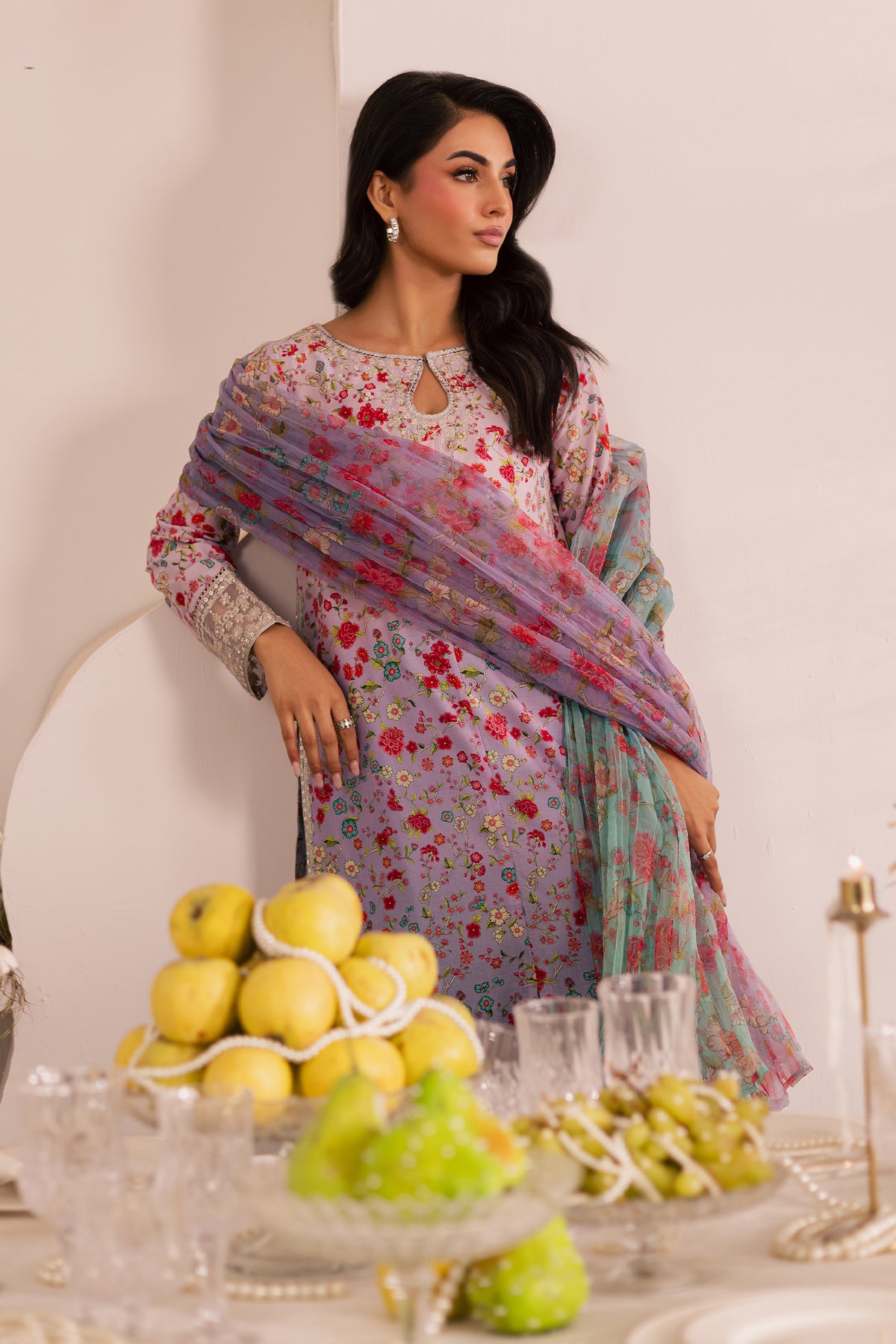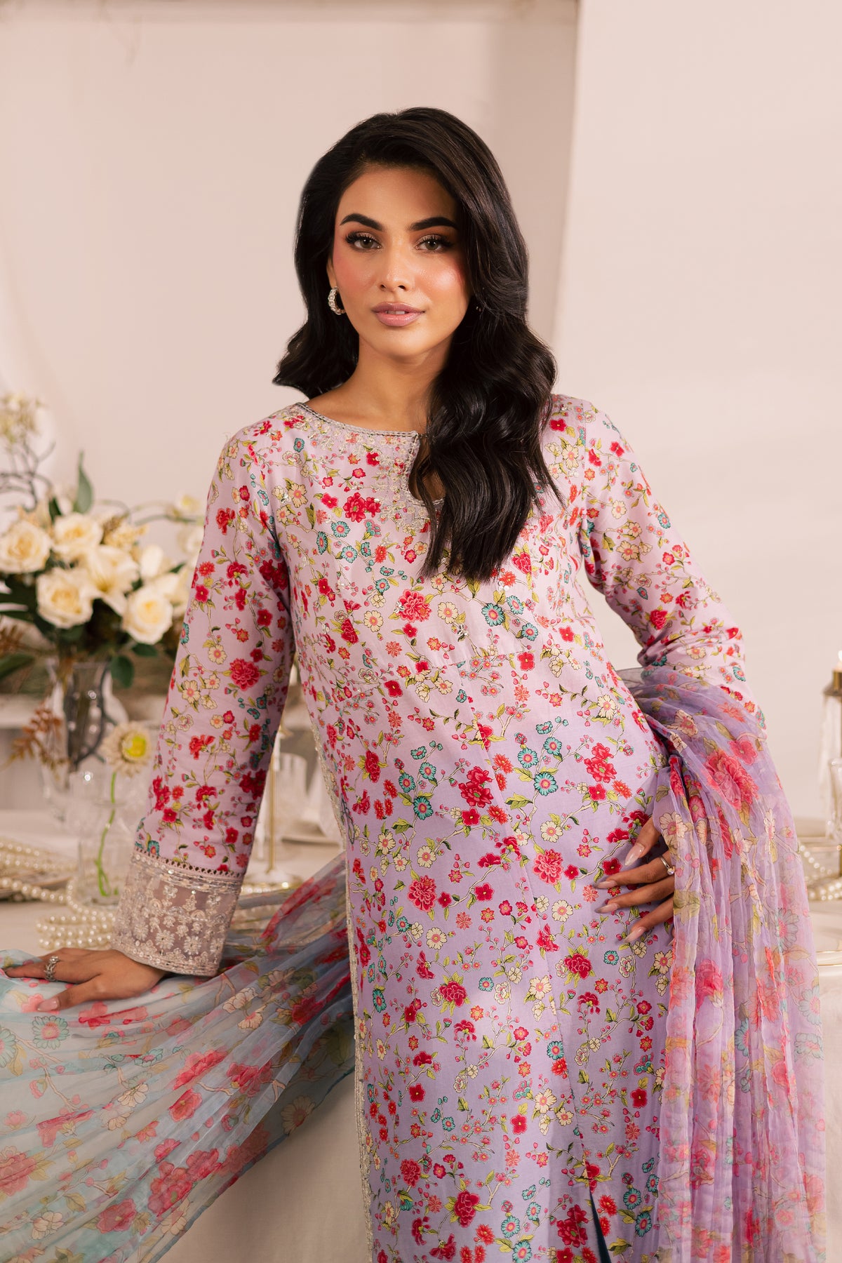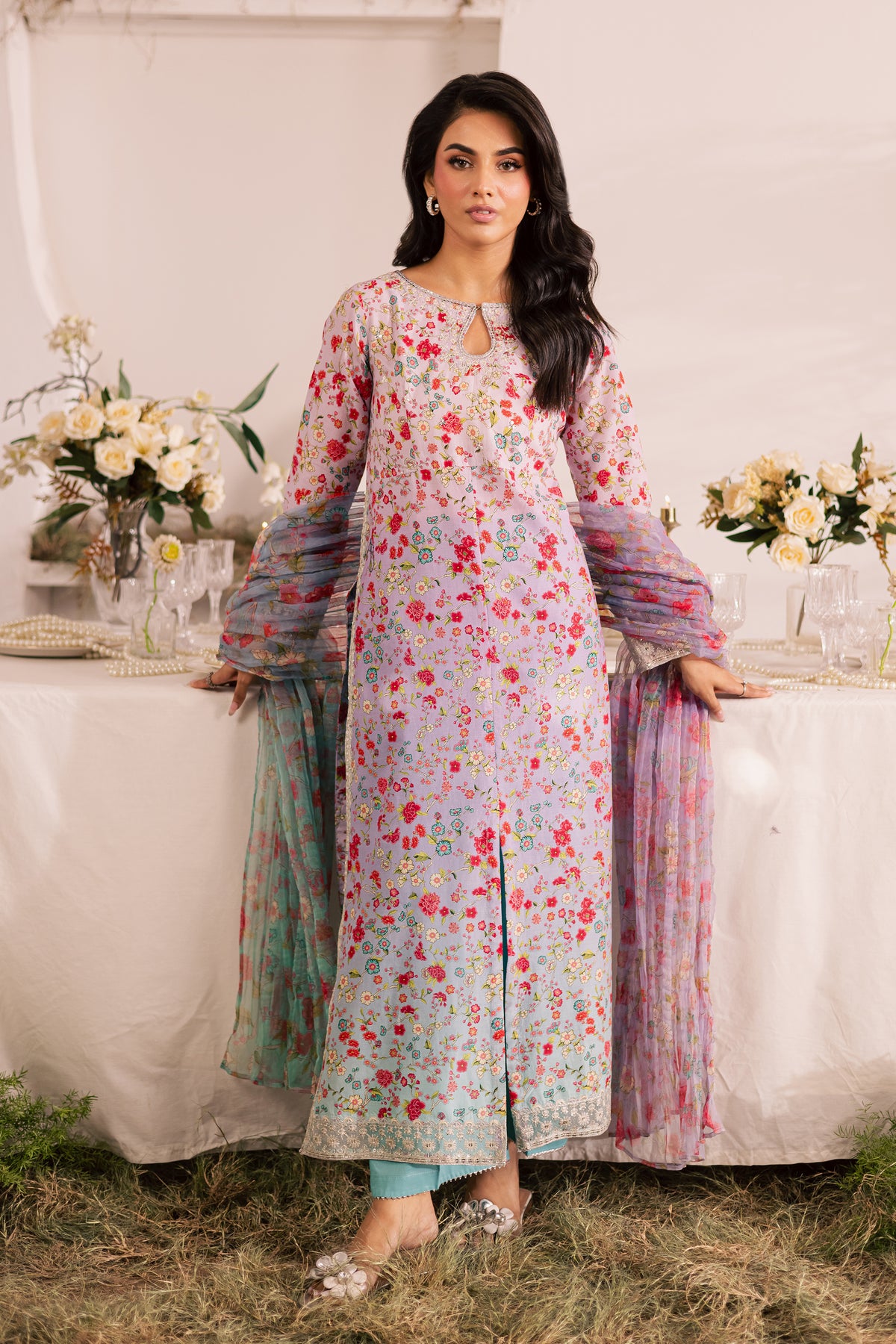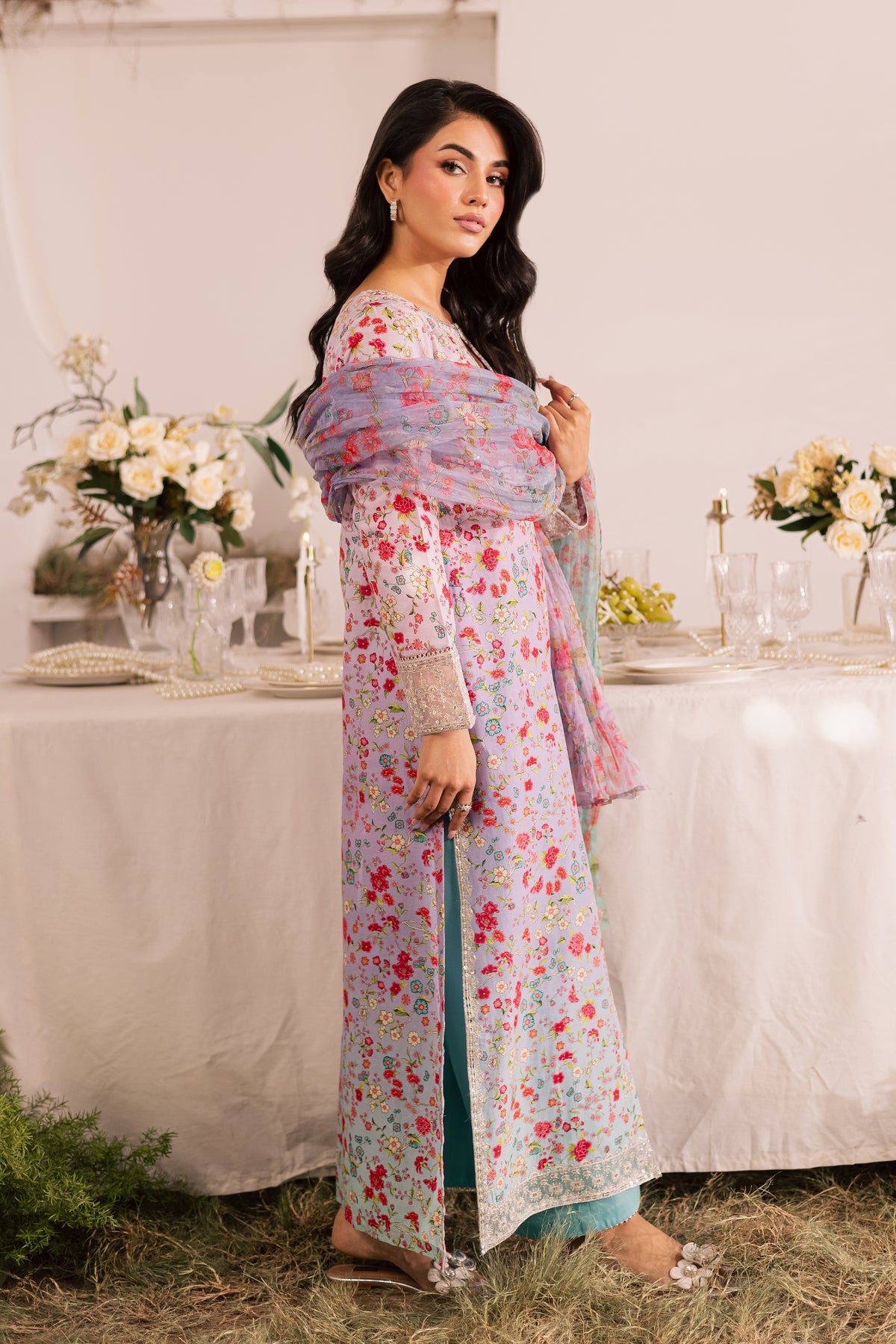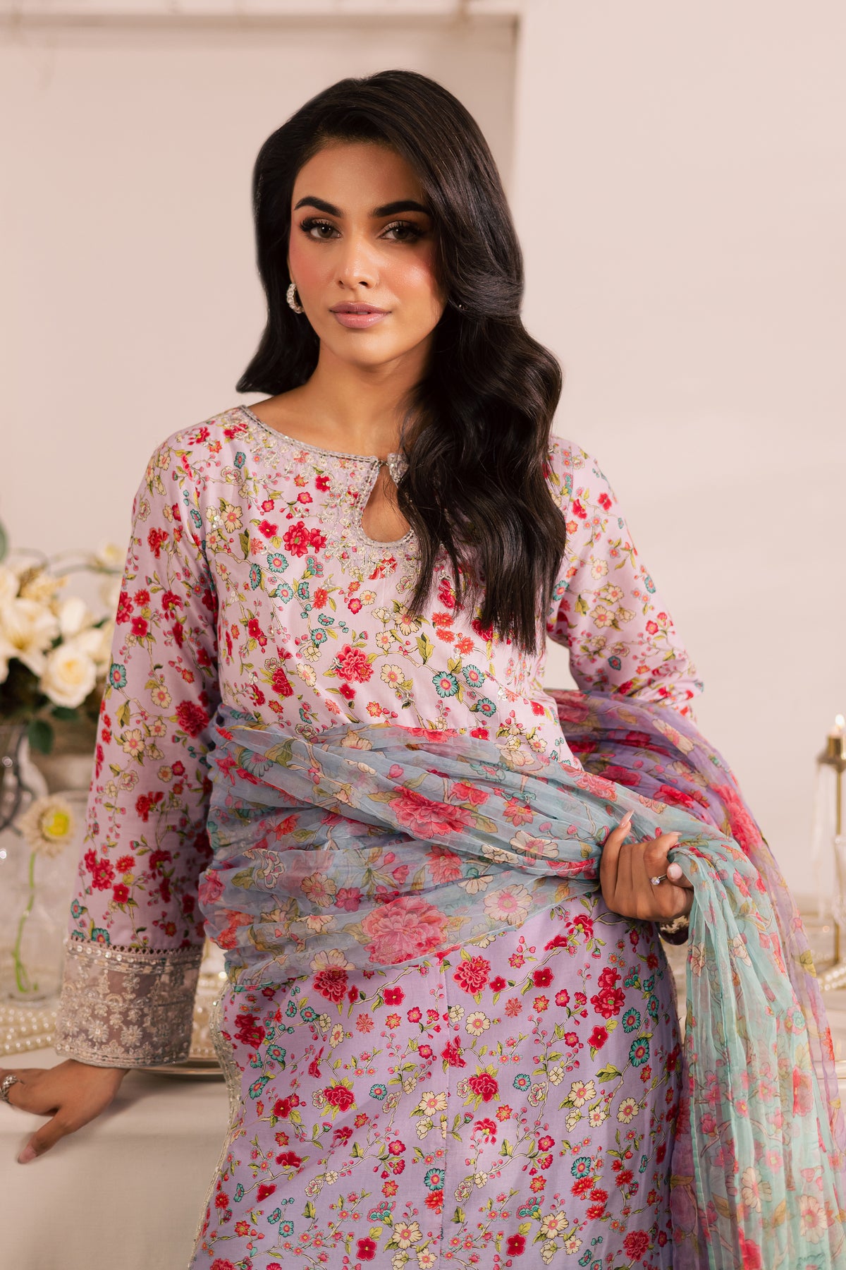 The ensemble is completed with a crushed printed organza dupatta, adding a soft, flowing touch to the look.